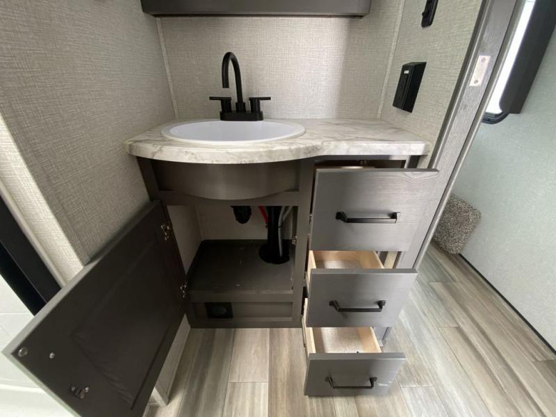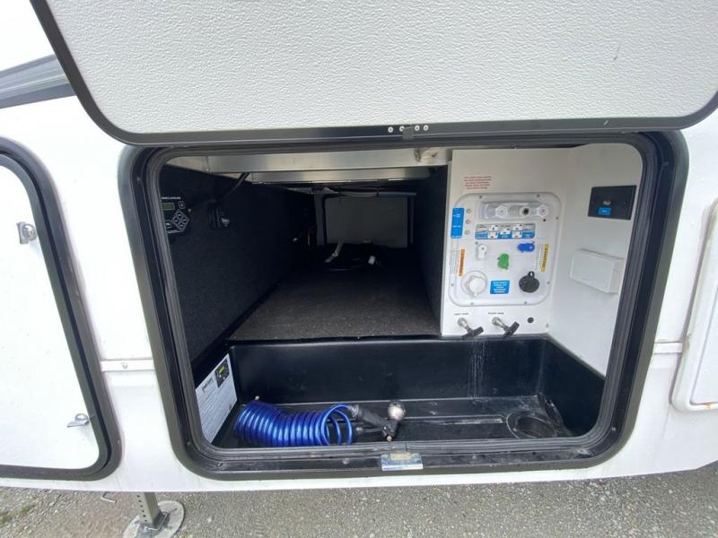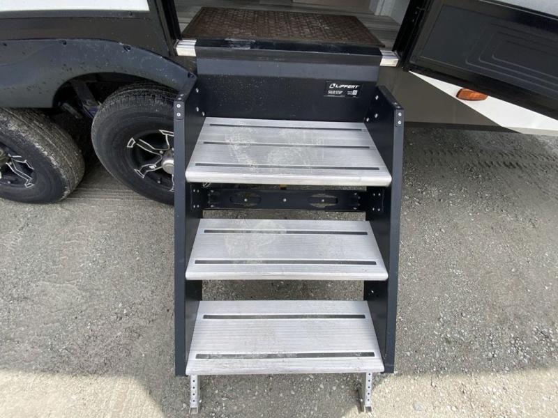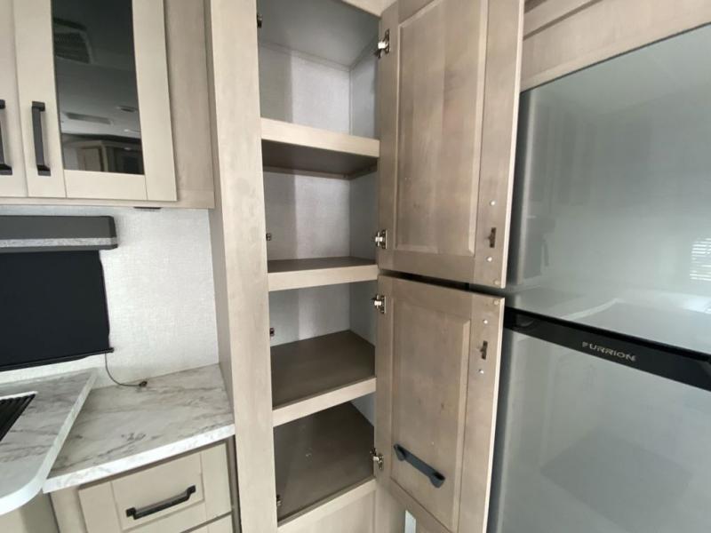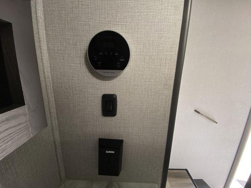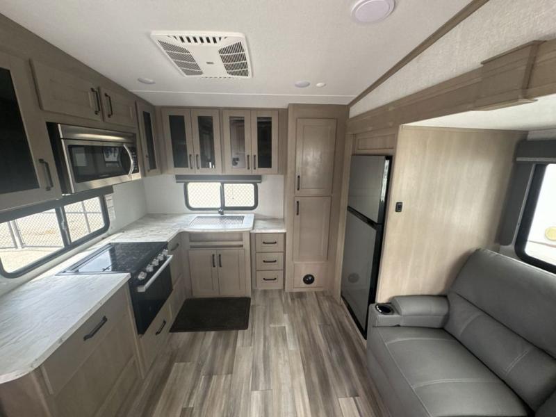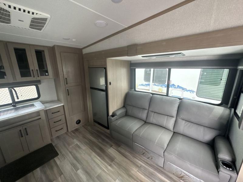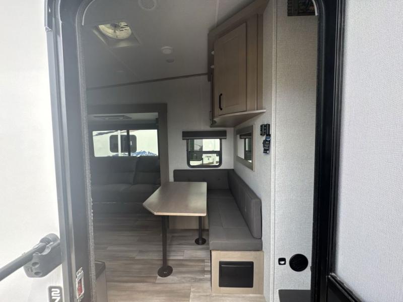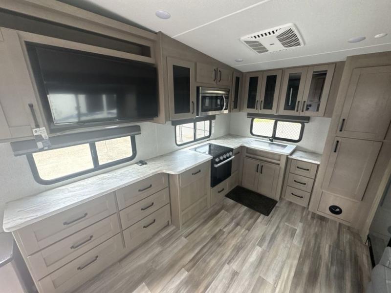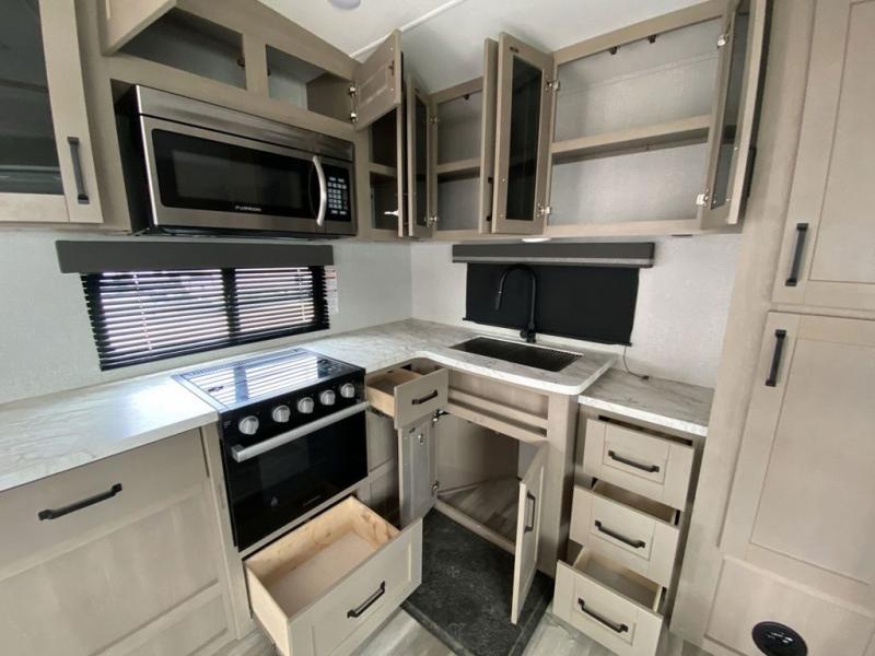 Your short bed truck will love this fifth wheel with swivel pin box and a 90 degree turning radius without a slider hitch. You will love this fifth wheel featuring a single slide for added interior living space and all the comforts and conveniences it provides you while you travel. The slide features a 78" theater seat plus there is a breakfast nook for more seating. Both can easily view the entertainment center with 40" TV. A rear kitchen indoors provides everything you need to create meals like home while on the road, and if you want to spend as much time outside as possible, then the outdoor griddle will certainly accommodate you for meals. Up front, a cozy private bedroom with queen bed, wardrobe, and overhead cabinets. Right next door, you will find a large walk-in shower with skylight for more natural lighting, as well as a toilet, and a vanity with sink and linen cabinet for your towels and toiletries. This unit offers ample storage both inside and out. You will love the full unobstructed pass-through compartment for all of your gear, plus so much more!