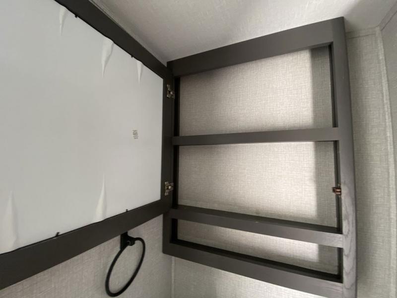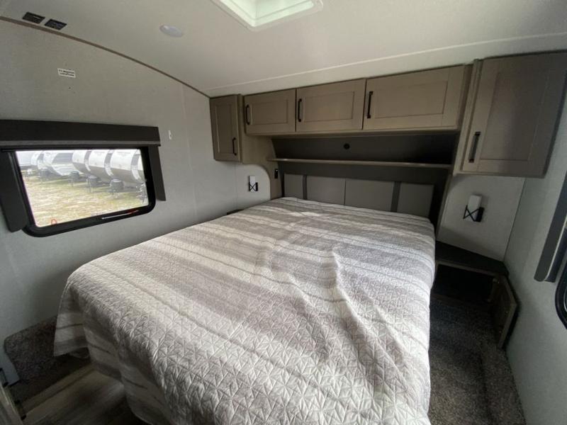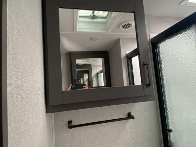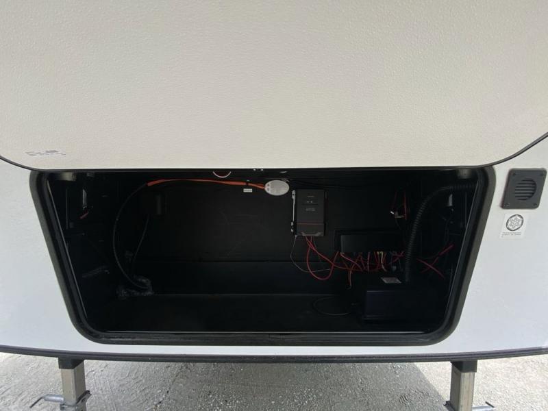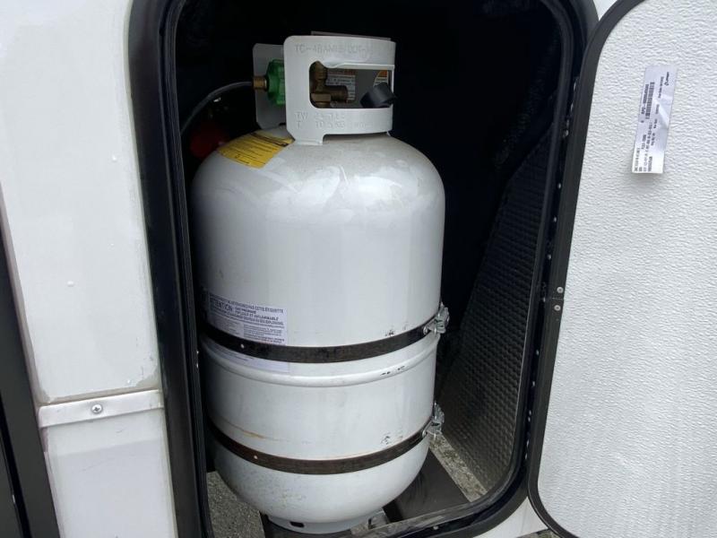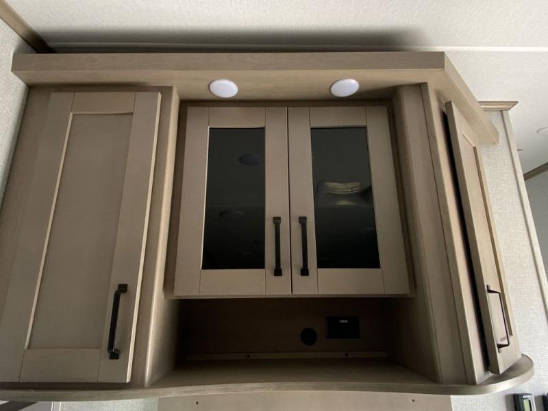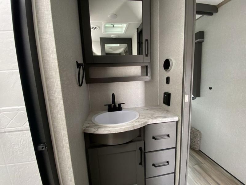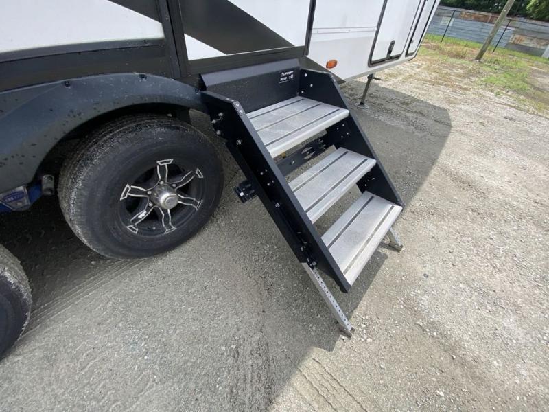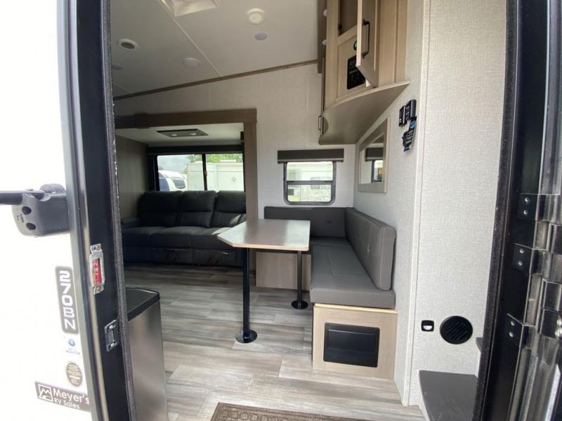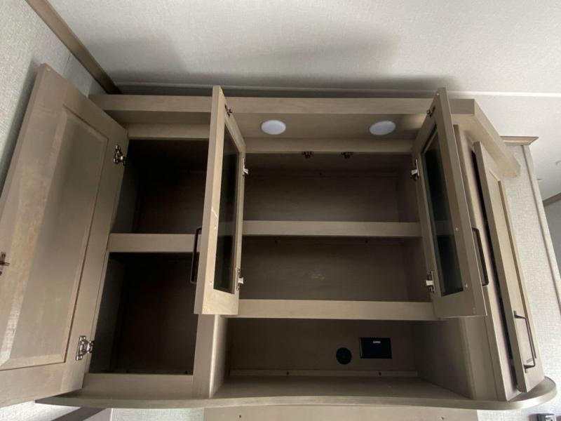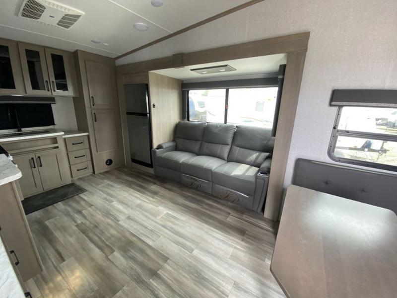 Your short bed truck will love this fifth wheel with swivel pin box and a 90 degree turning radius without a slider hitch. You will love this fifth wheel featuring a single slide for added interior living space and all the comforts and conveniences it provides you while you travel. The slide features a 78" theater seat plus there is a breakfast nook for more seating. Both can easily view the entertainment center with 40" TV. A rear kitchen indoors provides everything you need to create meals like home while on the road, and if you want to spend as much time outside as possible, then the outdoor griddle will certainly accommodate you for meals. Up front, a cozy private bedroom with queen bed, wardrobe, and overhead cabinets. Right next door, you will find a large walk-in shower with skylight for more natural lighting, as well as a toilet, and a vanity with sink and linen cabinet for your towels and toiletries. This unit offers ample storage both inside and out. You will love the full unobstructed pass-through compartment for all of your gear, plus so much more!