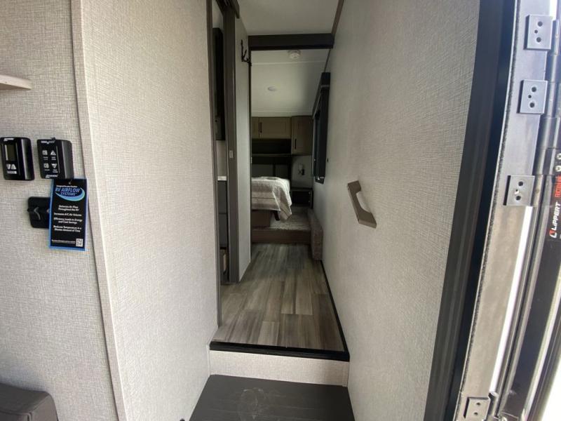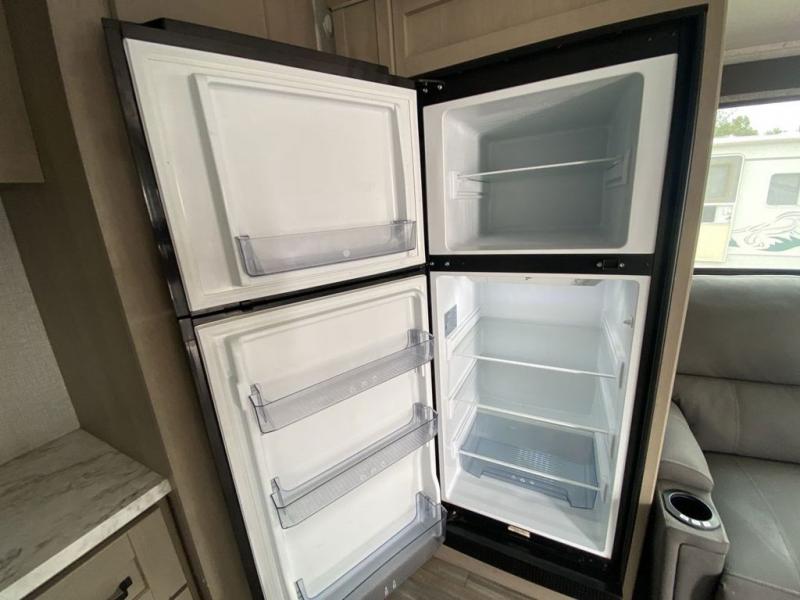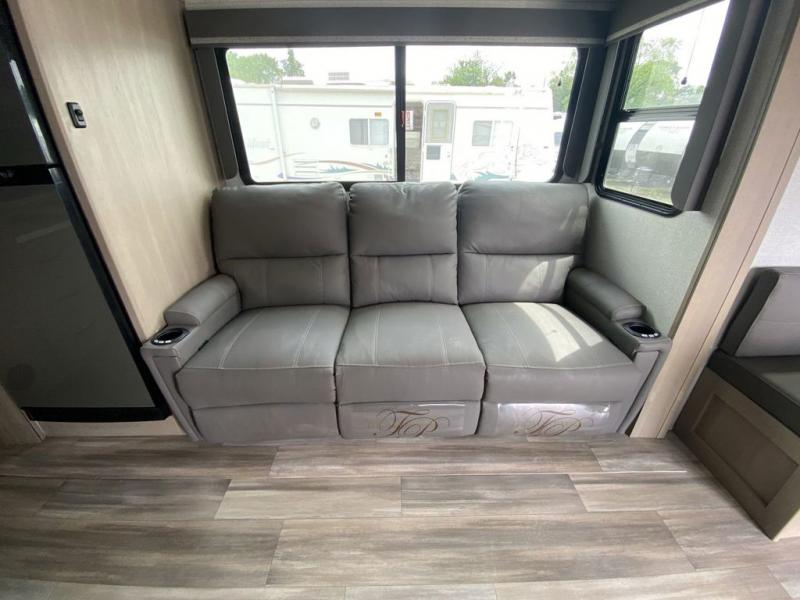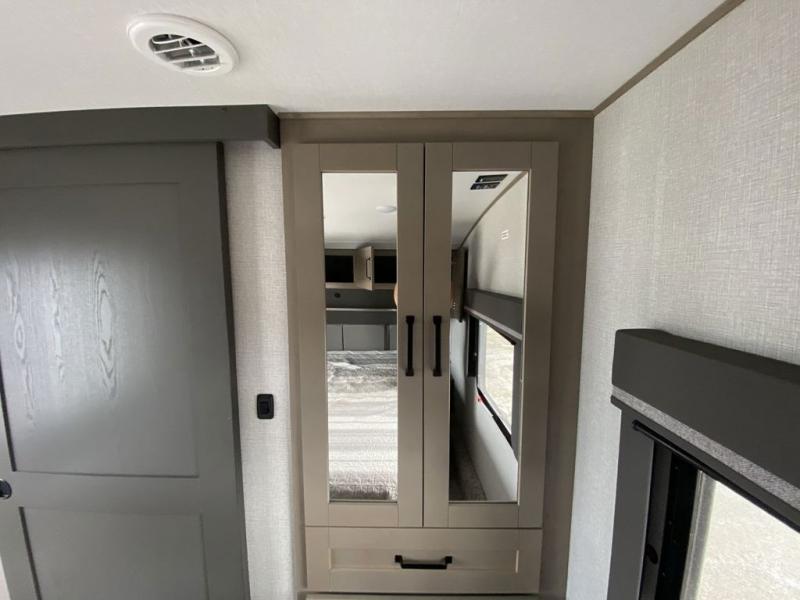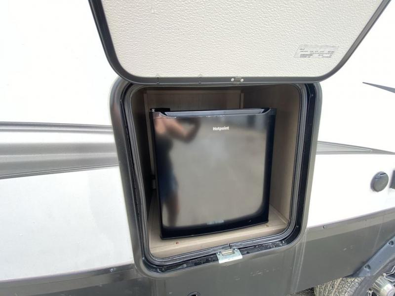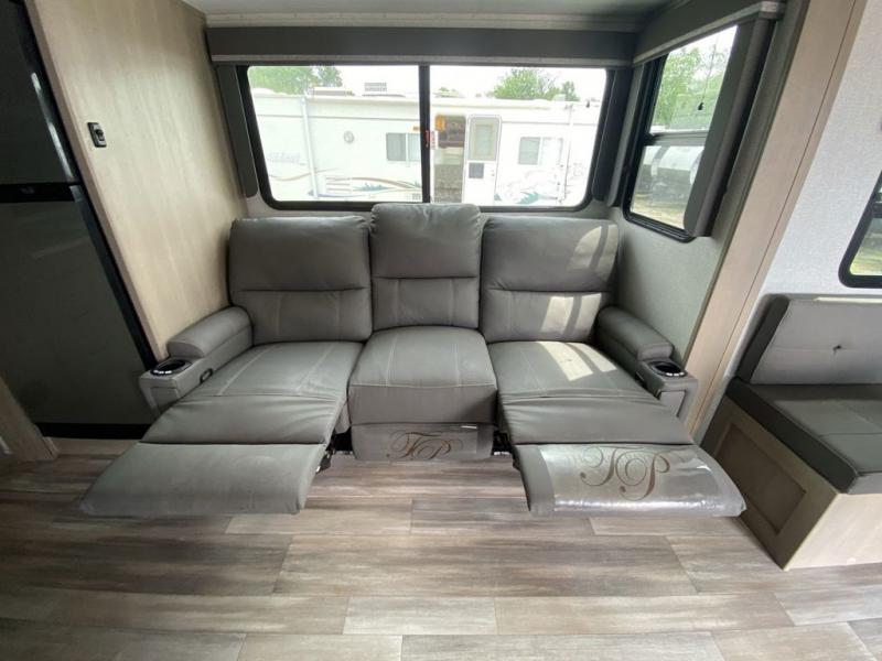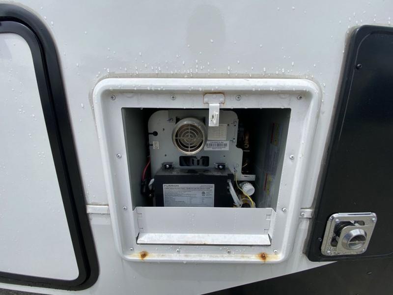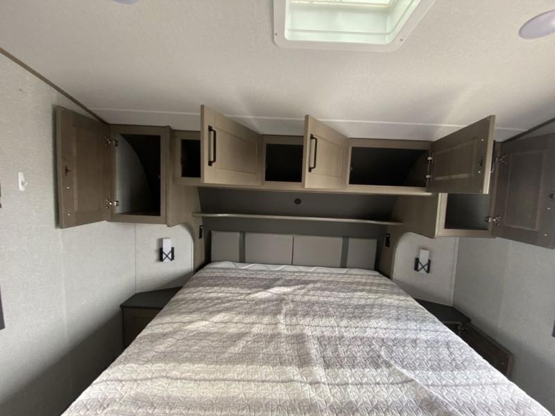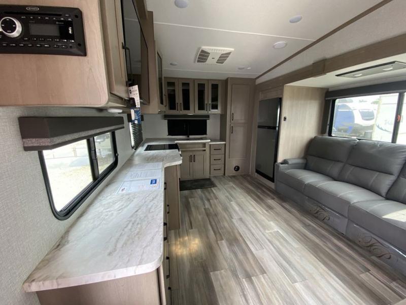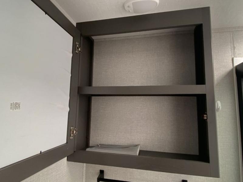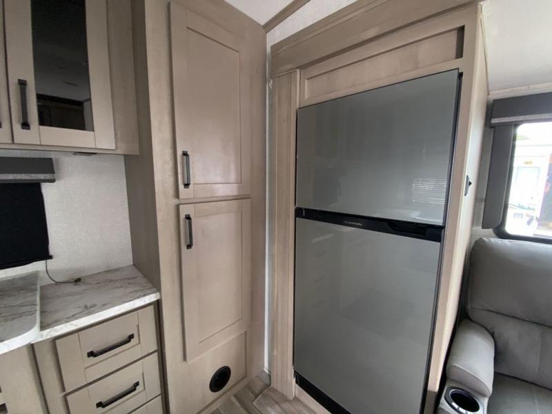 Your short bed truck will love this fifth wheel with swivel pin box and a 90 degree turning radius without a slider hitch. You will love this fifth wheel featuring a single slide for added interior living space and all the comforts and conveniences it provides you while you travel. The slide features a 78" theater seat plus there is a breakfast nook for more seating. Both can easily view the entertainment center with 40" TV. A rear kitchen indoors provides everything you need to create meals like home while on the road, and if you want to spend as much time outside as possible, then the outdoor griddle will certainly accommodate you for meals. Up front, a cozy private bedroom with queen bed, wardrobe, and overhead cabinets. Right next door, you will find a large walk-in shower with skylight for more natural lighting, as well as a toilet, and a vanity with sink and linen cabinet for your towels and toiletries. This unit offers ample storage both inside and out. You will love the full unobstructed pass-through compartment for all of your gear, plus so much more!