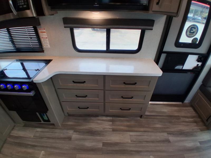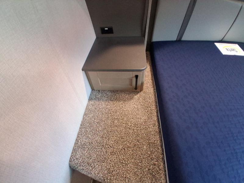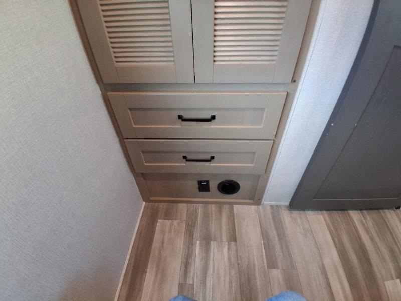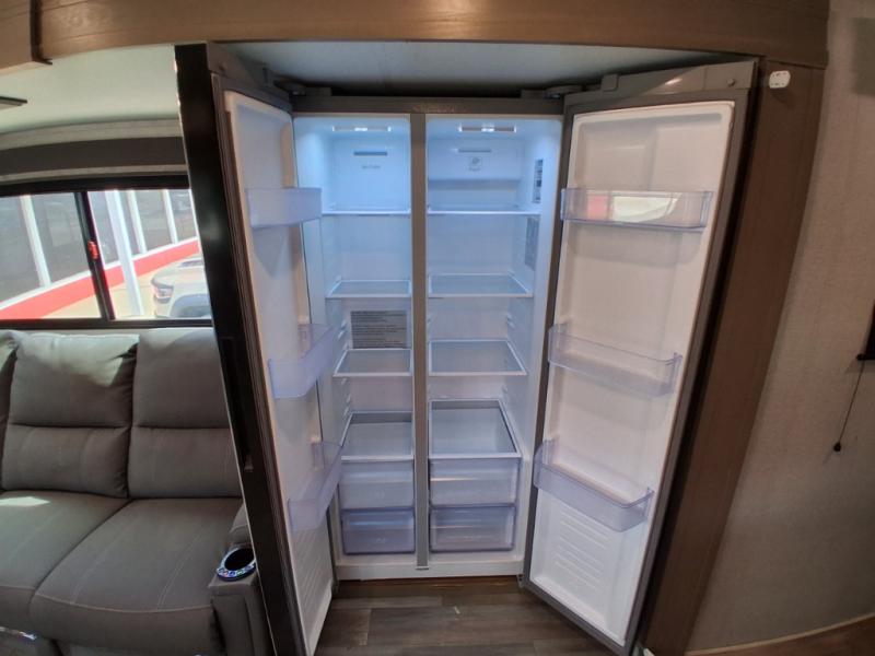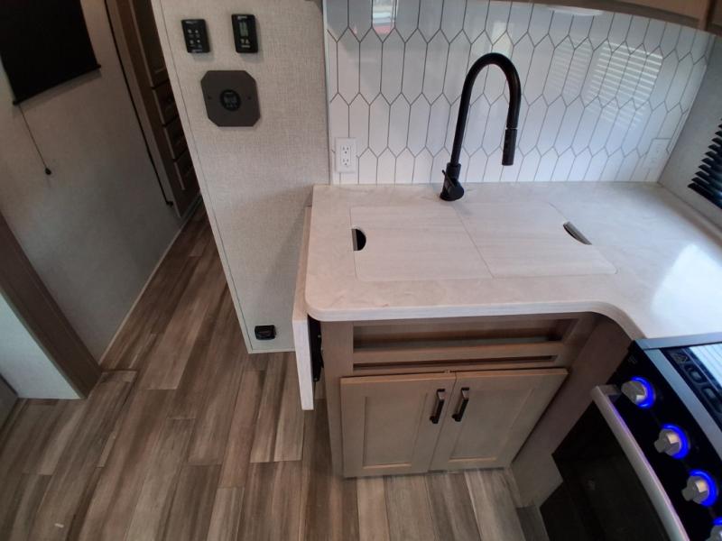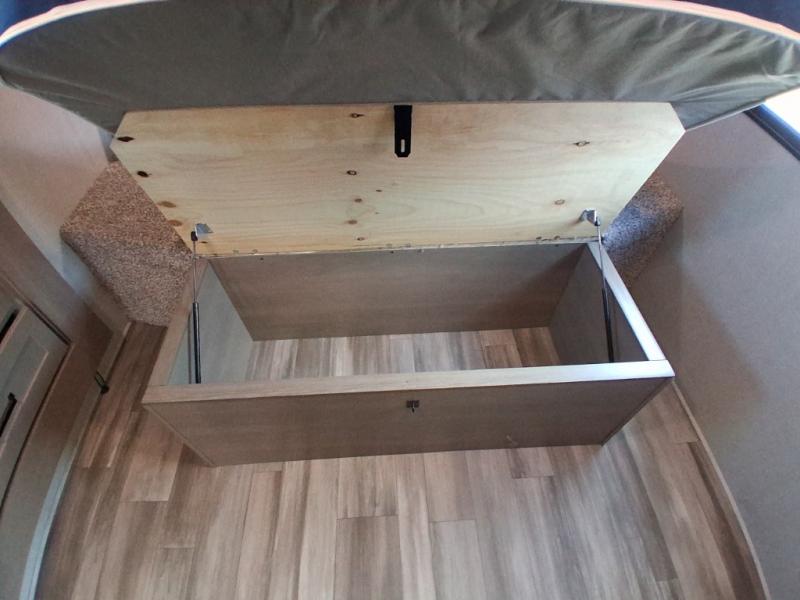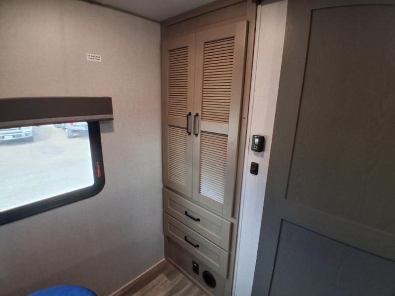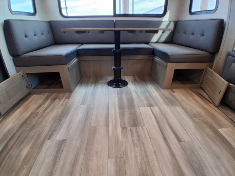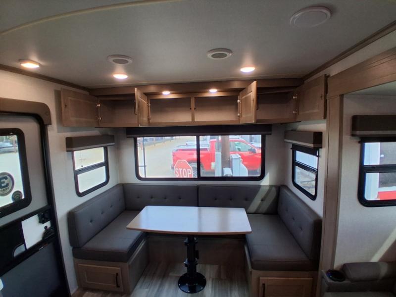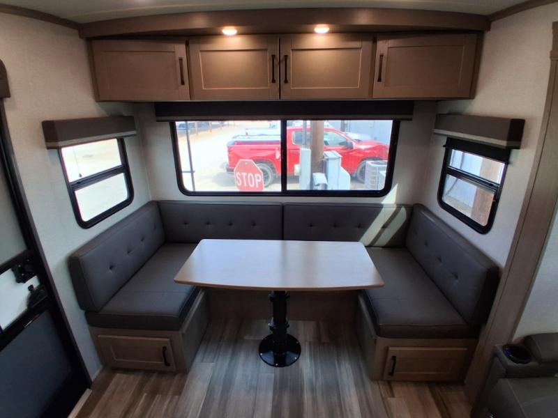 Pack your bags and head out on a comfortable camping trip in this travel trailer! It features a front private bedroom with a queen bed, a set of drawers with an area prepped to add an optional washer and dryer, and a slide that houses a linen closet, a bench, and a wardrobe all with drawers below them. The full bathroom has a shower with a skylight and a linen closet to keep your towels close. The chef can prepare their best home cooked meals with the three burner cooktop, 16 cu. ft. refrigerator, and flip-up countertop extension. Relax on the sofa or the rear U-shaped lounge while you watch a movie with the 40" LED TV at the entertainment center!