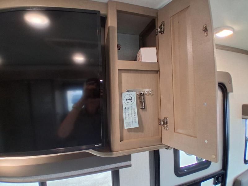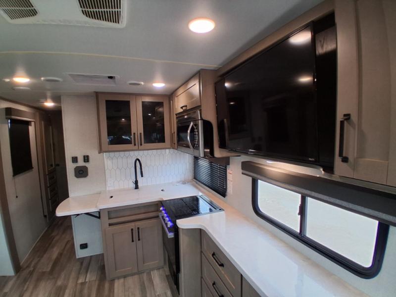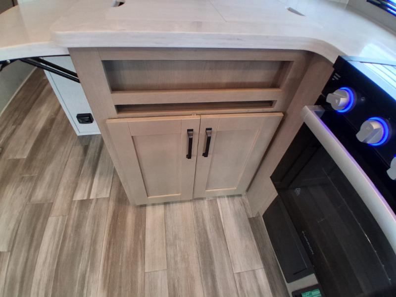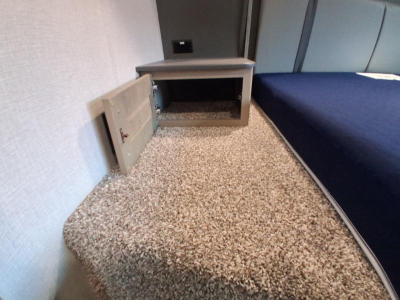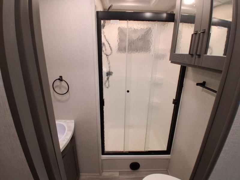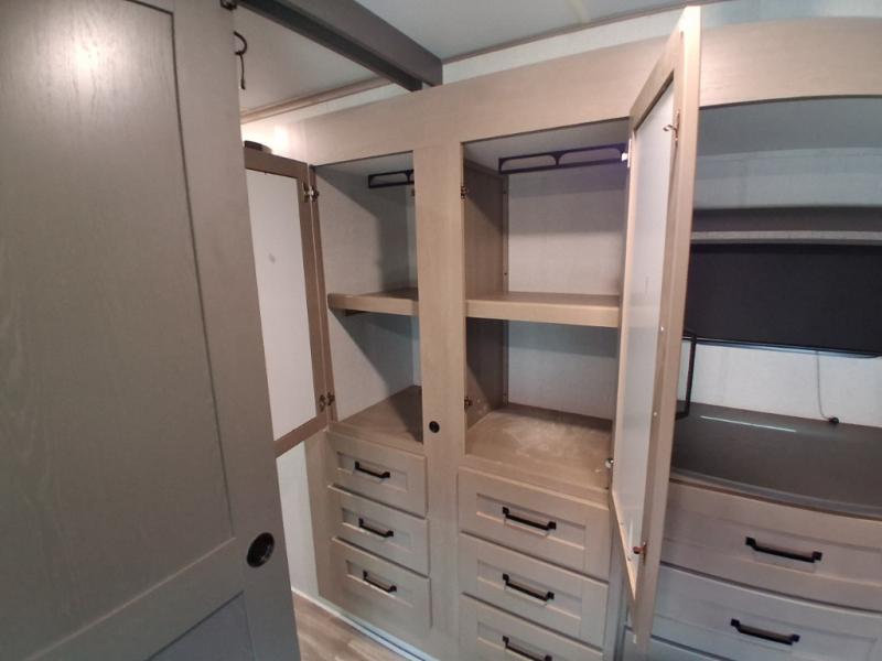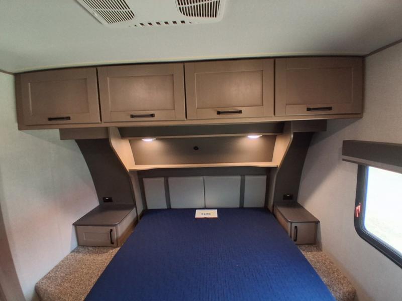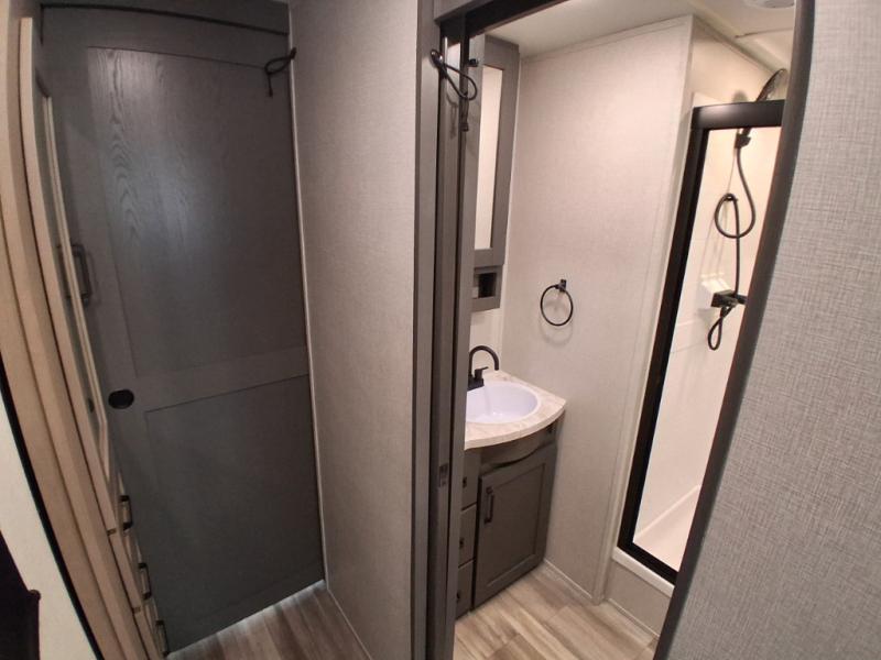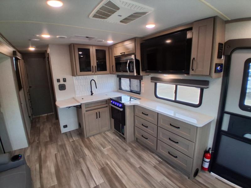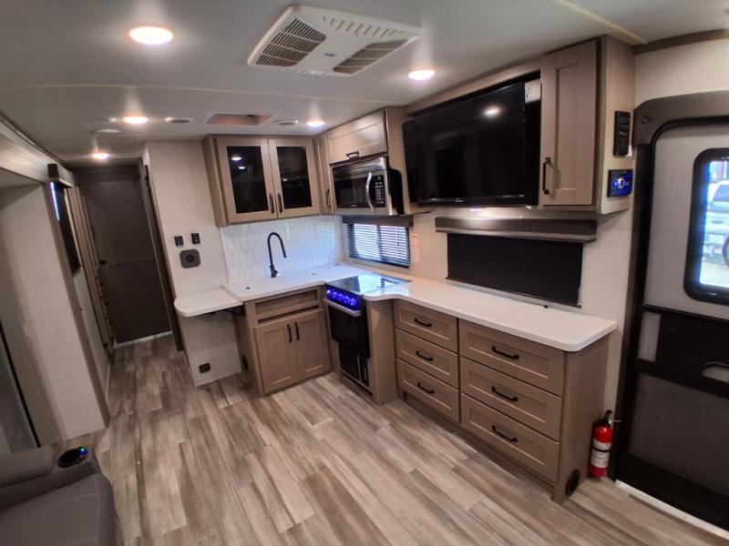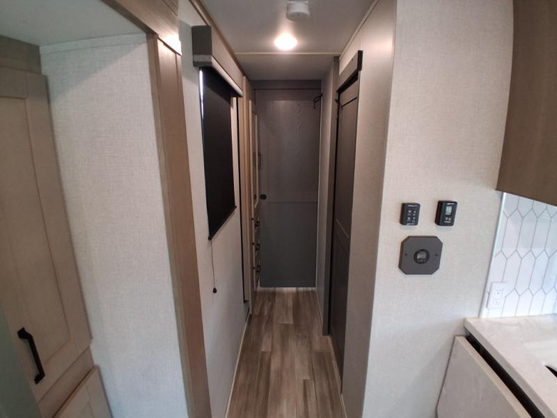 Pack your bags and head out on a comfortable camping trip in this travel trailer! It features a front private bedroom with a queen bed, a set of drawers with an area prepped to add an optional washer and dryer, and a slide that houses a linen closet, a bench, and a wardrobe all with drawers below them. The full bathroom has a shower with a skylight and a linen closet to keep your towels close. The chef can prepare their best home cooked meals with the three burner cooktop, 16 cu. ft. refrigerator, and flip-up countertop extension. Relax on the sofa or the rear U-shaped lounge while you watch a movie with the 40" LED TV at the entertainment center!