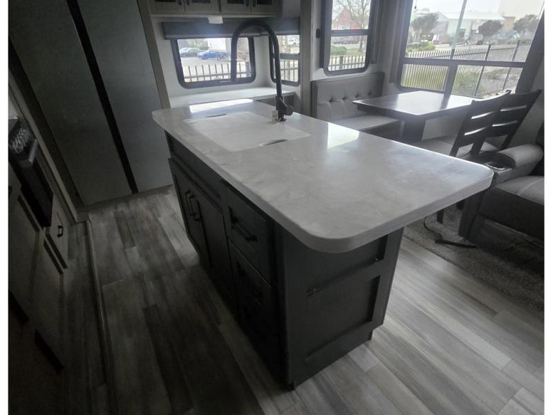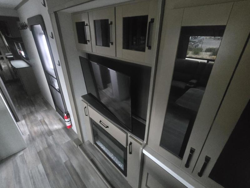 Enjoy a home away from home with this travel trailer! The chef will enjoy cooking either indoors in the rear kitchen with the kitchen island, hutch, and three burner cooktop, or outdoors with the outside griddle and outside 1.6 cu. ft. refrigerator to drink a cold beverage while grilling burgers. If mother nature rains on your parade then you can head indoors and either play games at the booth dinette or relax on the theater seating across from the entertainment center with a 40" TV and fireplace. Rinse the sand out of your hair in the full bathroom with the 30" x 36" shower with skylight then head to the front private bedroom and lay down on the queen bed slide which can be replace for an optional king bed. Keep your clothes clean with the prepped washer and dryer area and watch the big game outdoors with the coax TV hookup!