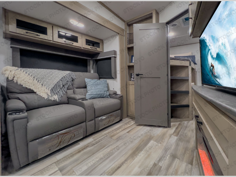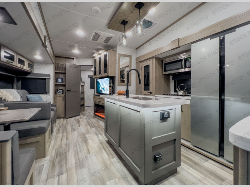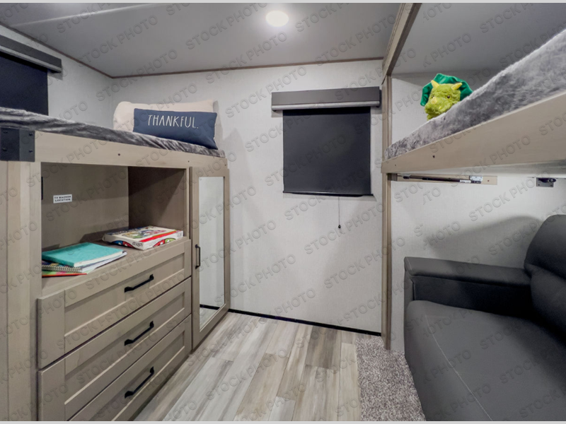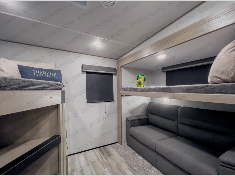 Are you looking to travel with your family and friends and want enough space for everyone to be comfortable? Step inside using the AXIStep, to find a private bunkhouse in the rear of this fifth wheel which offers a slide out flip bunk above a tri-fold sofa, a bunk bed and storage on the opposite side, its very own private half bathroom. The theater seating or tri-fold sofa option is a great place to unwind at night in front of the entertainment center with a 40" LED HDTV and fireplace below it. There is a booth dinette or you can choose a free standing dinette option to dine at, and the kitchen island will provide more counter space to prep meals. You will find full amenities including a 16 cu. ft. 12V refrigerator and a hutch. This fifth wheel also includes a double entry bathroom with a radius shower with a skylight, and you can wake up refreshed each morning after sleeping on your own queen bed.