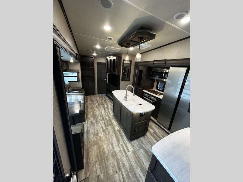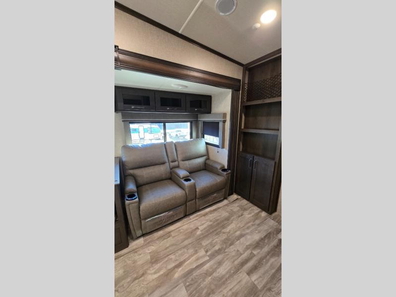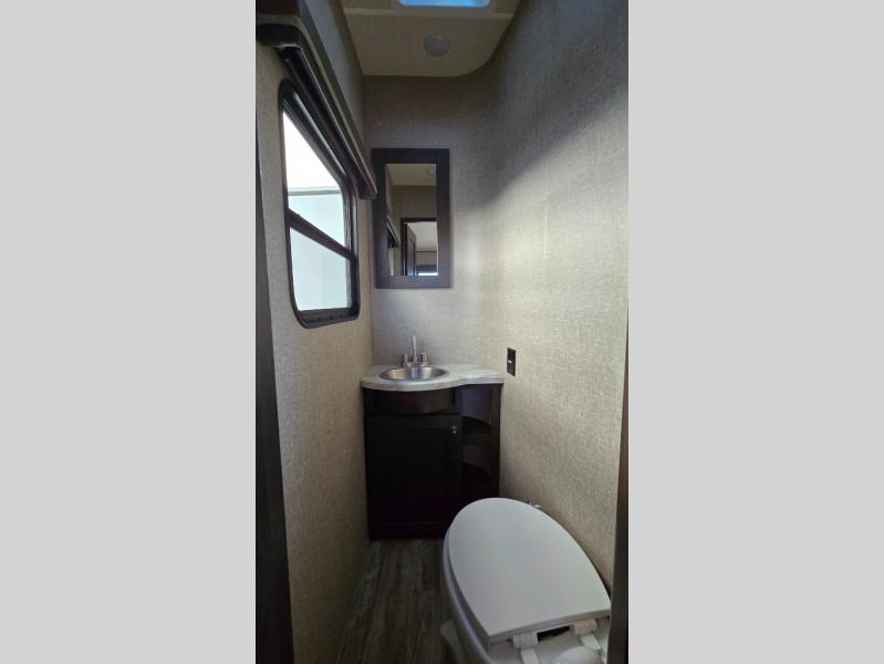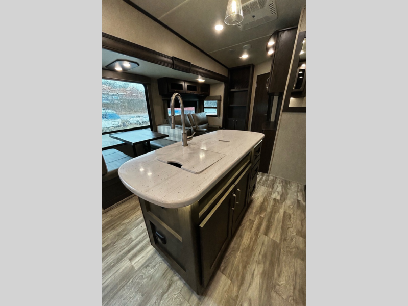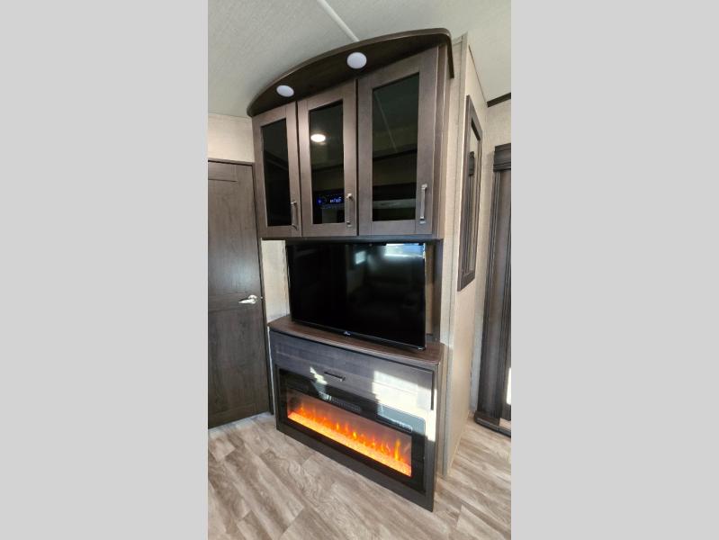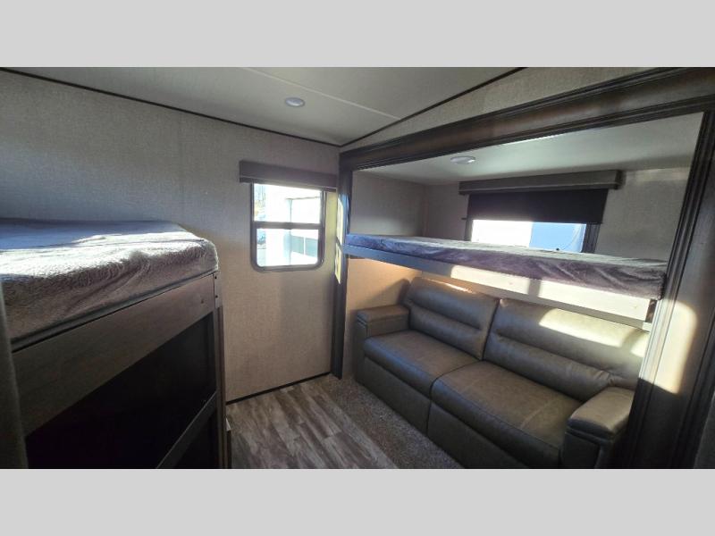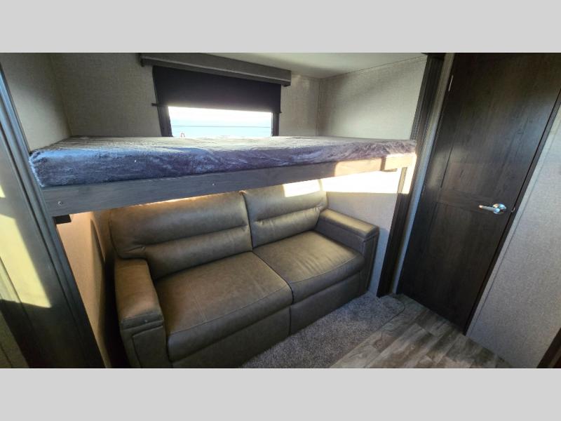Are you looking to travel with your family and friends and want enough space for everyone to be comfortable? Step inside using the AXIStep, to find a private bunkhouse in the rear of this fifth wheel which offers a slide out flip bunk above a tri-fold sofa, a bunk bed and storage on the opposite side, its very own private half bathroom. The theater seating or tri-fold sofa option is a great place to unwind at night in front of the entertainment center with a 40" LED HDTV and fireplace below it. There is a booth dinette or you can choose a free standing dinette option to dine at, and the kitchen island will provide more counter space to prep meals. You will find full amenities including a 16 cu. ft. 12V refrigerator and a hutch. This fifth wheel also includes a double entry bathroom with a radius shower with a skylight, and you can wake up refreshed each morning after sleeping on your own queen bed.