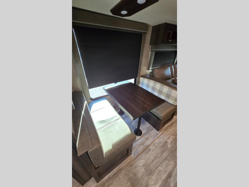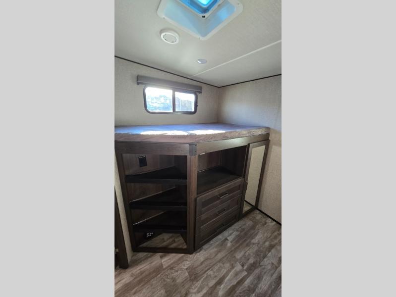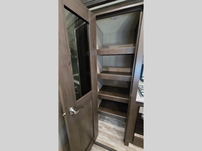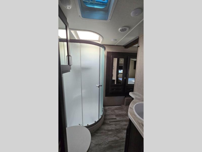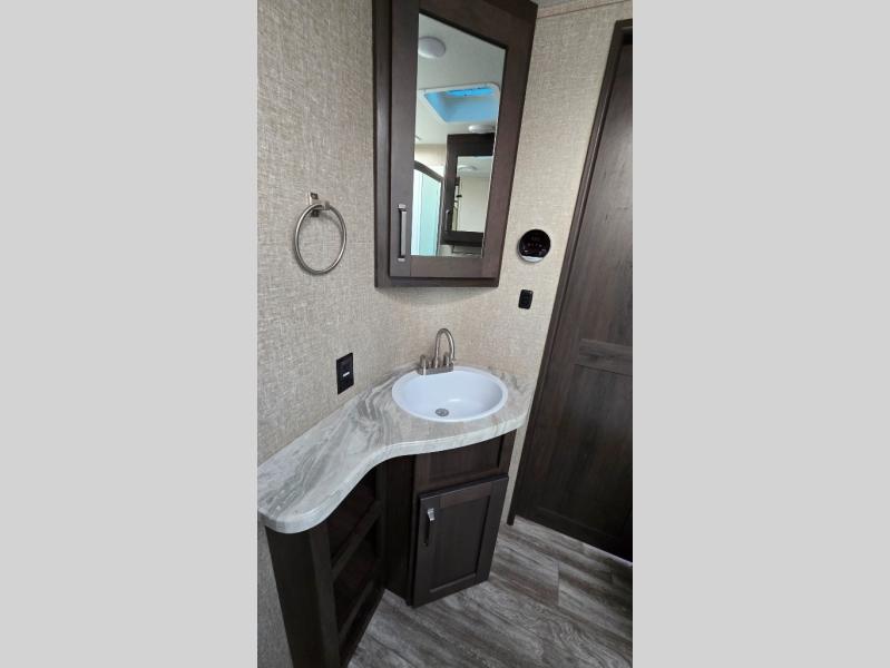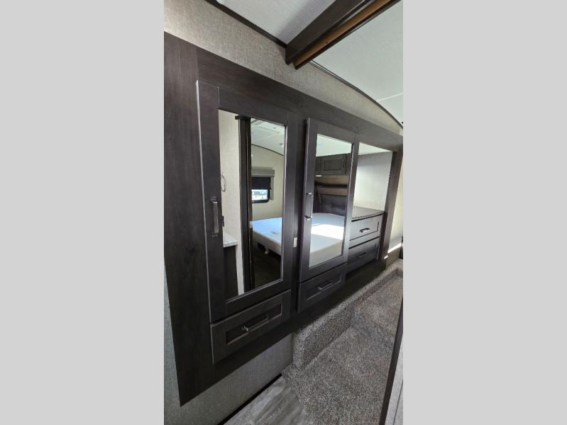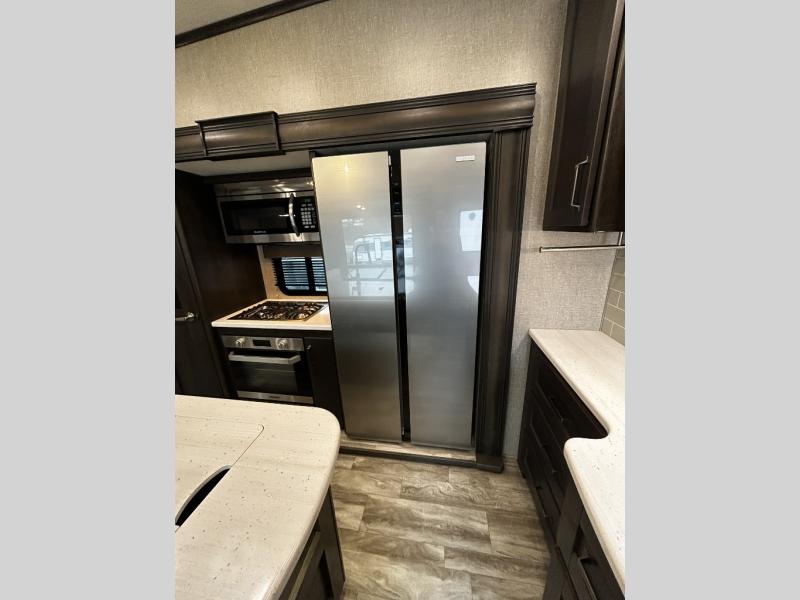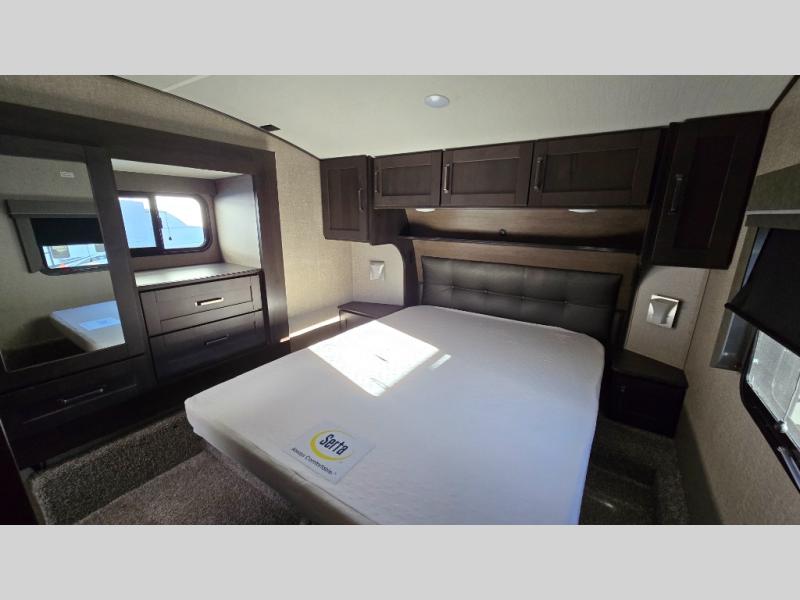 Are you looking to travel with your family and friends and want enough space for everyone to be comfortable? Step inside using the AXIStep, to find a private bunkhouse in the rear of this fifth wheel which offers a slide out flip bunk above a tri-fold sofa, a bunk bed and storage on the opposite side, its very own private half bathroom. The theater seating or tri-fold sofa option is a great place to unwind at night in front of the entertainment center with a 40" LED HDTV and fireplace below it. There is a booth dinette or you can choose a free standing dinette option to dine at, and the kitchen island will provide more counter space to prep meals. You will find full amenities including a 16 cu. ft. 12V refrigerator and a hutch. This fifth wheel also includes a double entry bathroom with a radius shower with a skylight, and you can wake up refreshed each morning after sleeping on your own queen bed.