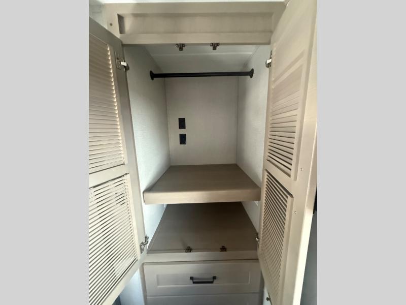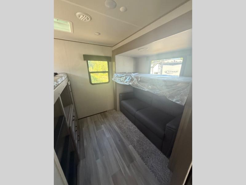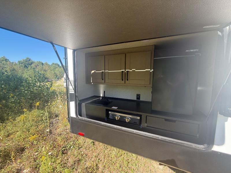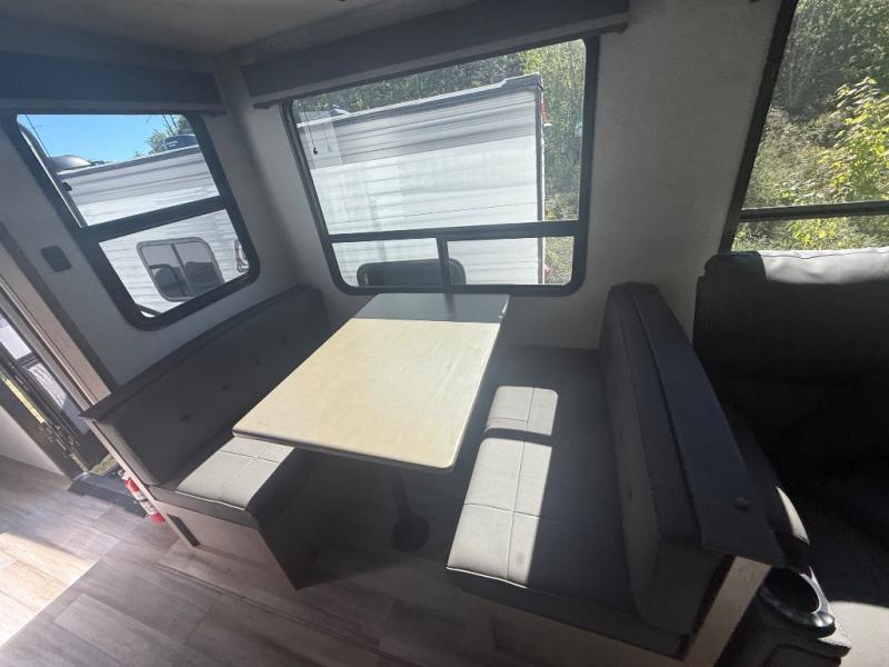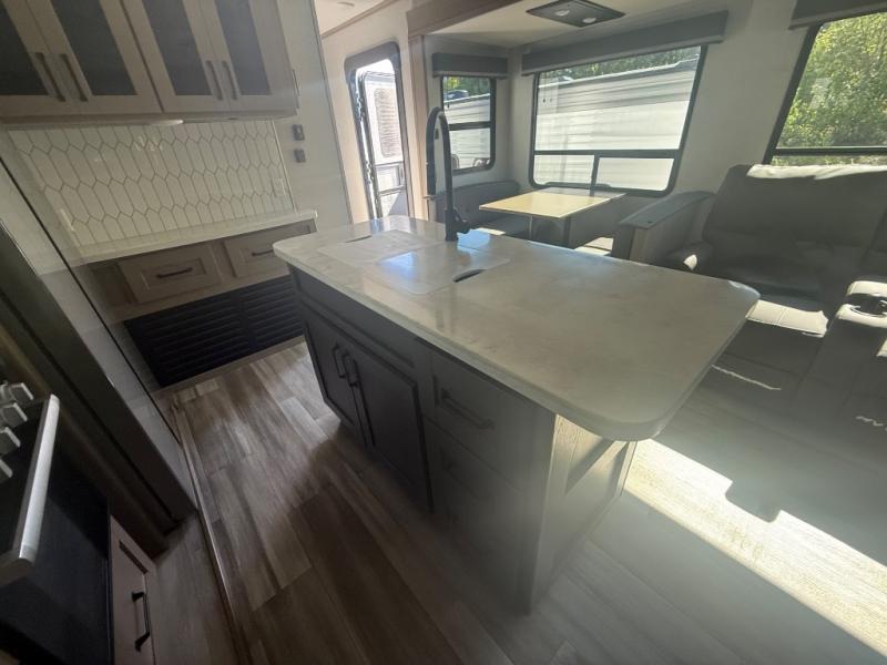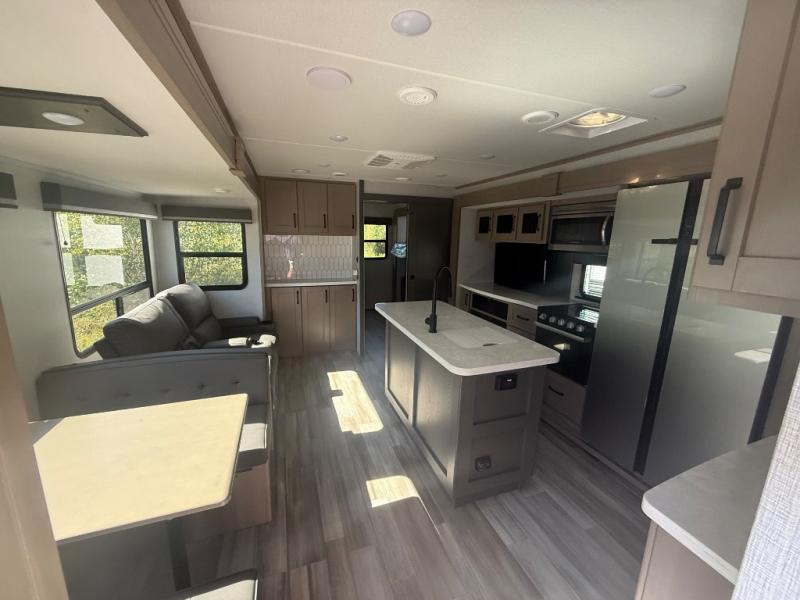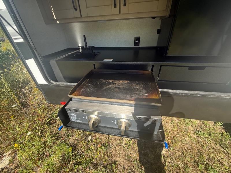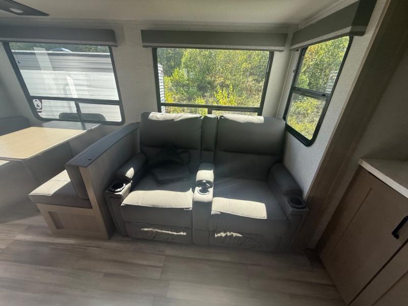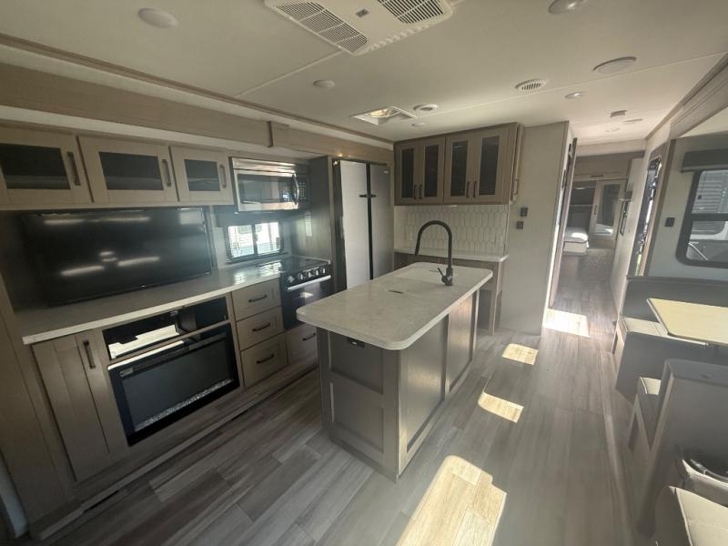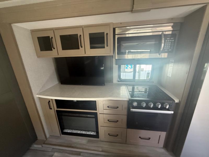 Finding the perfect trailer for a larger group is simple, take a look at this one for your next RV! The rear bunkhouse might be the first reason you fall in love because of the slide out with a flip bunk above a tri-fold sofa, the second bunk bed on the opposite side and storage below, and the large rear window for great views. The outside kitchen might be another reason allowing you to enjoy the outdoors while providing meals for everyone, and/or the inside gourmet kitchen with a 16 cu. ft. refrigerator, an island, and two hutches. Everyone can gather together and relax on the theatre seating with cupholders and the booth dinette or choose a free standing dinette option, and to visit or watch the 40" LED HDTV with fireplace below. The full bathroom includes a space savings sliding door and linen storage, and the bedroom gives you a front walk-around queen bed with storage for your clothes on each side, plus there is an additional wardrobe with drawers and the option to add a washer/dryer to the prepped space.