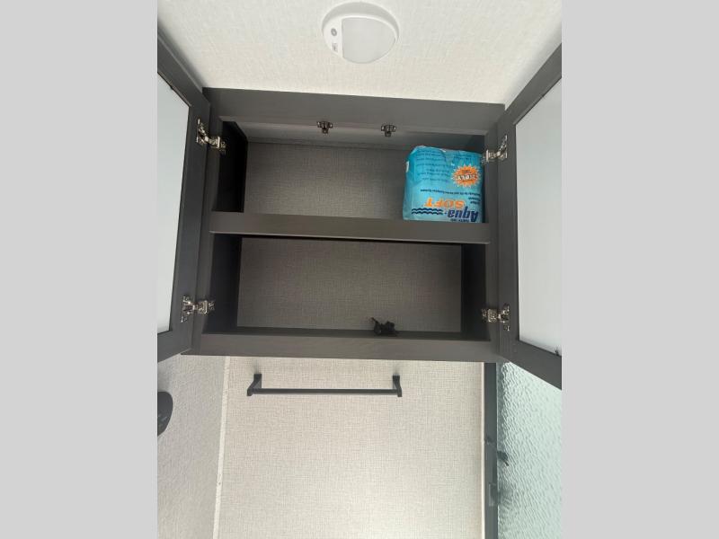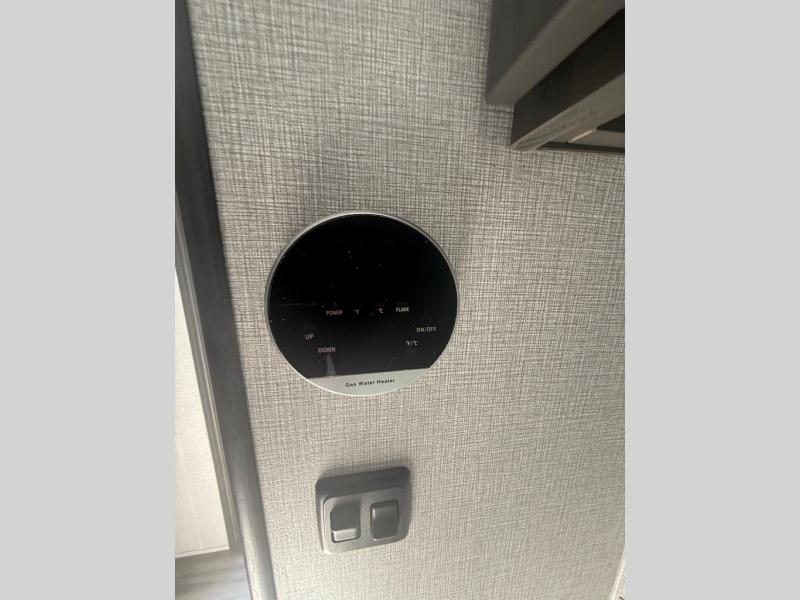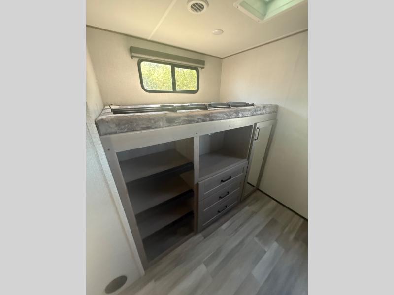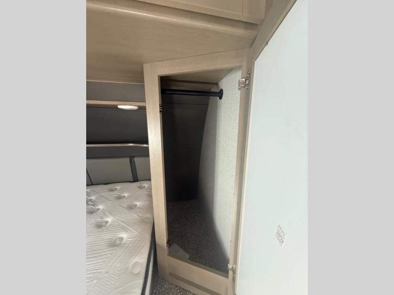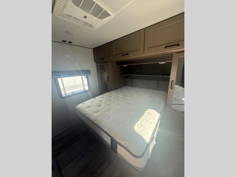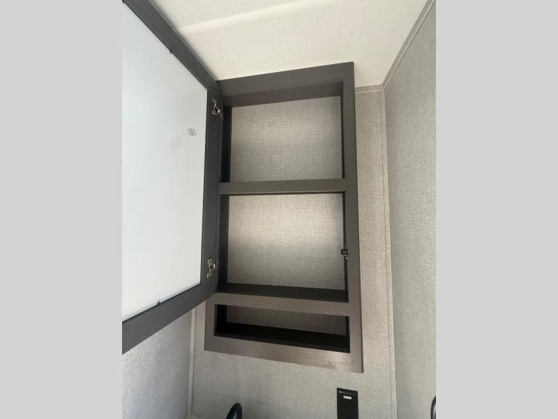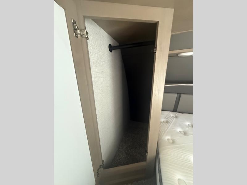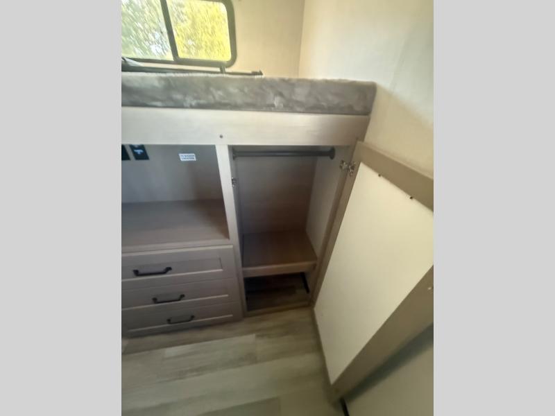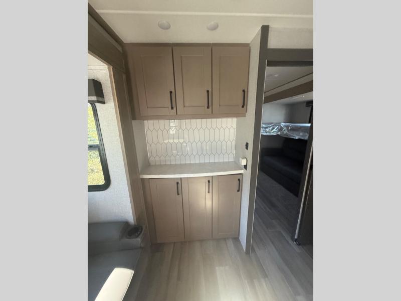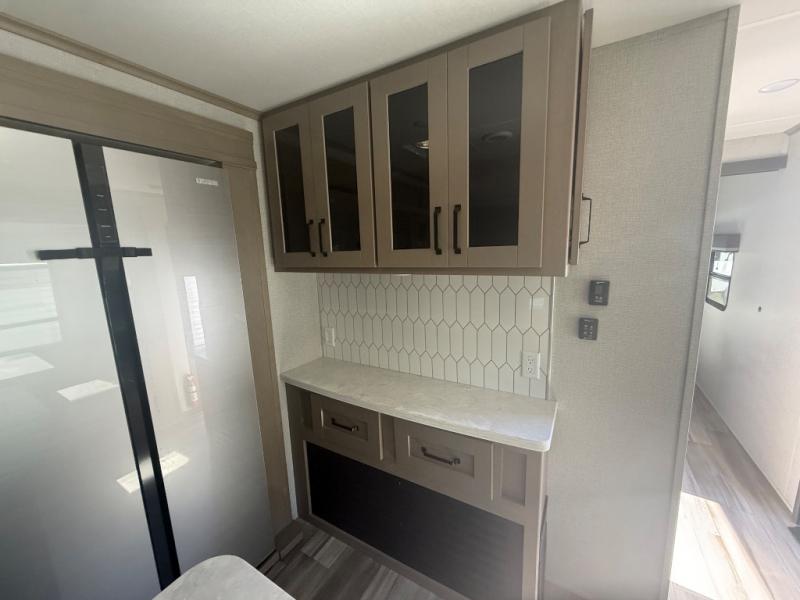 Finding the perfect trailer for a larger group is simple, take a look at this one for your next RV! The rear bunkhouse might be the first reason you fall in love because of the slide out with a flip bunk above a tri-fold sofa, the second bunk bed on the opposite side and storage below, and the large rear window for great views. The outside kitchen might be another reason allowing you to enjoy the outdoors while providing meals for everyone, and/or the inside gourmet kitchen with a 16 cu. ft. refrigerator, an island, and two hutches. Everyone can gather together and relax on the theatre seating with cupholders and the booth dinette or choose a free standing dinette option, and to visit or watch the 40" LED HDTV with fireplace below. The full bathroom includes a space savings sliding door and linen storage, and the bedroom gives you a front walk-around queen bed with storage for your clothes on each side, plus there is an additional wardrobe with drawers and the option to add a washer/dryer to the prepped space.
