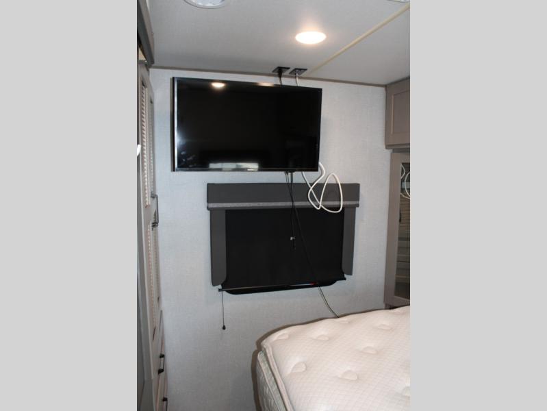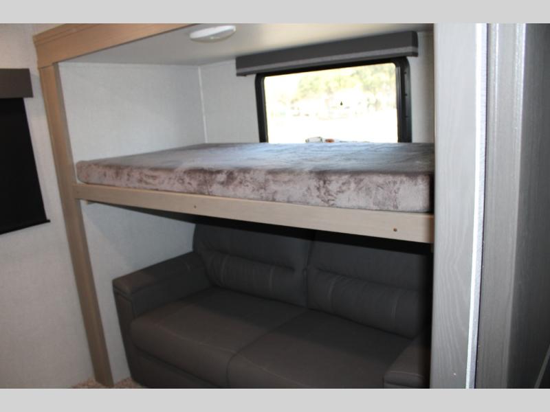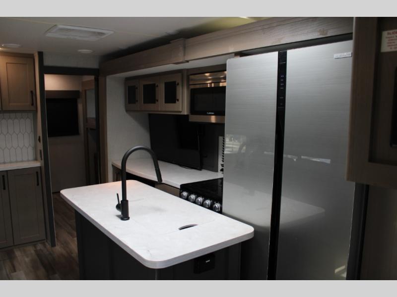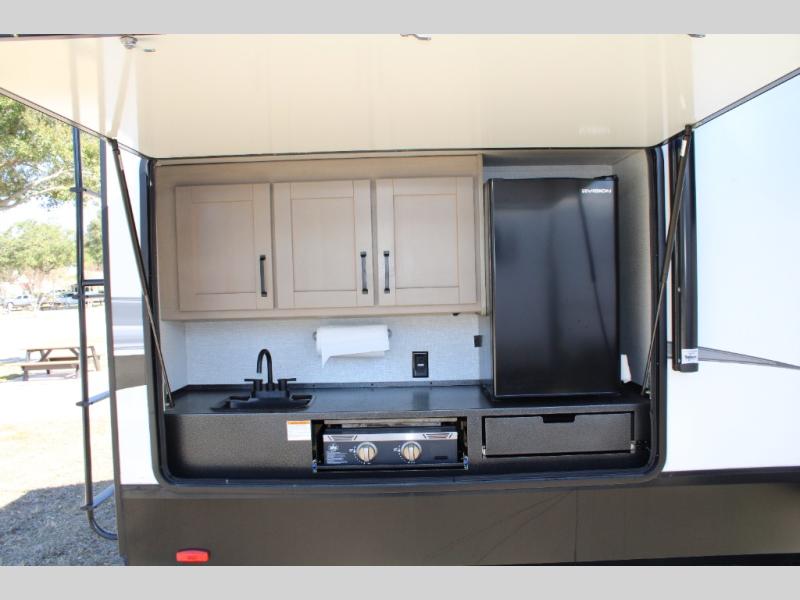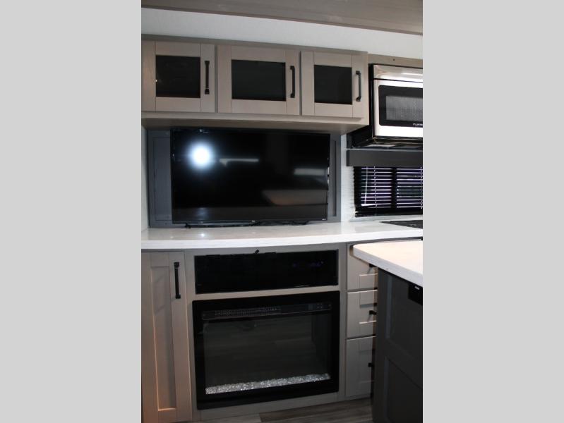 Finding the perfect trailer for a larger group is simple, take a look at this one for your next RV! The rear bunkhouse might be the first reason you fall in love because of the slide out with a flip bunk above a tri-fold sofa, the second bunk bed on the opposite side and storage below, and the large rear window for great views. The outside kitchen might be another reason allowing you to enjoy the outdoors while providing meals for everyone, and/or the inside gourmet kitchen with a 16 cu. ft. refrigerator, an island, and two hutches. Everyone can gather together and relax on the theatre seating with cupholders and the booth dinette or choose a free standing dinette option, and to visit or watch the 40" LED HDTV with fireplace below. The full bathroom includes a space savings sliding door and linen storage, and the bedroom gives you a front walk-around queen bed with storage for your clothes on each side, plus there is an additional wardrobe with drawers and the option to add a washer/dryer to the prepped space.
