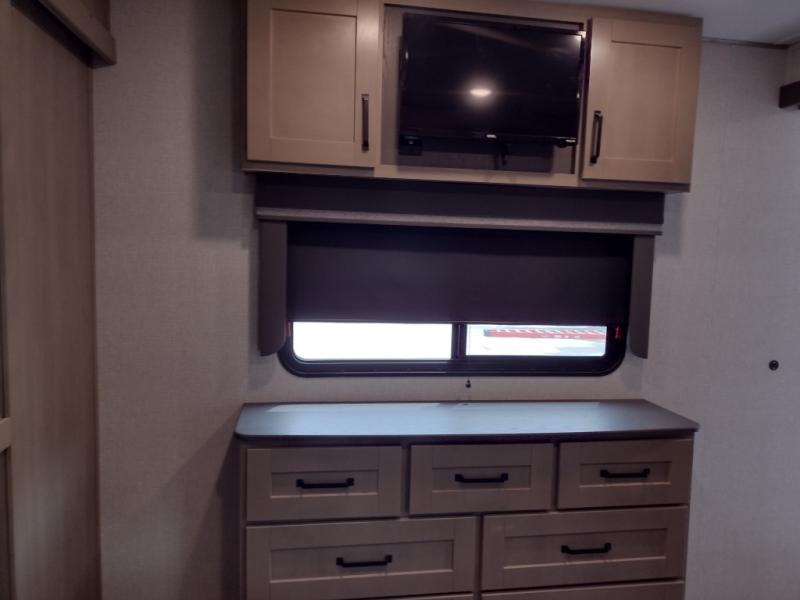 The chef of the group will love the gourmet kitchen including the 16 cu. ft. refrigerator that will hold lots of cold ingredients, beverages and leftovers, the center island when preparing and serving meals, and the hutch with overhead cabinets to display and store dishes and such. This area also includes two slide outs for more floor space and furniture to relax on including theatre seating with cupholders for your drinks, a booth dinette to dine at and work from or choose a free standing dinette option, and a rear tri-fold sofa that offers sleeping space for two at night. There is a 40" LED HDTV with fireplace below to enjoy while inside, plus there are two awnings outdoors to relax under. When you are ready to call it a night, get cleaned up in the full bathroom, and retire to your front bedroom with a slide out queen bed or choose a king option, a front full-wall wardrobe with washer/dryer prep, a dresser and an additional wardrobe with drawers.