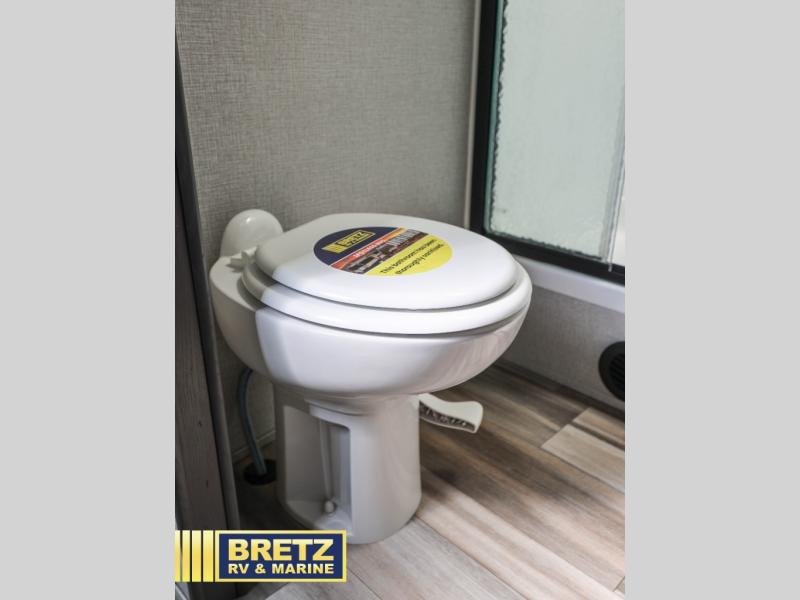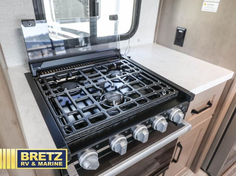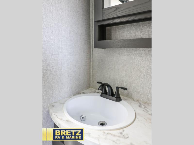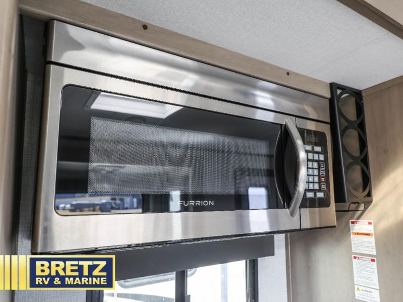 The chef of the group will love the gourmet kitchen including the 16 cu. ft. refrigerator that will hold lots of cold ingredients, beverages and leftovers, the center island when preparing and serving meals, and the hutch with overhead cabinets to display and store dishes and such. This area also includes two slide outs for more floor space and furniture to relax on including theatre seating with cupholders for your drinks, a booth dinette to dine at and work from or choose a free standing dinette option, and a rear tri-fold sofa that offers sleeping space for two at night. There is a 40" LED HDTV with fireplace below to enjoy while inside, plus there are two awnings outdoors to relax under. When you are ready to call it a night, get cleaned up in the full bathroom, and retire to your front bedroom with a slide out queen bed or choose a king option, a front full-wall wardrobe with washer/dryer prep, a dresser and an additional wardrobe with drawers.