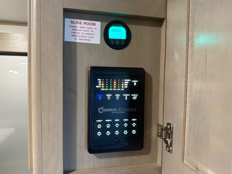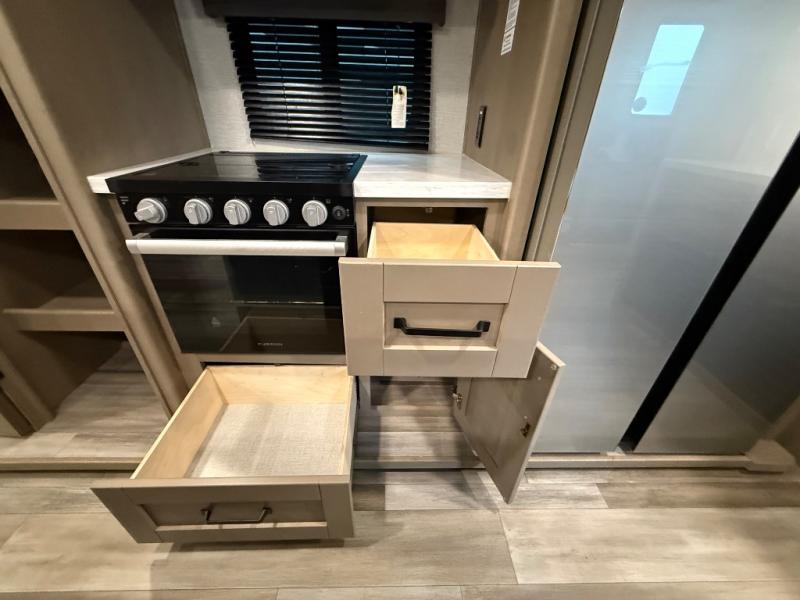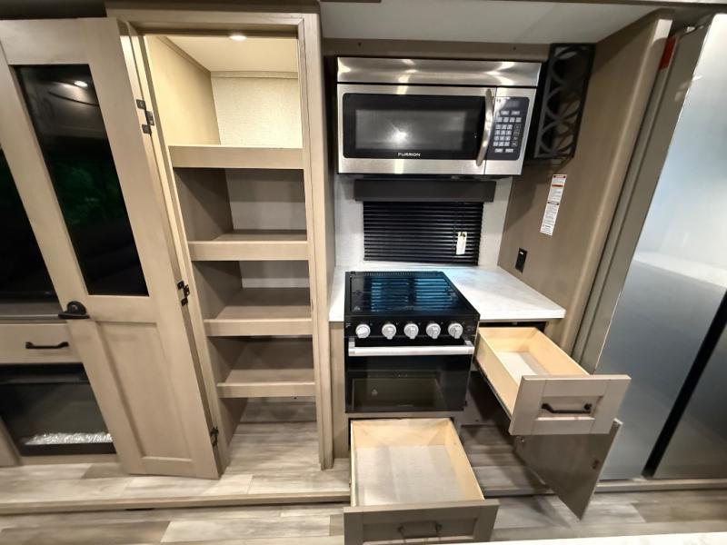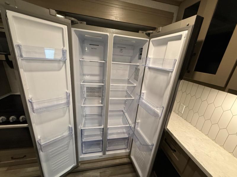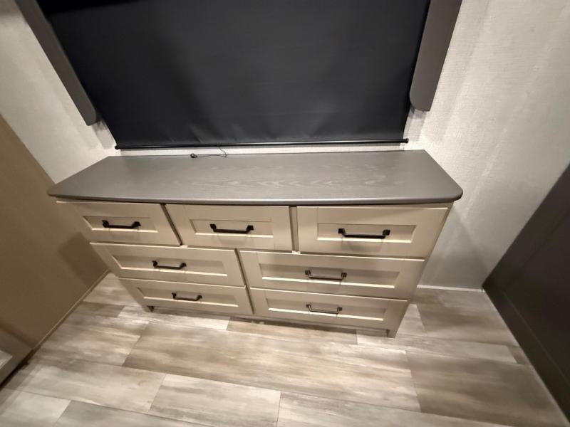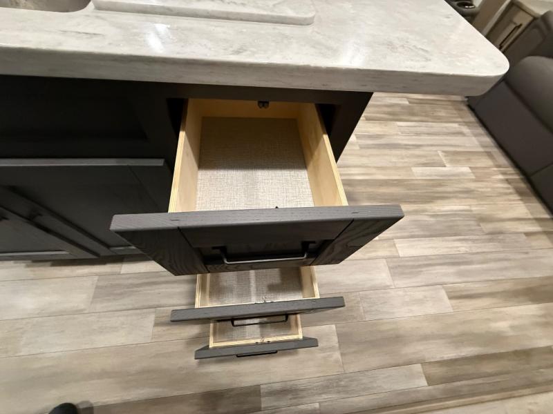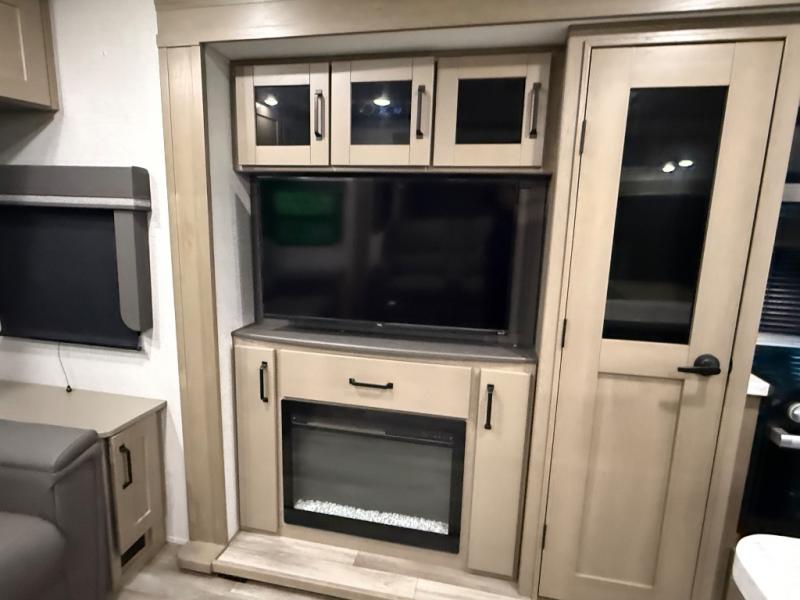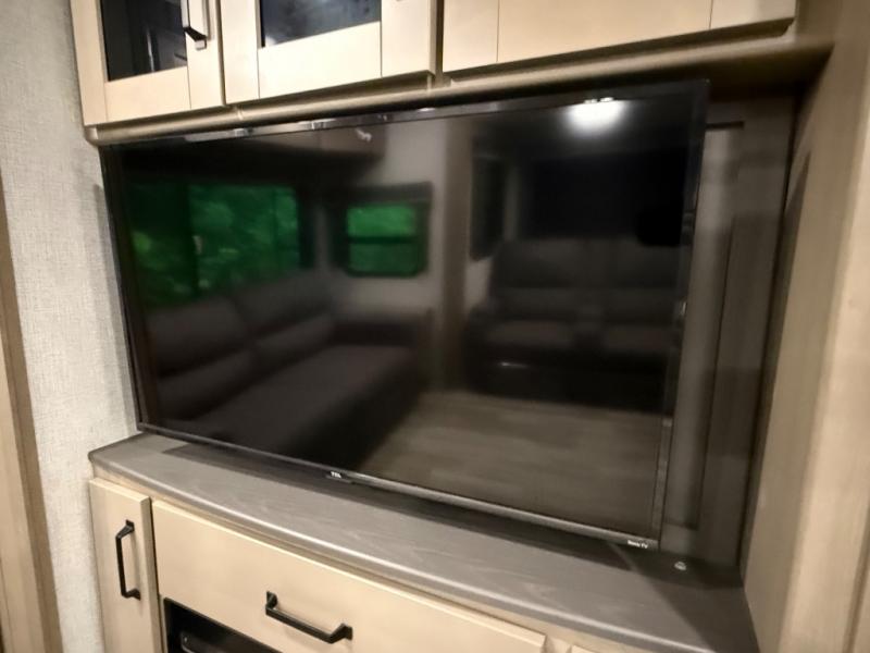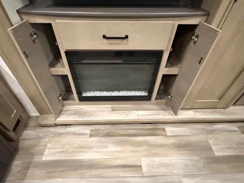 The chef of the group will love the gourmet kitchen including the 16 cu. ft. refrigerator that will hold lots of cold ingredients, beverages and leftovers, the center island when preparing and serving meals, and the hutch with overhead cabinets to display and store dishes and such. This area also includes two slide outs for more floor space and furniture to relax on including theatre seating with cupholders for your drinks, a booth dinette to dine at and work from or choose a free standing dinette option, and a rear tri-fold sofa that offers sleeping space for two at night. There is a 40" LED HDTV with fireplace below to enjoy while inside, plus there are two awnings outdoors to relax under. When you are ready to call it a night, get cleaned up in the full bathroom, and retire to your front bedroom with a slide out queen bed or choose a king option, a front full-wall wardrobe with washer/dryer prep, a dresser and an additional wardrobe with drawers.