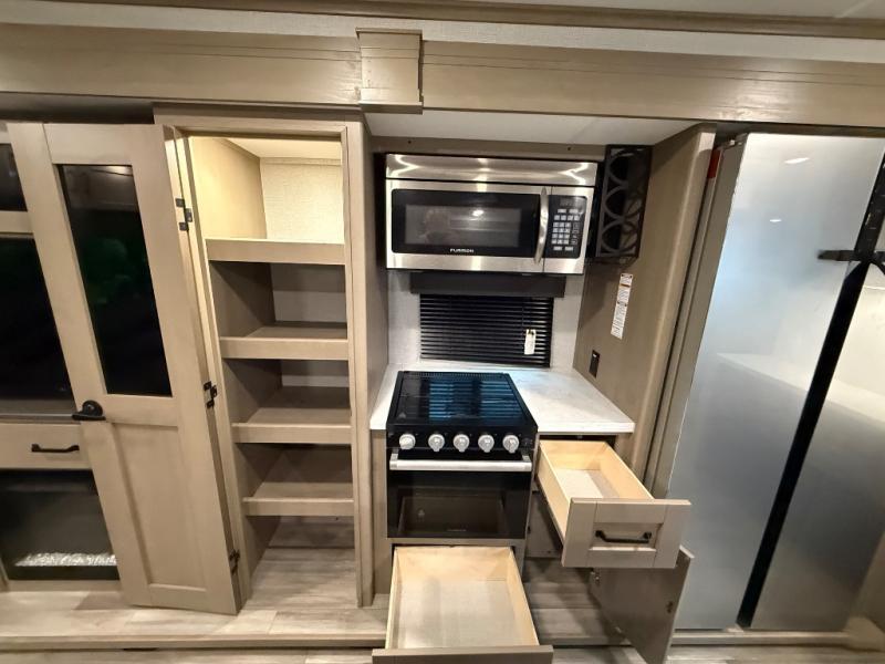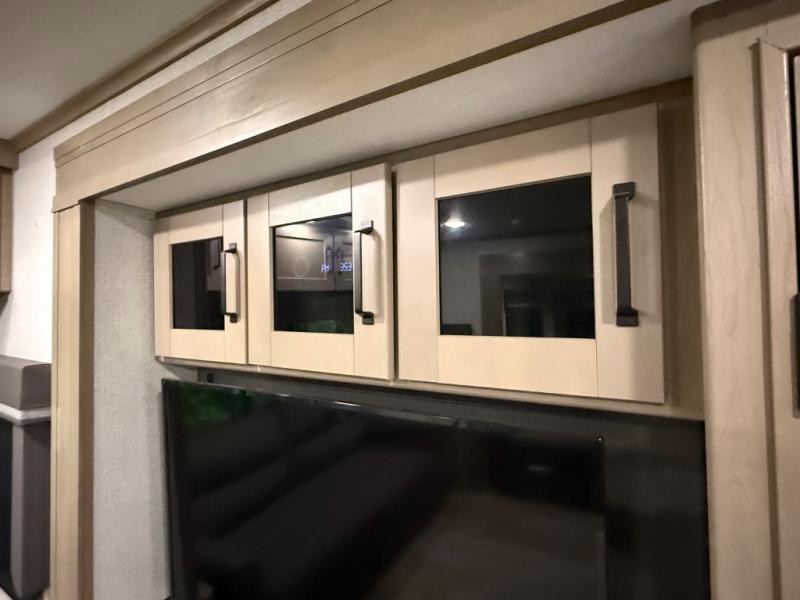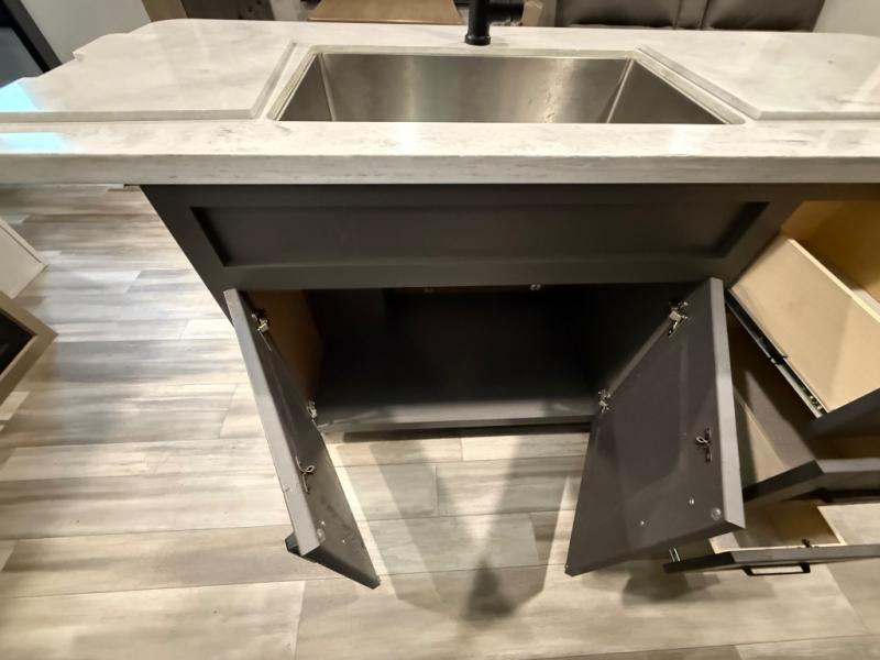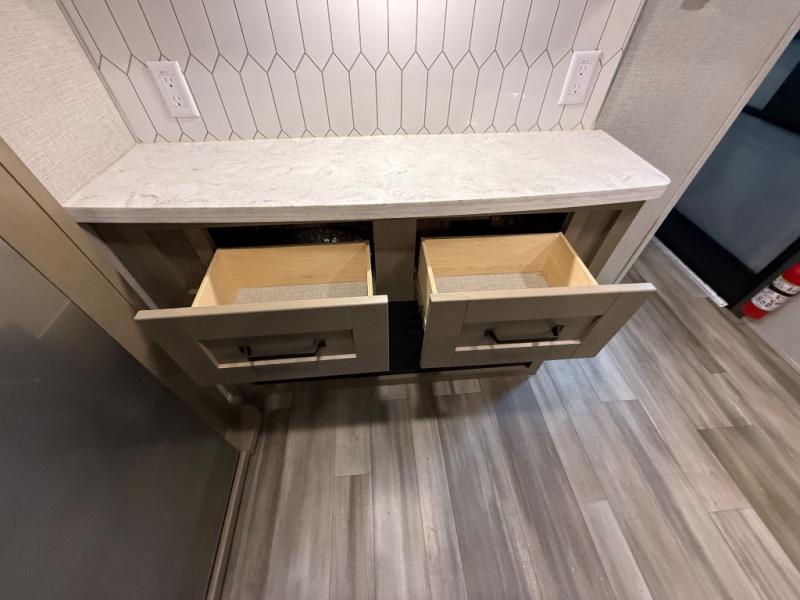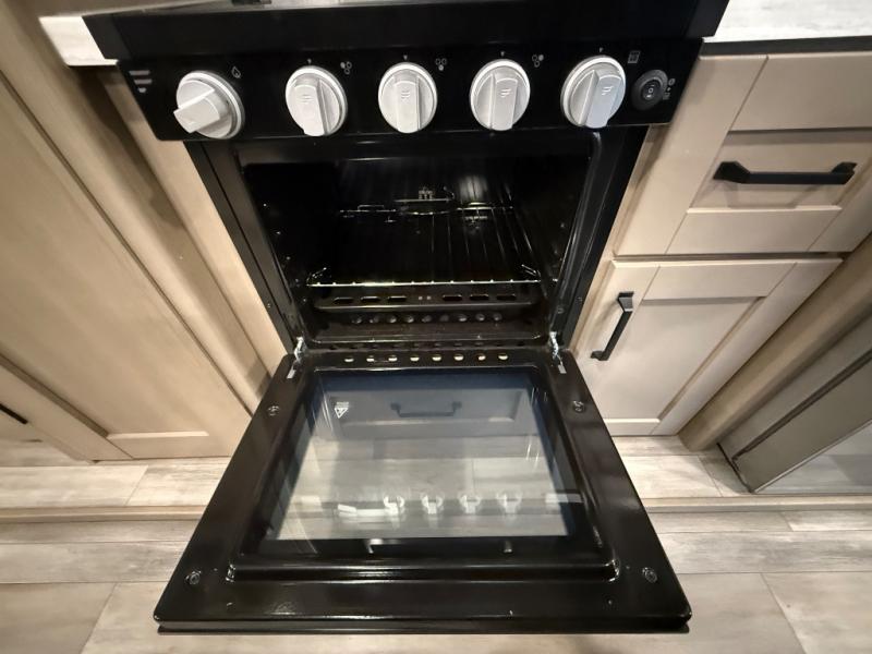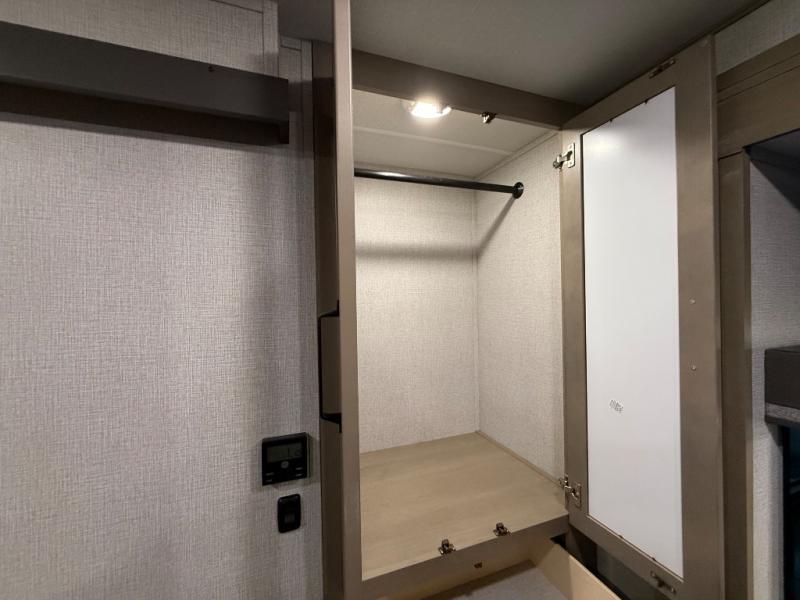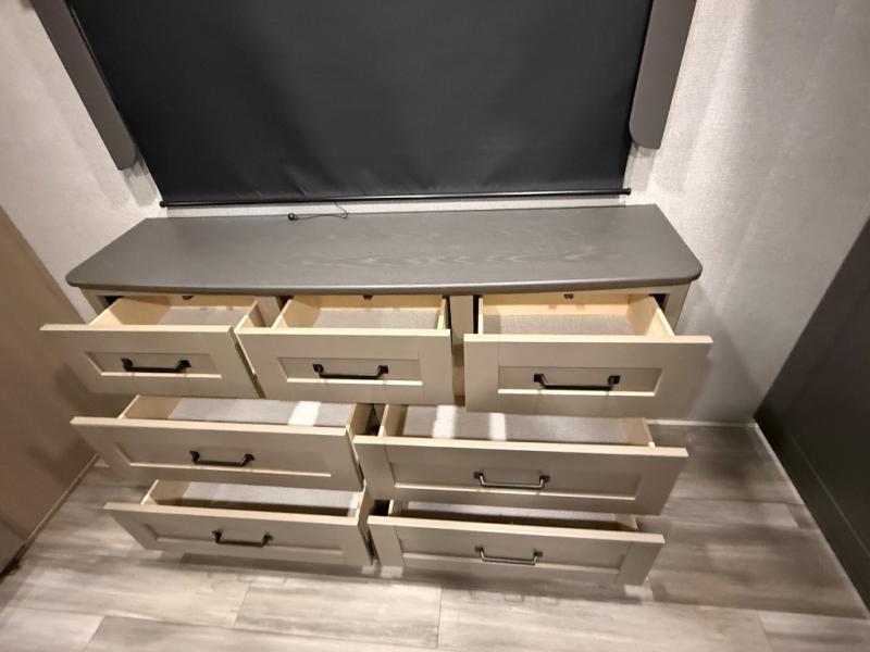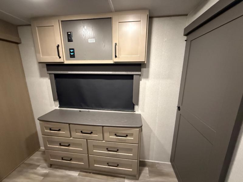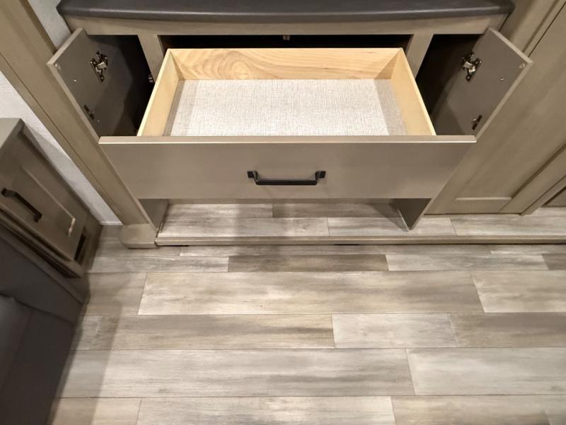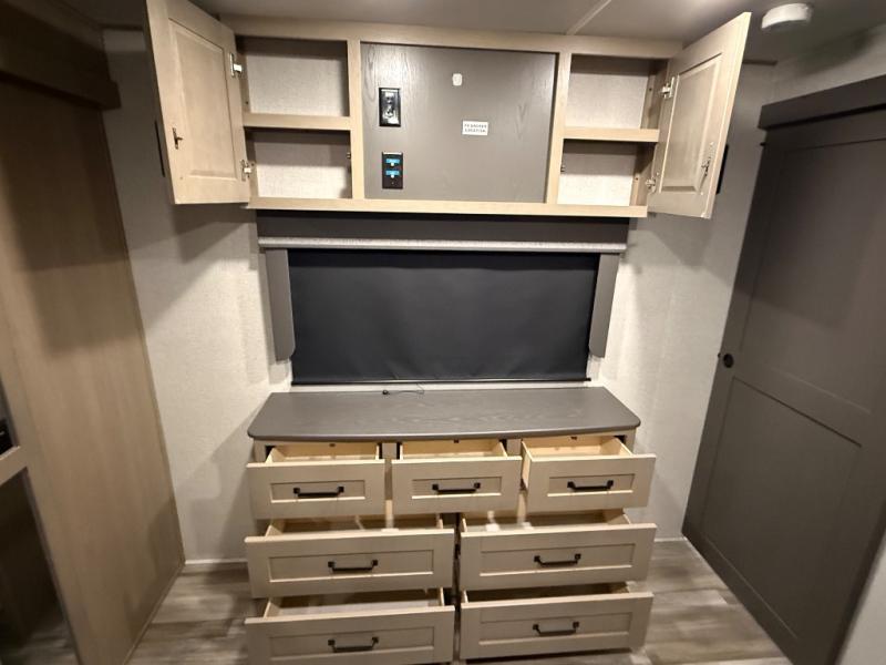 The chef of the group will love the gourmet kitchen including the 16 cu. ft. refrigerator that will hold lots of cold ingredients, beverages and leftovers, the center island when preparing and serving meals, and the hutch with overhead cabinets to display and store dishes and such. This area also includes two slide outs for more floor space and furniture to relax on including theatre seating with cupholders for your drinks, a booth dinette to dine at and work from or choose a free standing dinette option, and a rear tri-fold sofa that offers sleeping space for two at night. There is a 40" LED HDTV with fireplace below to enjoy while inside, plus there are two awnings outdoors to relax under. When you are ready to call it a night, get cleaned up in the full bathroom, and retire to your front bedroom with a slide out queen bed or choose a king option, a front full-wall wardrobe with washer/dryer prep, a dresser and an additional wardrobe with drawers.
