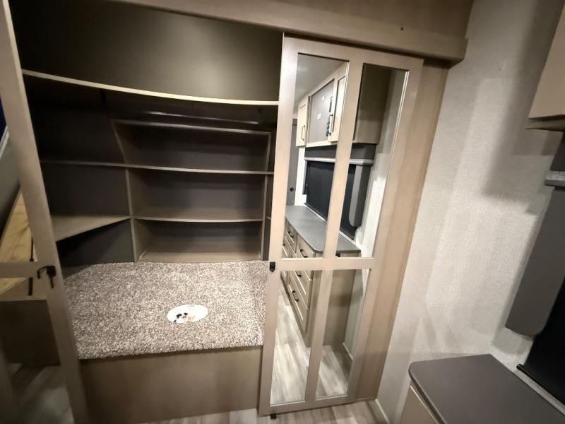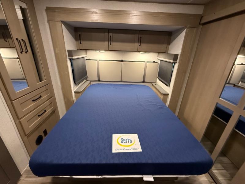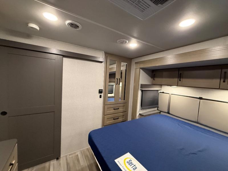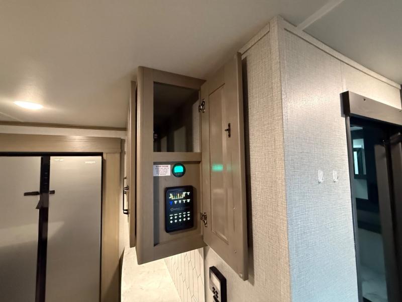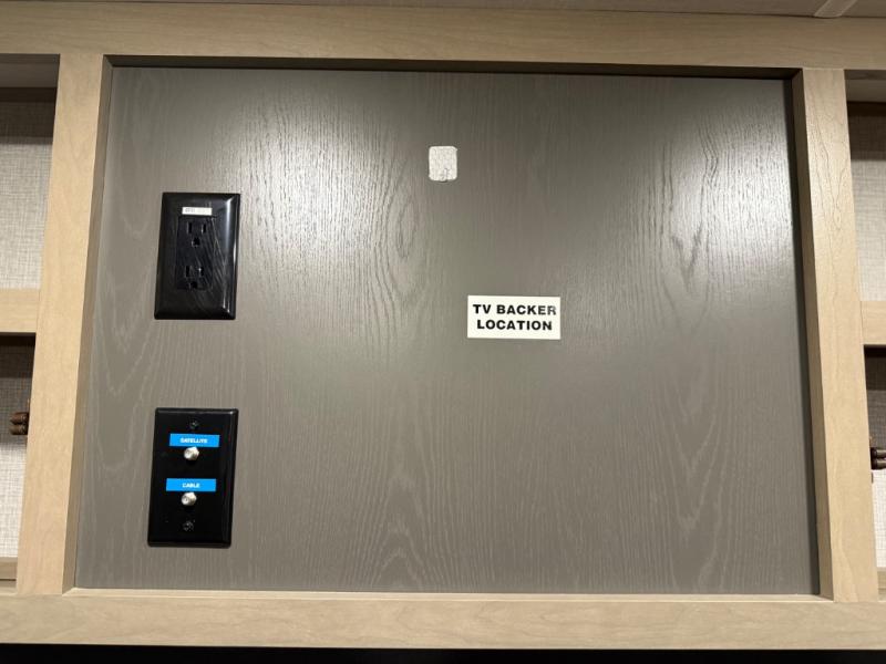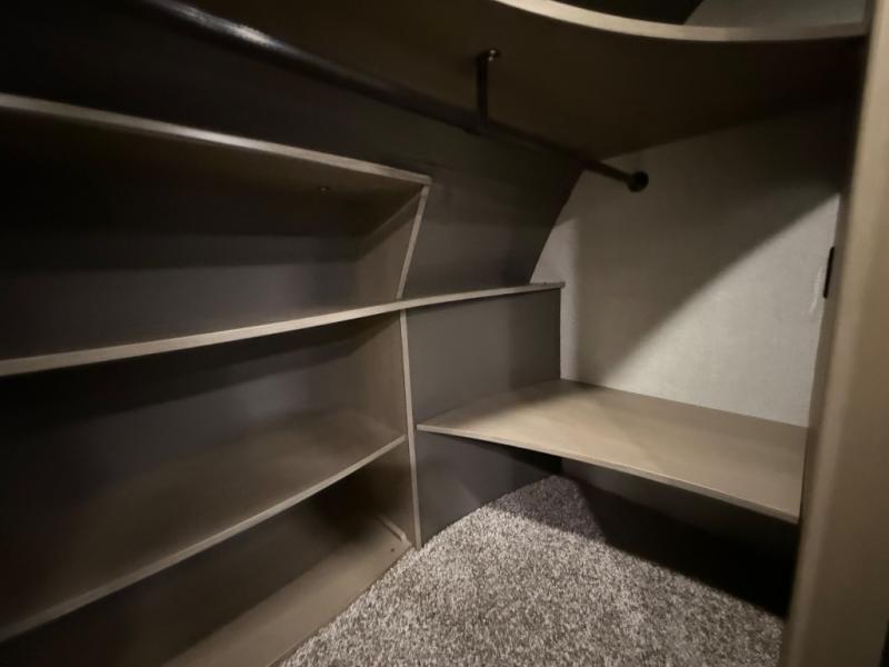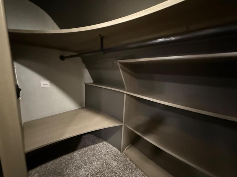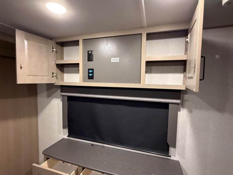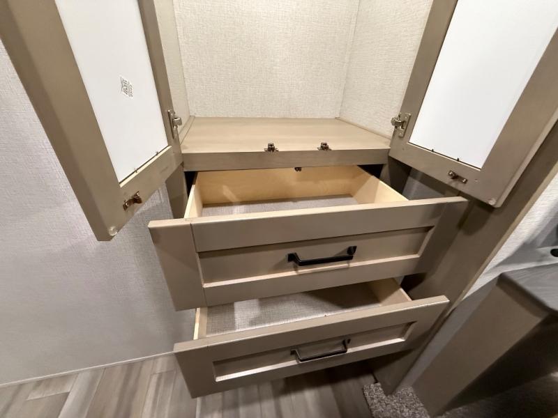 The chef of the group will love the gourmet kitchen including the 16 cu. ft. refrigerator that will hold lots of cold ingredients, beverages and leftovers, the center island when preparing and serving meals, and the hutch with overhead cabinets to display and store dishes and such. This area also includes two slide outs for more floor space and furniture to relax on including theatre seating with cupholders for your drinks, a booth dinette to dine at and work from or choose a free standing dinette option, and a rear tri-fold sofa that offers sleeping space for two at night. There is a 40" LED HDTV with fireplace below to enjoy while inside, plus there are two awnings outdoors to relax under. When you are ready to call it a night, get cleaned up in the full bathroom, and retire to your front bedroom with a slide out queen bed or choose a king option, a front full-wall wardrobe with washer/dryer prep, a dresser and an additional wardrobe with drawers.