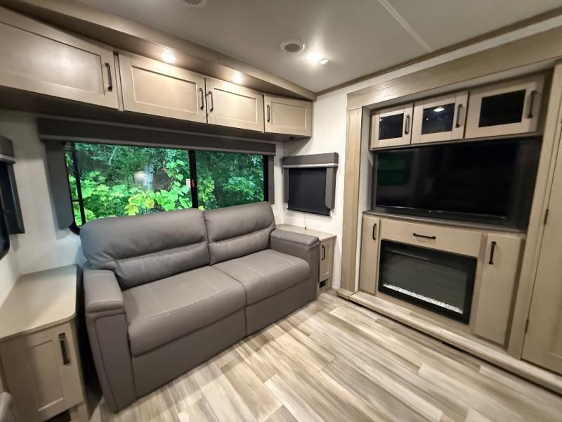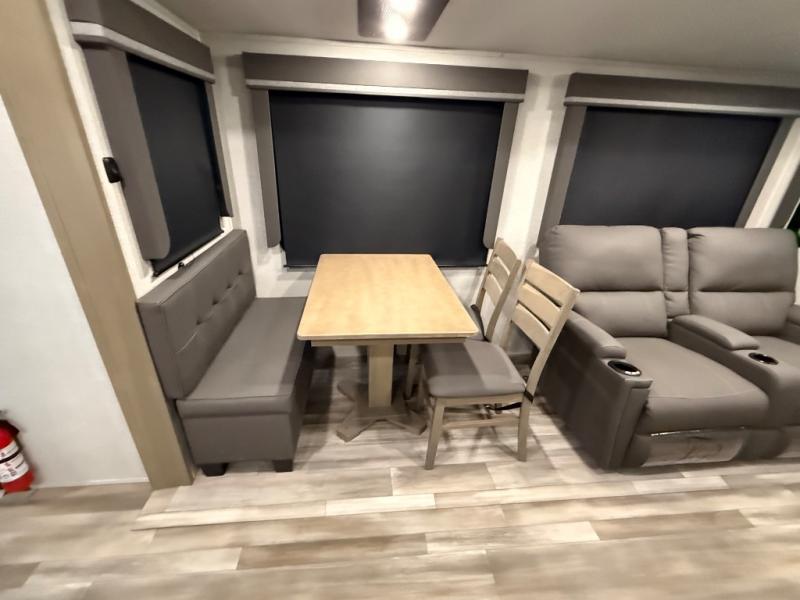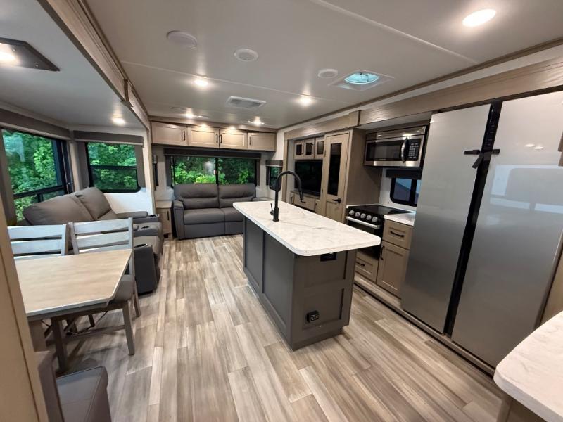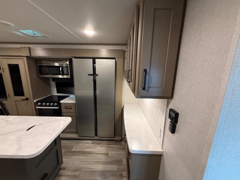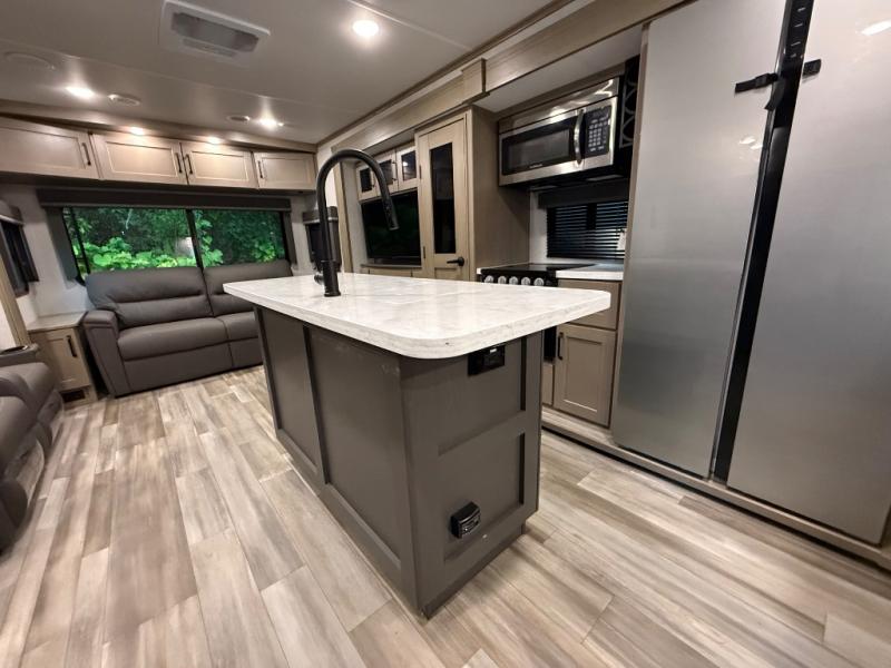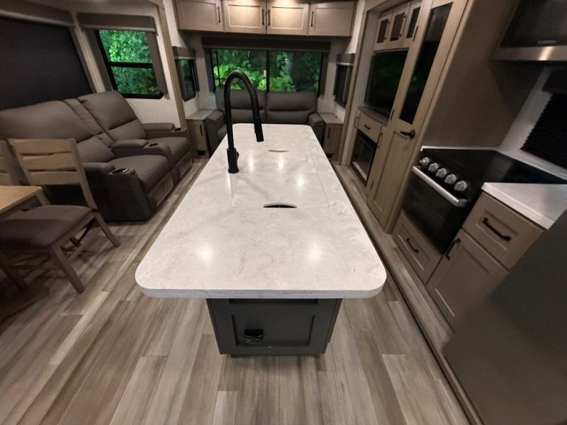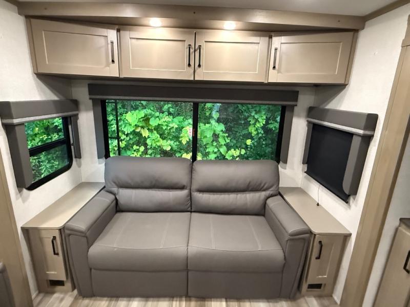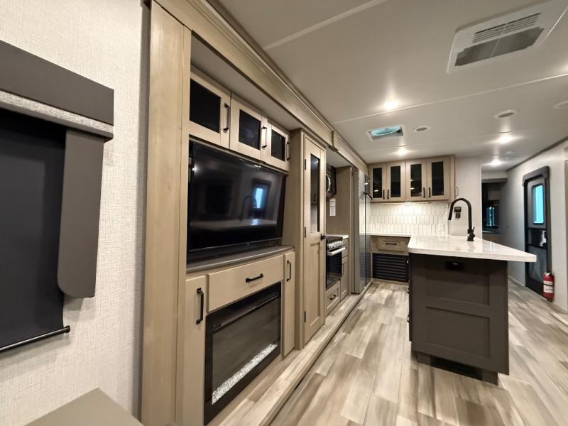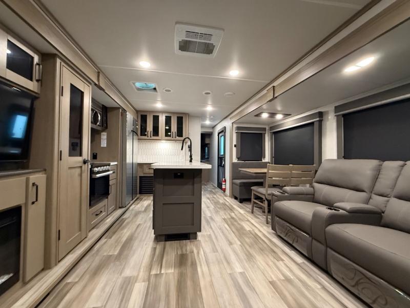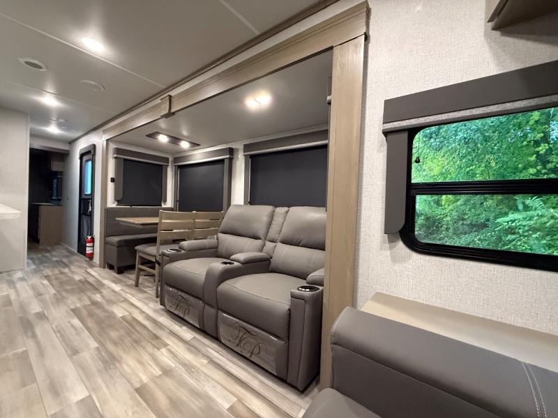 This is a high-end travel trailer with three slide-outs, a rear living layout (sofa + theater seating), a kitchen with island, full bathroom, and a comfortable front bedroom. It balances a spacious interior and quality build (laminated walls, solid insulation, gel-coat exterior) with practical utilities (dual propane, on-demand water heater, 50-amp service, solar prep). It’s ideal for those wanting a “home-away-from-home” experience without compromising on features or comfort.