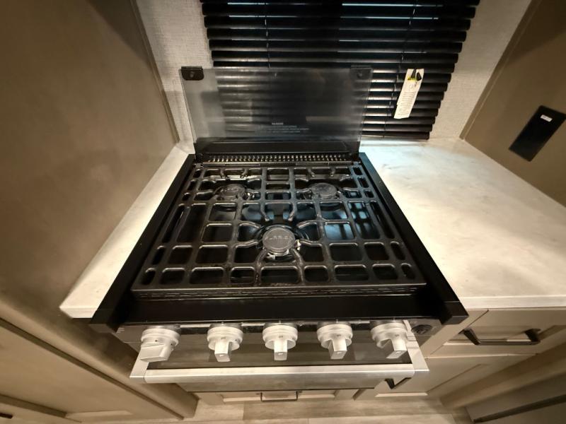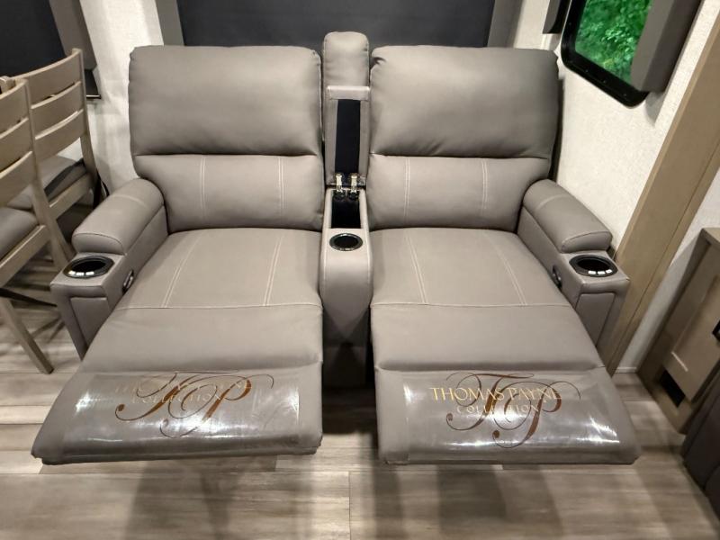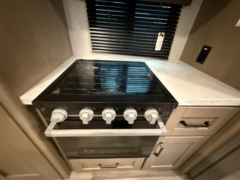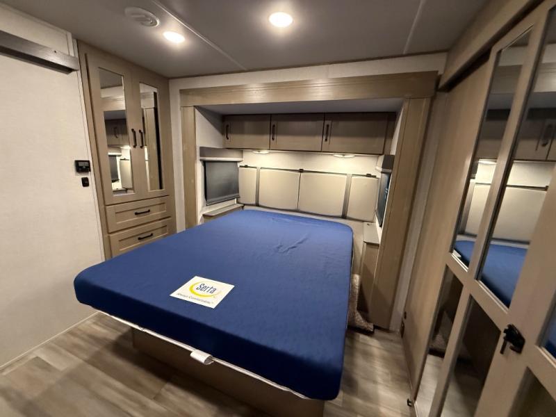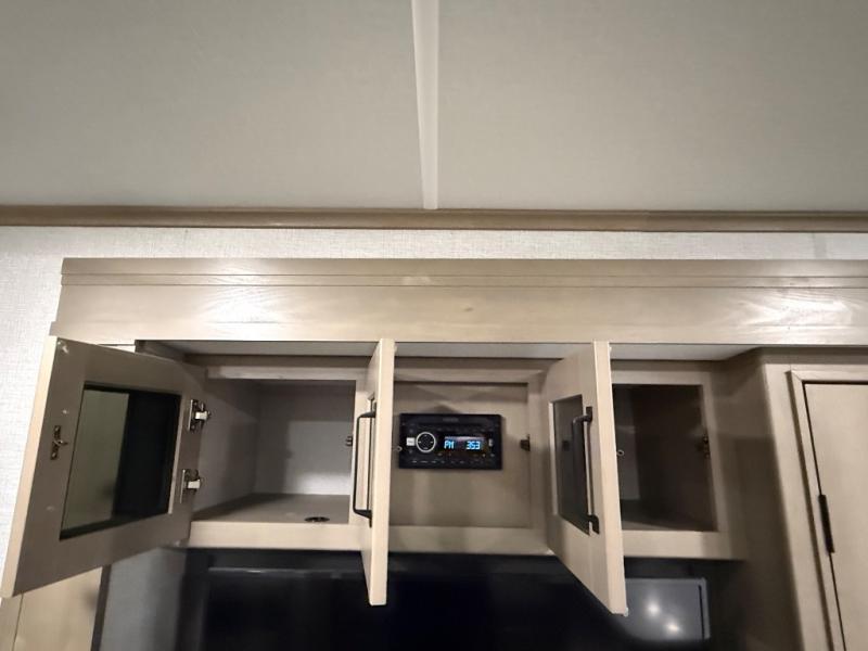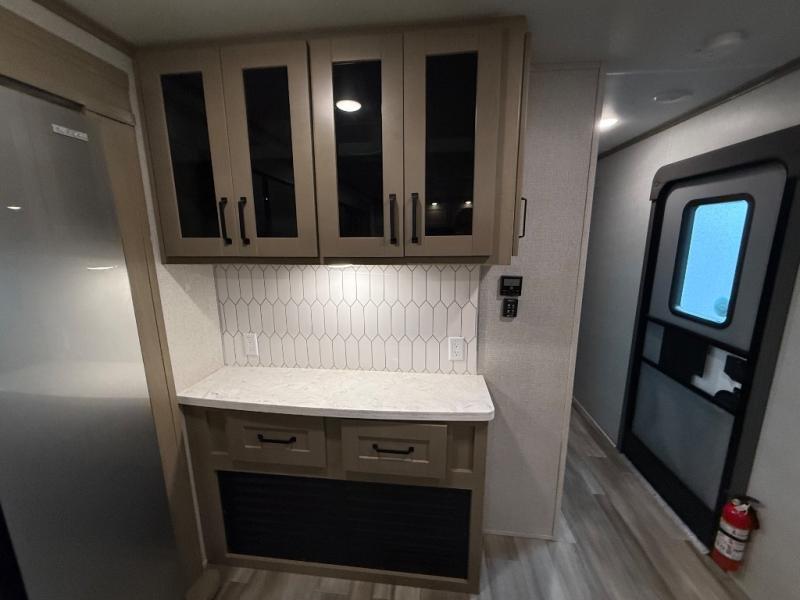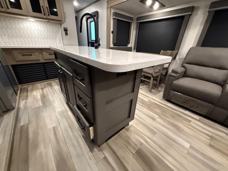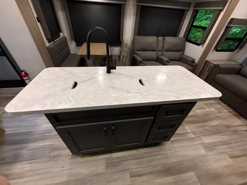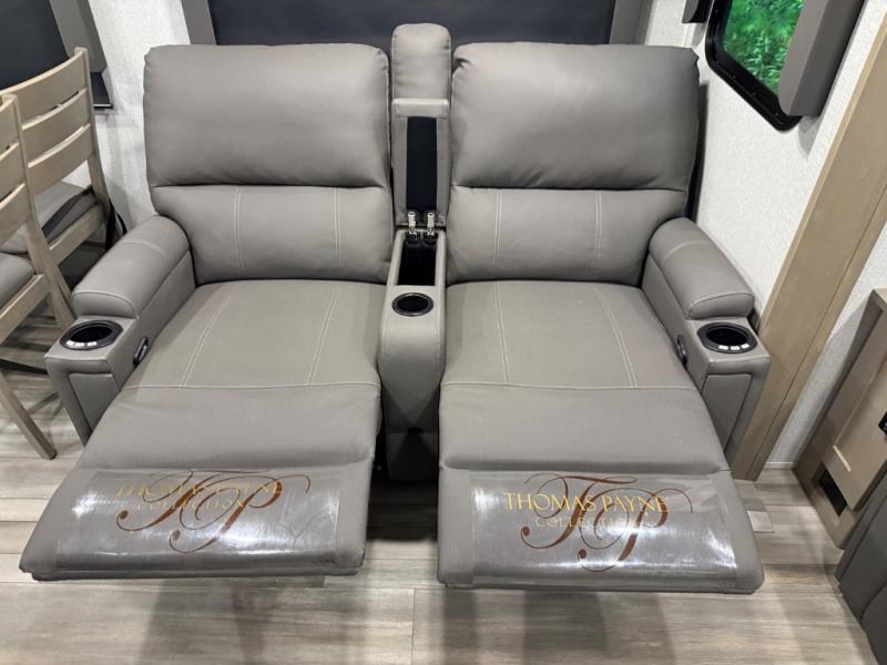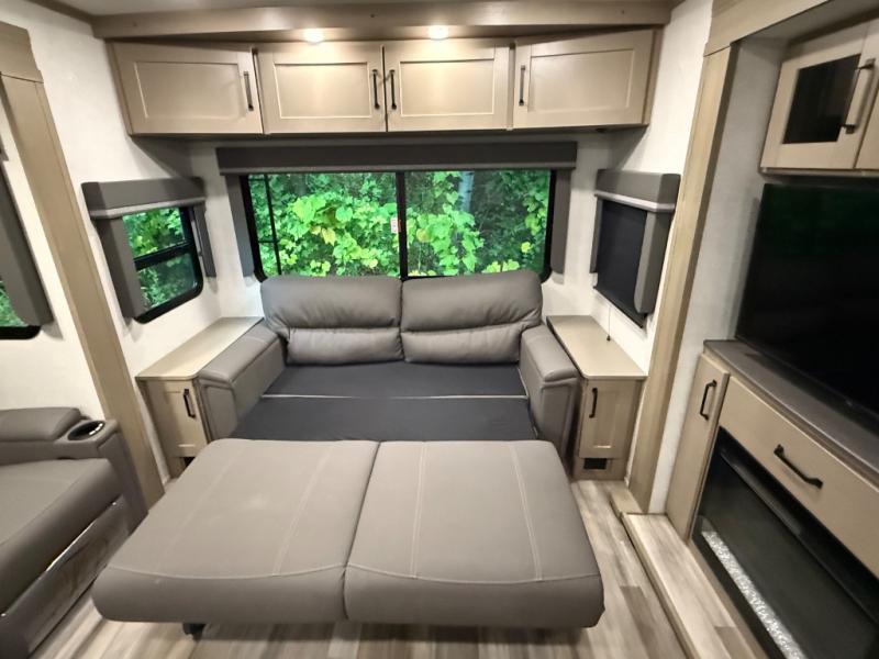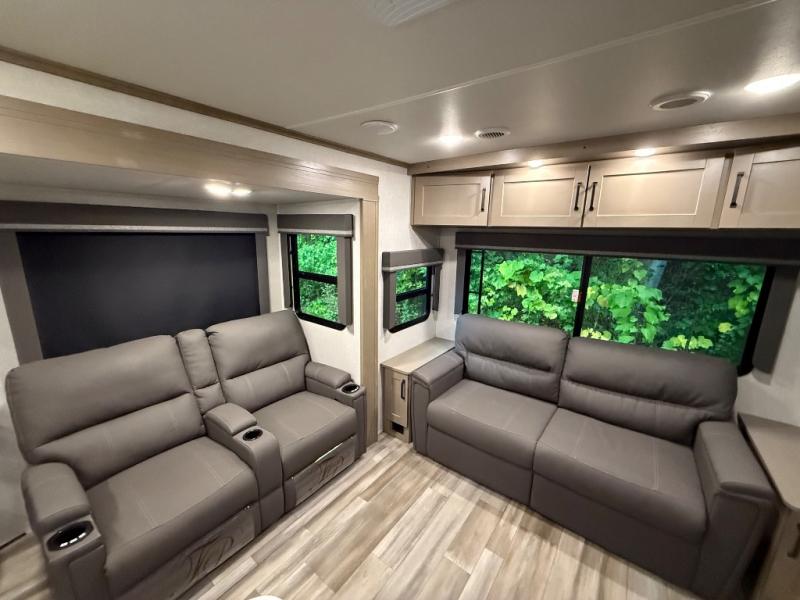 This is a high-end travel trailer with three slide-outs, a rear living layout (sofa + theater seating), a kitchen with island, full bathroom, and a comfortable front bedroom. It balances a spacious interior and quality build (laminated walls, solid insulation, gel-coat exterior) with practical utilities (dual propane, on-demand water heater, 50-amp service, solar prep). It’s ideal for those wanting a “home-away-from-home” experience without compromising on features or comfort.