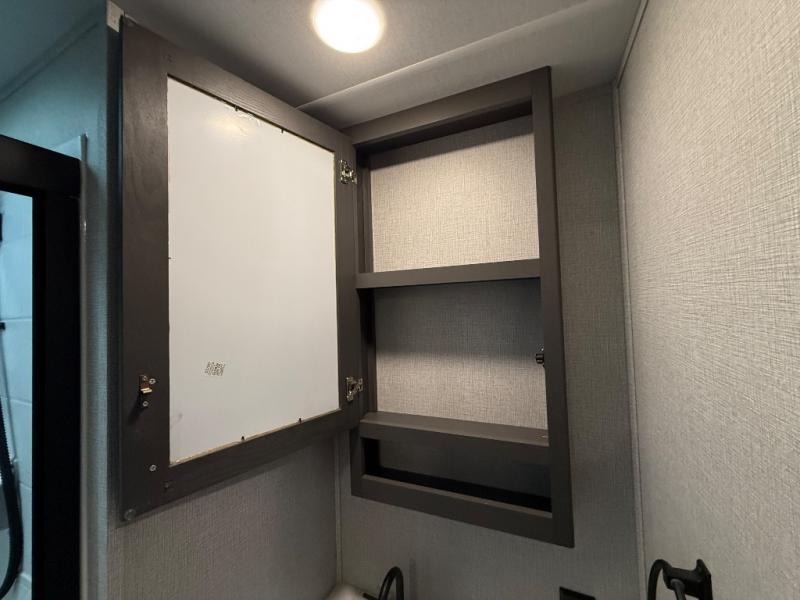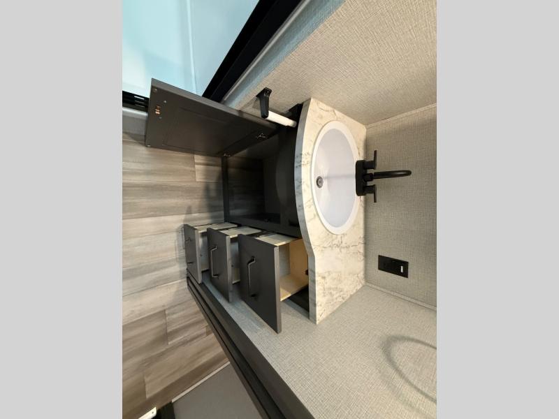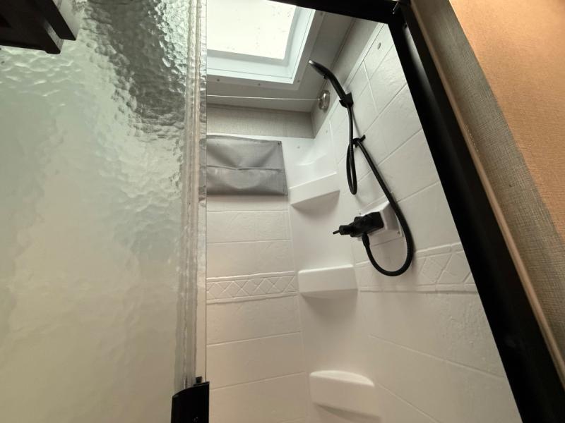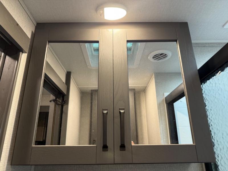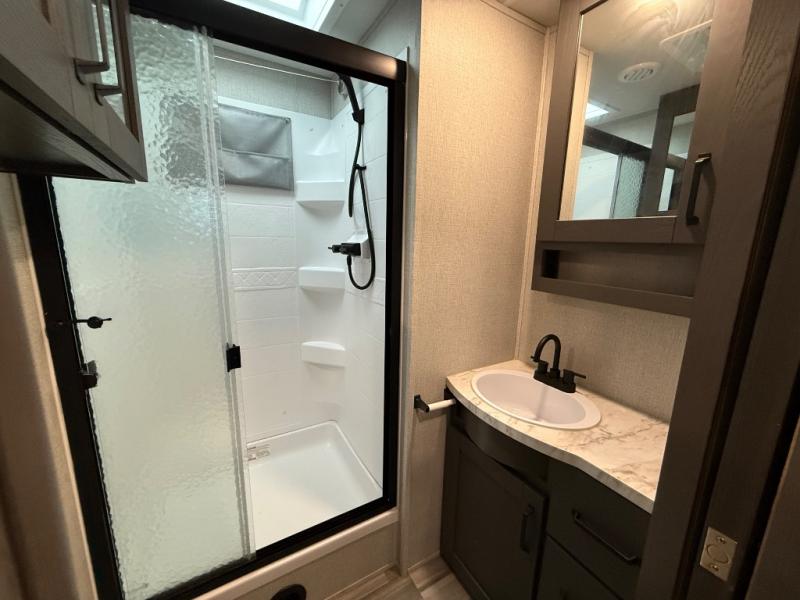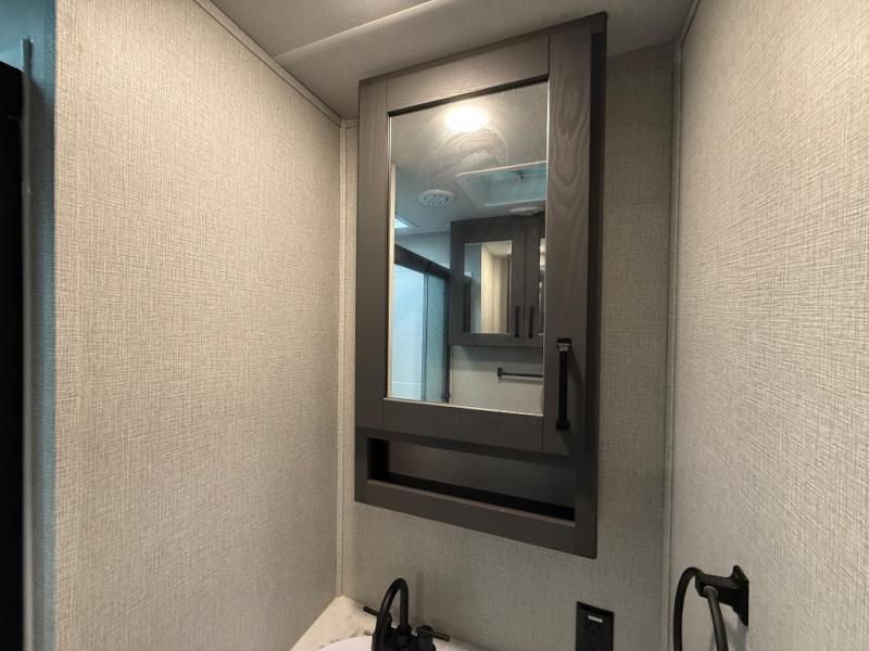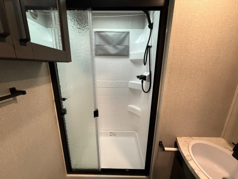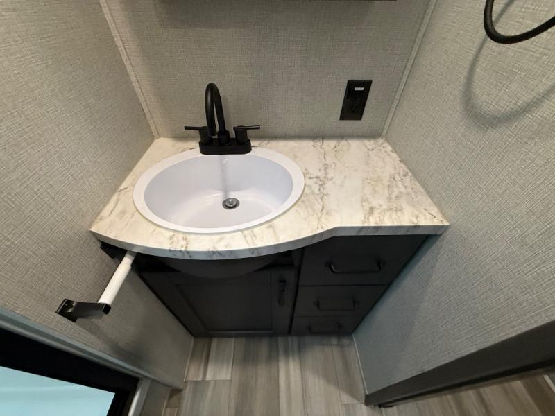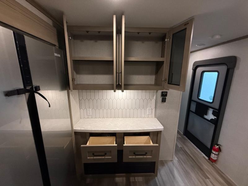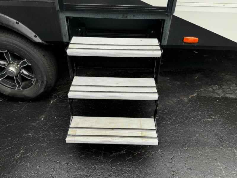 This is a high-end travel trailer with three slide-outs, a rear living layout (sofa + theater seating), a kitchen with island, full bathroom, and a comfortable front bedroom. It balances a spacious interior and quality build (laminated walls, solid insulation, gel-coat exterior) with practical utilities (dual propane, on-demand water heater, 50-amp service, solar prep). It’s ideal for those wanting a “home-away-from-home” experience without compromising on features or comfort.