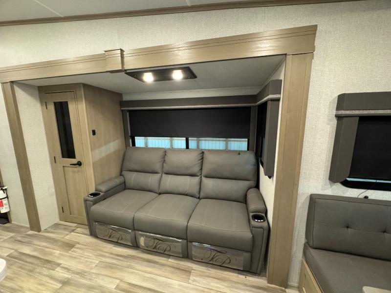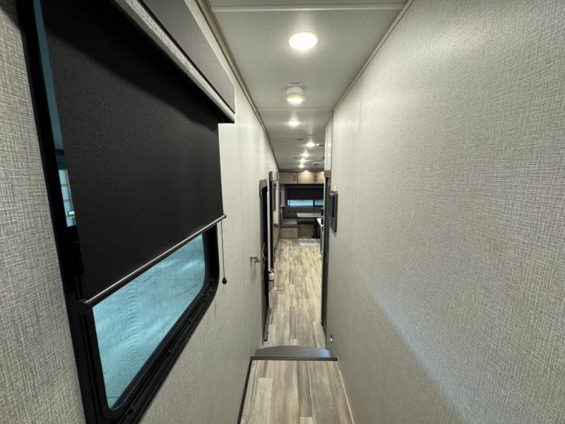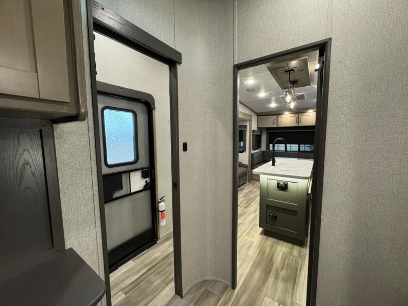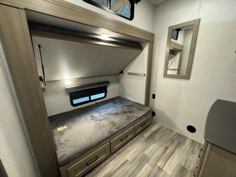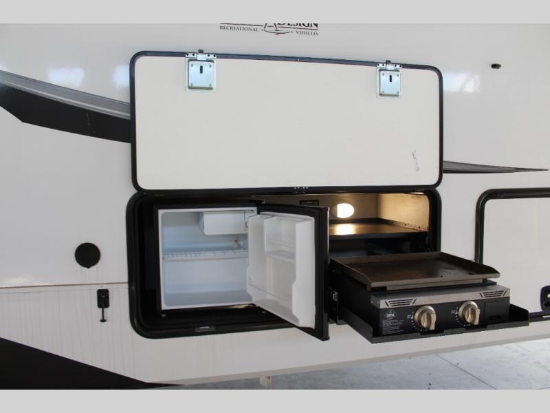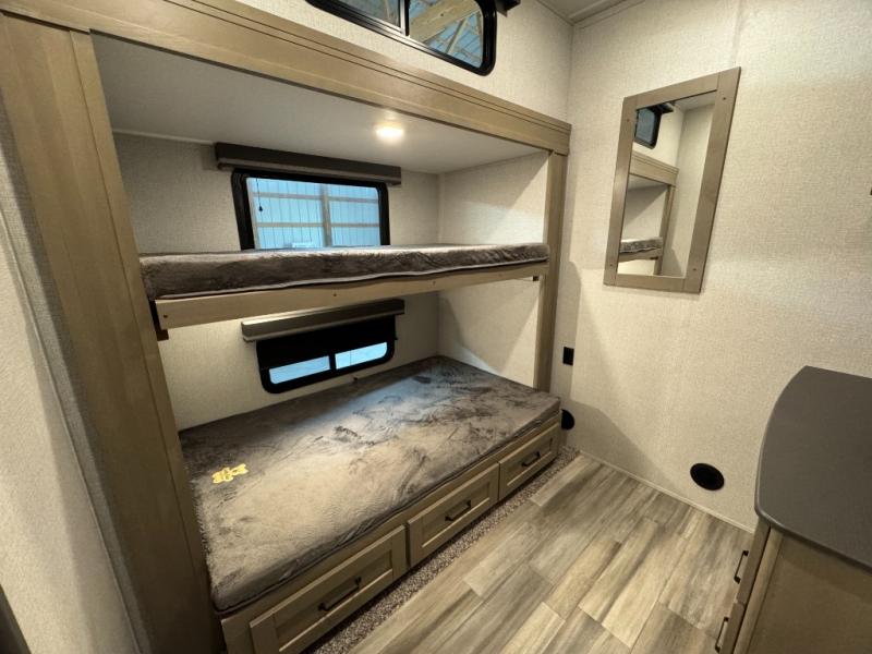 When you are looking for a versatile extra room for either a second bedroom or living area as well as an office, this middle bunkhouse might just work! There is a slide out with two bunks and drawers plus a full size dresser. You can sleep like a queen on the walk-around bed in the front private bedroom that offers more clothing storage and windows for views. The rear main living and kitchen area provides plenty of seating on the a 78" triple person theatre seats, and on the 92" U-shaped lounge with table with windows within the slide for natural lighting and great views. The kitchen island gives the cook more space to make and serve meals, and the gourmet kitchen includes a 16 cu. ft. refrigerator, plus a pantry for dry goods. There is an exterior outside kitchen with a griddle and a 1.6 cu. ft. refrigerator for beverages and such, plus you will find an LP quick connect, Coax TV hookup, and a spray port to wash off your dirty shoes.