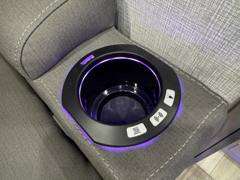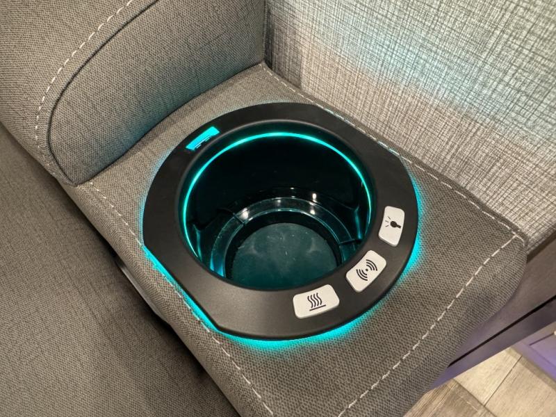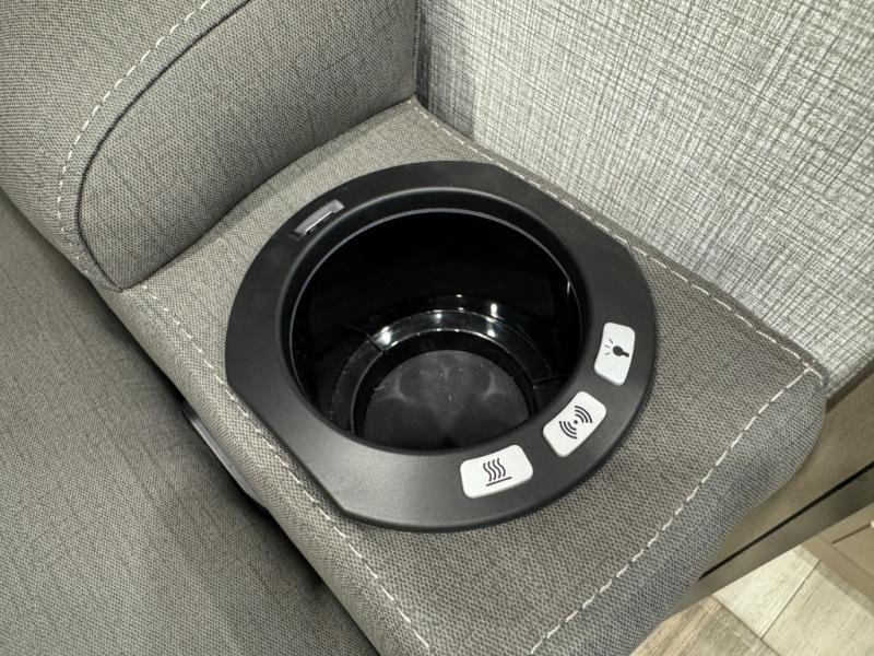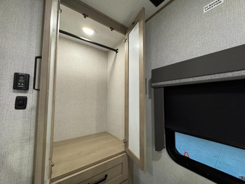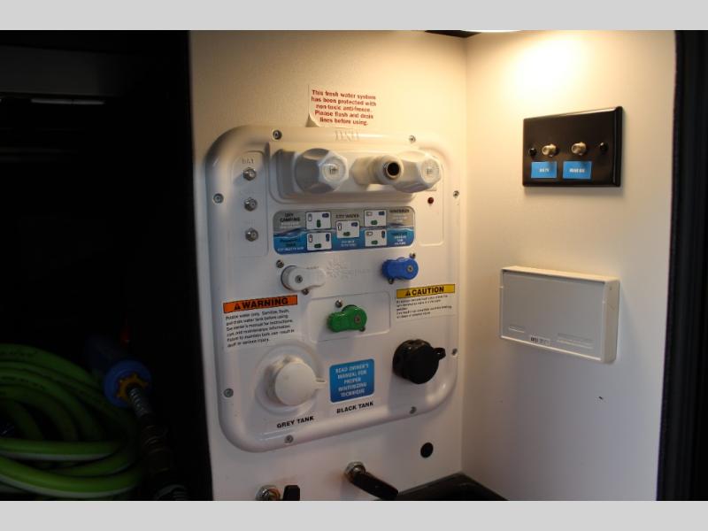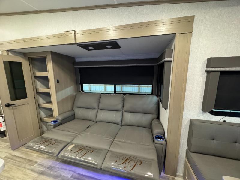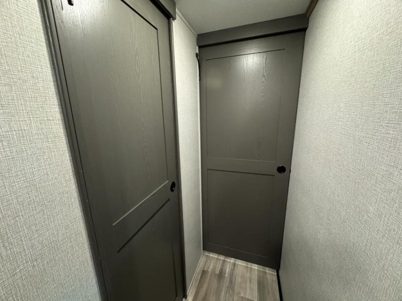 When you are looking for a versatile extra room for either a second bedroom or living area as well as an office, this middle bunkhouse might just work! There is a slide out with two bunks and drawers plus a full size dresser. You can sleep like a queen on the walk-around bed in the front private bedroom that offers more clothing storage and windows for views. The rear main living and kitchen area provides plenty of seating on the a 78" triple person theatre seats, and on the 92" U-shaped lounge with table with windows within the slide for natural lighting and great views. The kitchen island gives the cook more space to make and serve meals, and the gourmet kitchen includes a 16 cu. ft. refrigerator, plus a pantry for dry goods. There is an exterior outside kitchen with a griddle and a 1.6 cu. ft. refrigerator for beverages and such, plus you will find an LP quick connect, Coax TV hookup, and a spray port to wash off your dirty shoes.