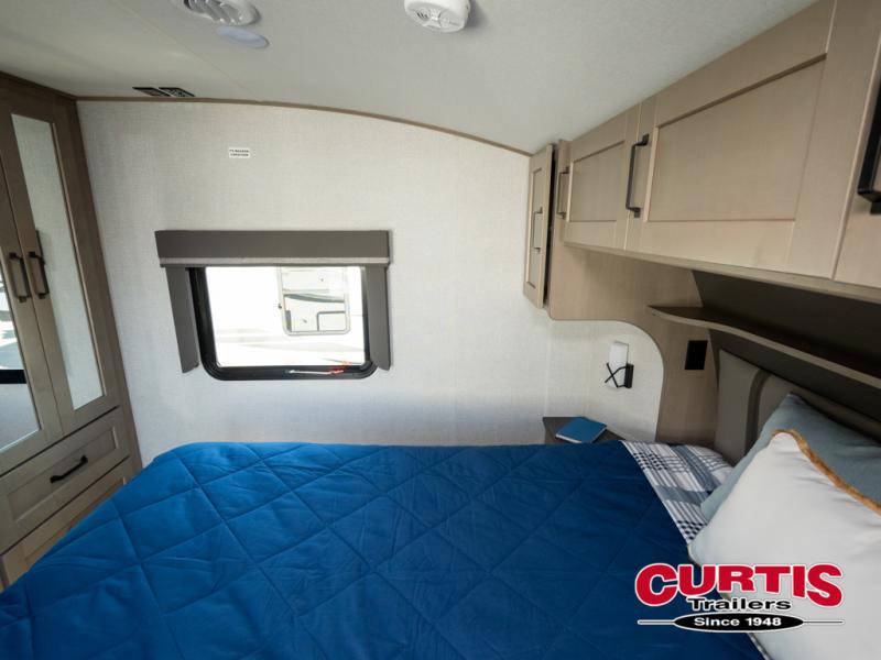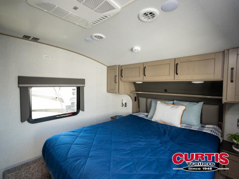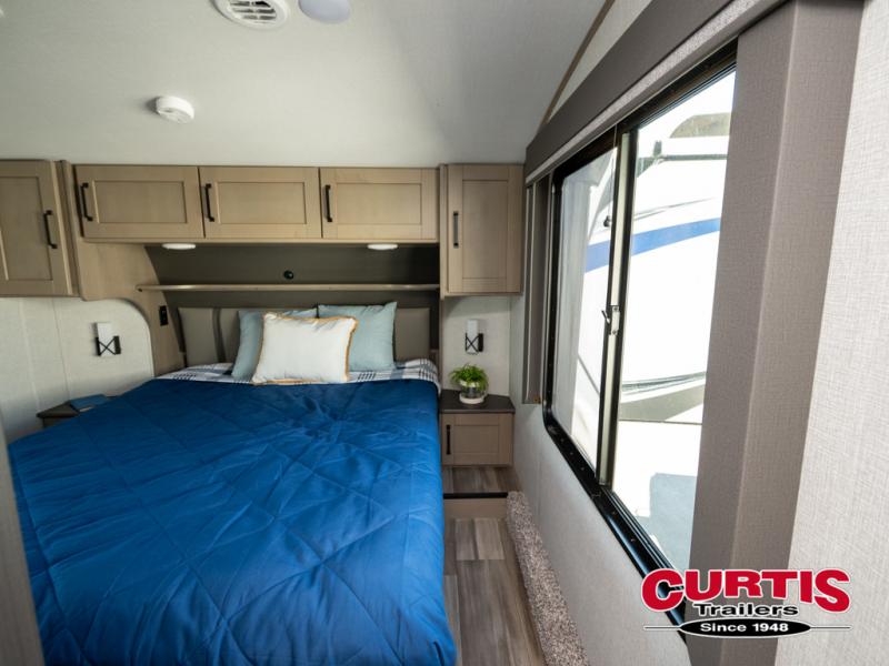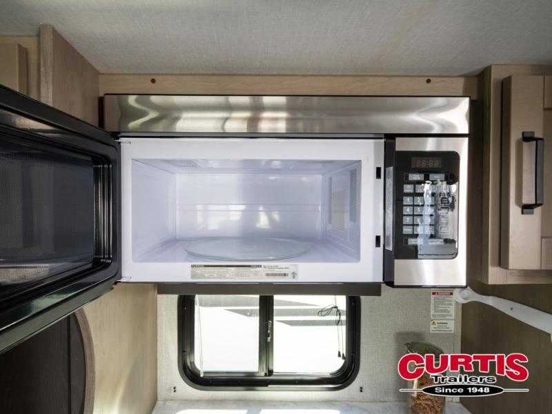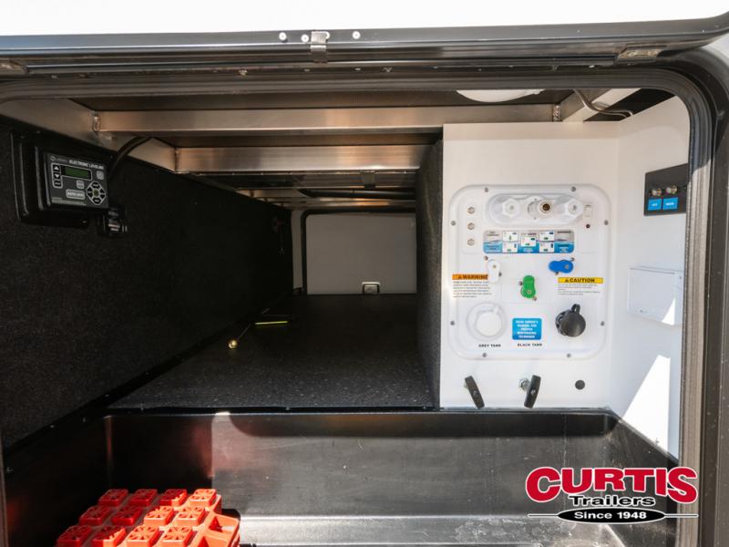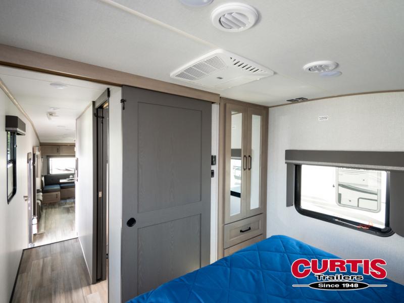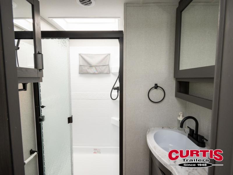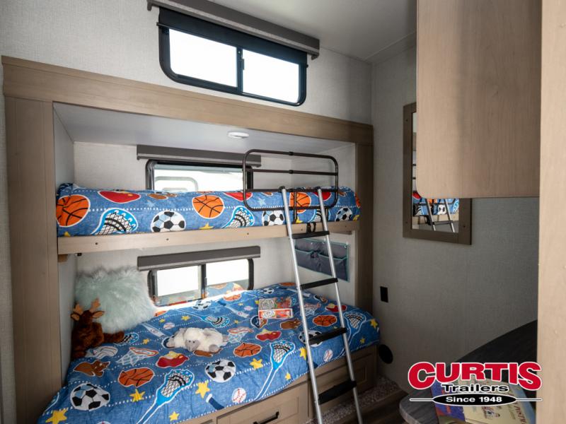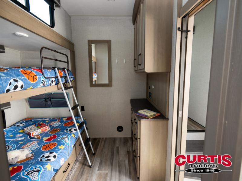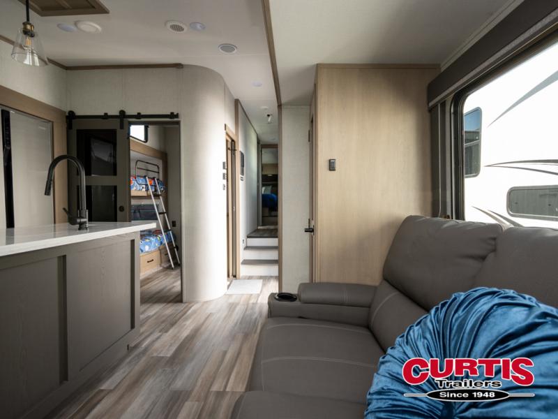 When you are looking for a versatile extra room for either a second bedroom or living area as well as an office, this middle bunkhouse might just work! There is a slide out with two bunks and drawers plus a full size dresser. You can sleep like a queen on the walk-around bed in the front private bedroom that offers more clothing storage and windows for views. The rear main living and kitchen area provides plenty of seating on the a 78" triple person theatre seats, and on the 92" U-shaped lounge with table with windows within the slide for natural lighting and great views. The kitchen island gives the cook more space to make and serve meals, and the gourmet kitchen includes a 16 cu. ft. refrigerator, plus a pantry for dry goods. There is an exterior outside kitchen with a griddle and a 1.6 cu. ft. refrigerator for beverages and such, plus you will find an LP quick connect, Coax TV hookup, and a spray port to wash off your dirty shoes.