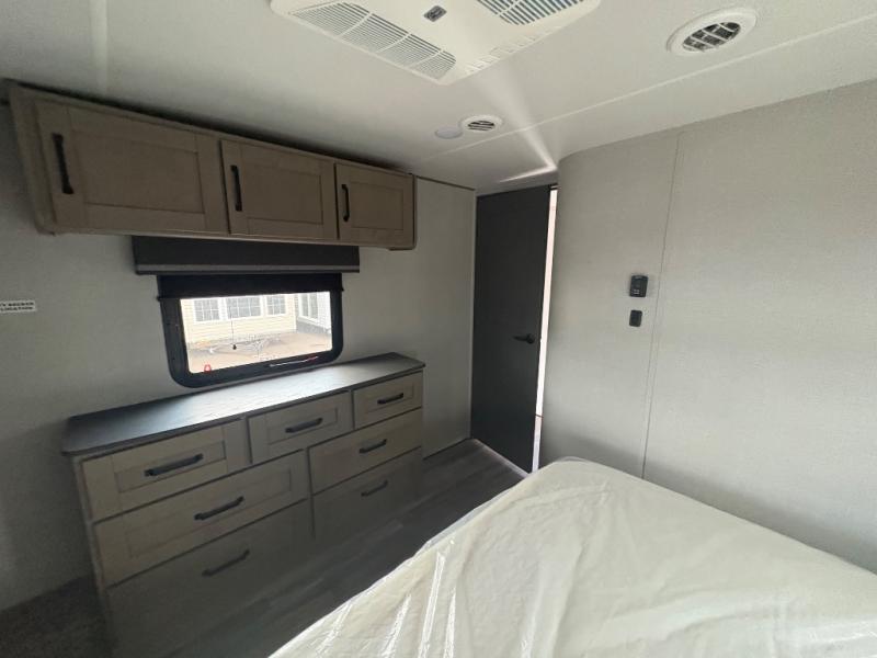 You can enjoy a spacious rear living area in this RV with dual opposing slides offering you entertainment, kitchen amenities, seating and windows for great views! The rear tri-fold sofa also converts into extra sleeping space for an extra guest or two, just like the booth dinette does. Yet you might like to add the free standing dinette option. There are theatre seats to enjoy while you place your drinks in the cupholders and watch the entertainment center with a 40" LED HDTV and fireplace. The pantry is big enough to store your favorite snacks, and the kitchen island will make meal prepping easier, plus there is a 16 cu. ft. refrigerator to store any leftovers. The full bathroom has a 30" x 48" fiberglass shower with a skylight above for natural lighting as you get ready and a linen closet to store your towels. The front private bedroom has a comfortable queen bed slide that can be switched out for the optional king bed, a dresser with overhead cabinets, and a full wall wardrobe that is prepped to add the optional washer and dryer so that you can extend your camping trip with clean clothes!