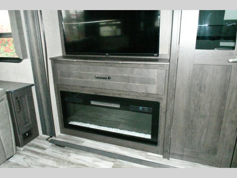 The rear living area is open, bright, and ideal for relaxing or entertaining. Dual opposing slides create a wide, inviting space featuring theater seating with cupholders, a rear tri-fold sofa that easily converts into additional sleeping space, and an impressive entertainment center with a 40" LED HDTV and fireplace. Large windows surround the living area, providing excellent natural light and scenic campground views.