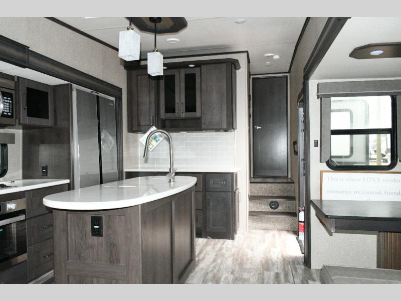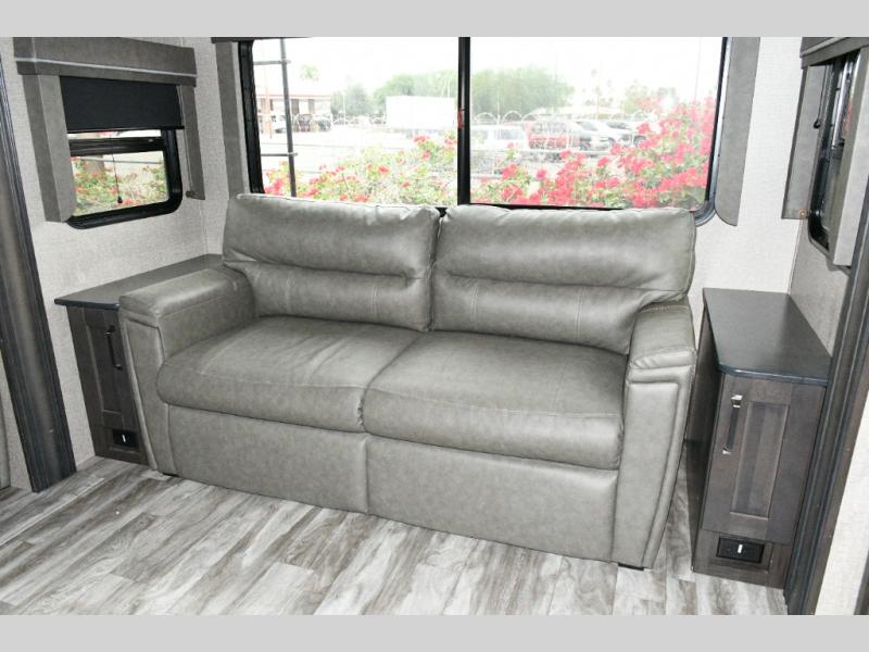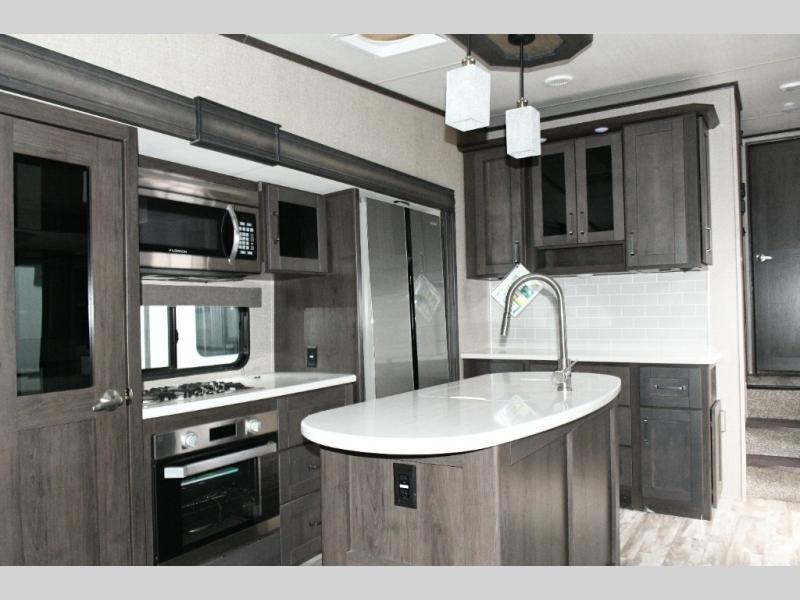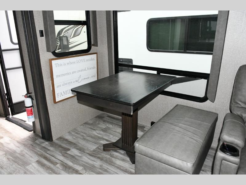 The chef-inspired kitchen is designed for both functionality and style. A center kitchen island makes meal prep easy, while the hutch and large pantry offer exceptional storage for cookware, dishes, and snacks. The 16 cu. ft. refrigerator provides residential capacity, perfect for extended trips, and solid-surface countertops paired with premium Congoleum flooring give the space an upscale, durable feel. A booth dinette offers additional seating and sleeping space, with the option to upgrade to a free-standing dinette for a more residential dining experience.