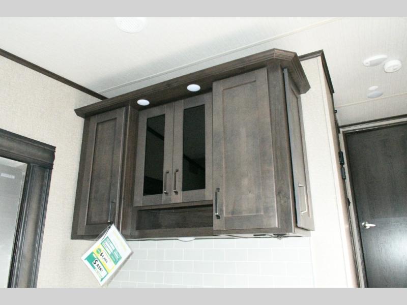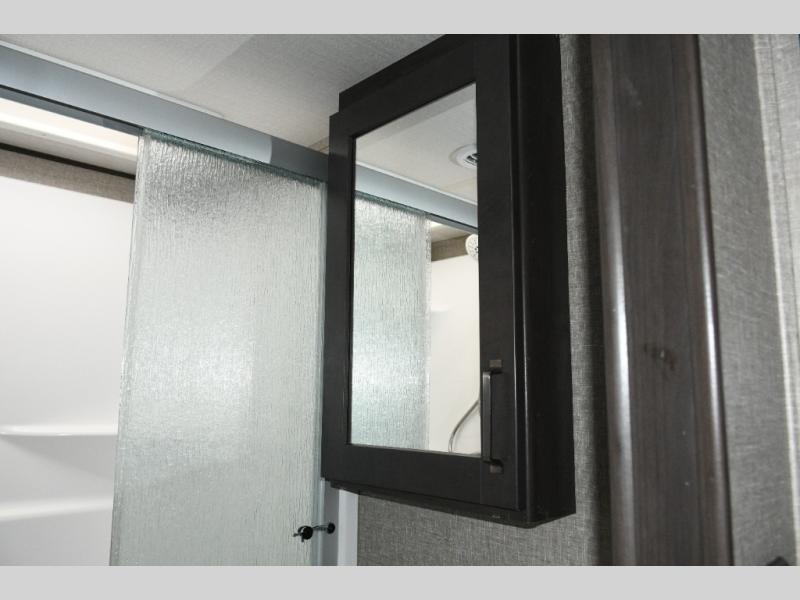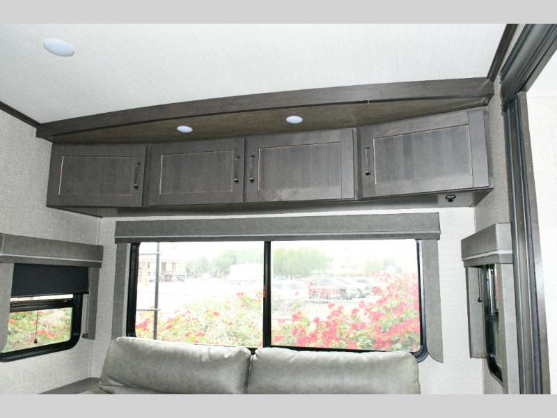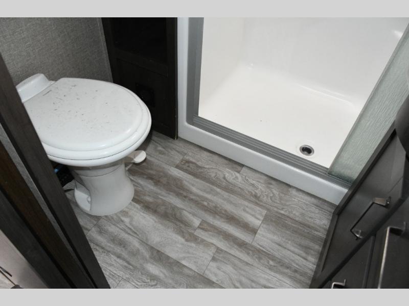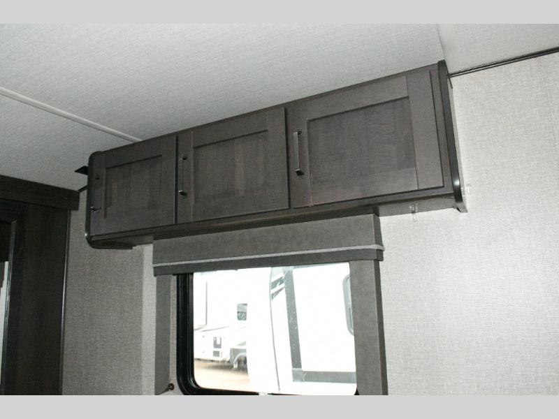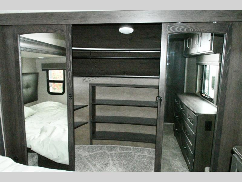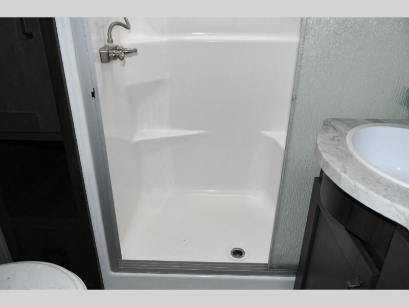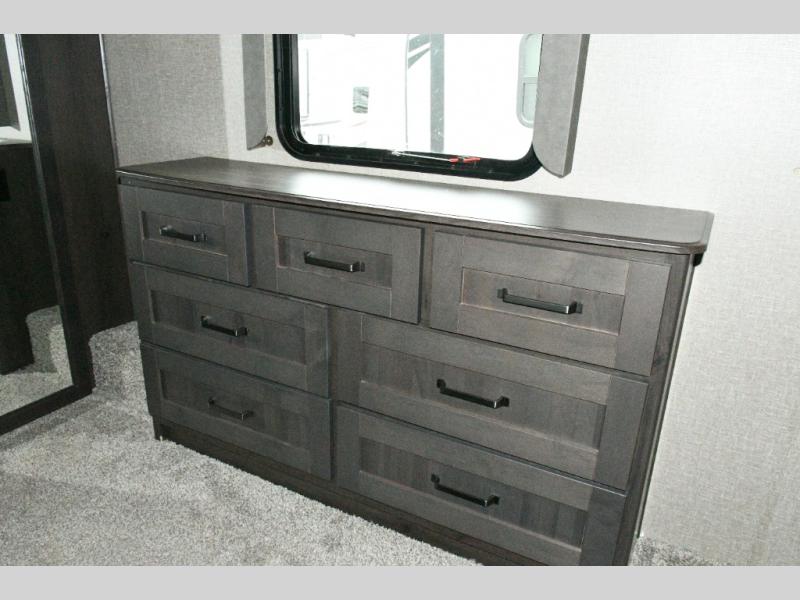 The spacious bathroom includes a 30" x 48" fiberglass shower with skylight, a linen closet for towels and supplies, and plenty of room to get ready comfortably. At the front of the coach, the private master bedroom features a queen bed slide (with optional king bed capability), a dresser with overhead cabinets, and a full-wall wardrobe prepped for a washer and dryer, making this fifth wheel ideal for long-term travel.