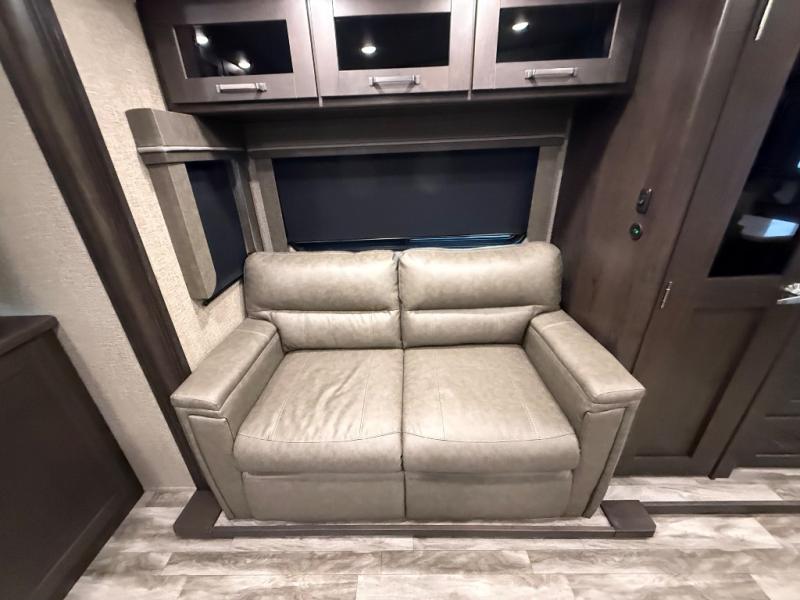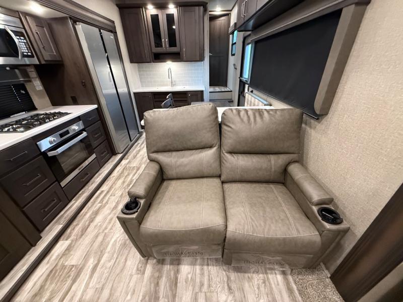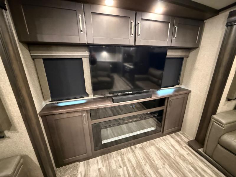 Looking for a separate living area from the kitchen in your next RV? Do you want to be able to entertain while camping? Well this fifth wheel has what you want, plus much more! The rear living area has two opposing tri-fold sofas, and theatre seating directly across from the rear entertainment center with a 50" LED HDTV and a 48" fireplace below it, plus windows and storage. The middle kitchen area offers the cook a large pantry, a 16 cu. ft. refrigerator, and extra counter space around the deep seated stainless steel sink. And there is a free standing adjustable dinette with a storage ottoman and more counter space nearby giving you a place for your things while dining, playing games, or even working. The full bathroom can be accessed from the hallway that leads to the front bedroom which offers a queen bed slide or choose a king option, a dresser with window above, plus a full wall wardrobe with a place to add a washer/dryer option to keep everything clean while away.