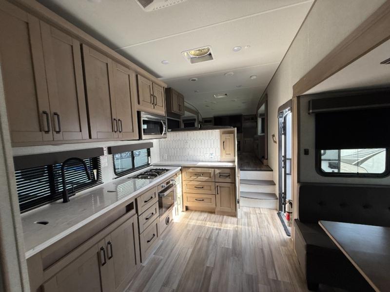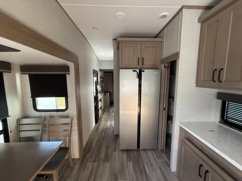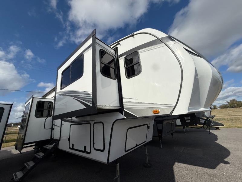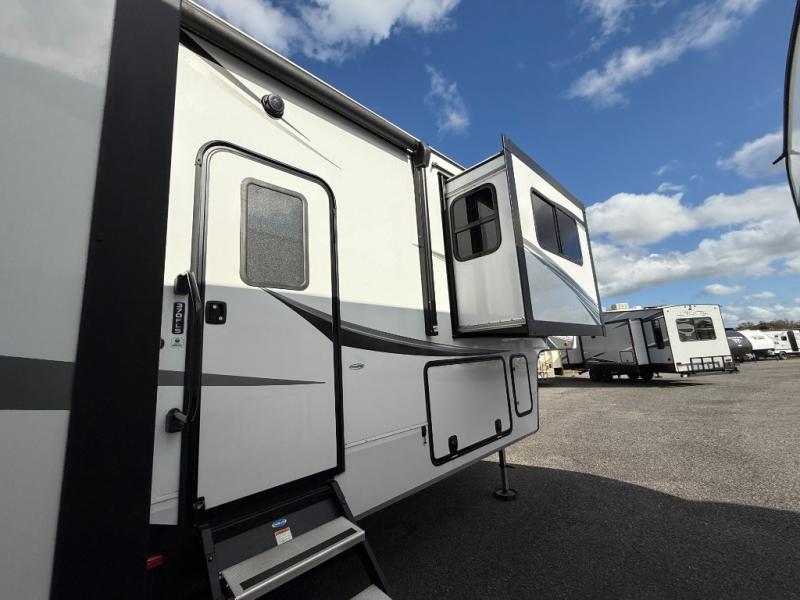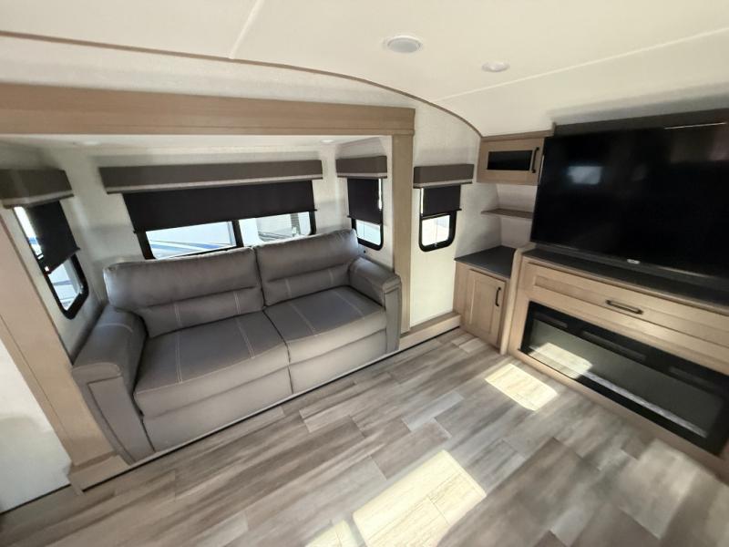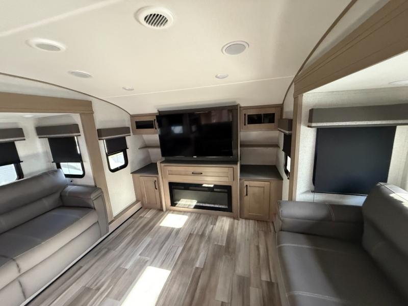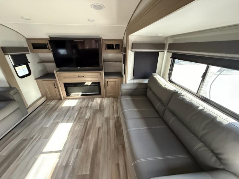 You and your spouse will love having this fifth wheel on your next camping adventure! Get a good night's rest each night on the queen bed slide in the rear private bedroom with TV prep across from the bed, and freshen up each morning in the full bathroom with the 30" x 48" fiberglass shower. You can enjoy home cooked meals made using the three burner cooktop and 16 cu. ft. refrigerator in the full kitchen, and eat them at the slide out free standing dinette table featuring two chairs and an ottoman with storage. You even have a hutch to store your dishes in, and a TV prep area so you can add a TV to watch a show while you cook. The front living area offers a comfortable place to wind down your nights by relaxing in front of the fireplace on either one of the opposing tri-fold sofa slides or the theater seating!