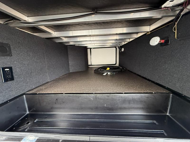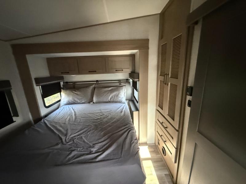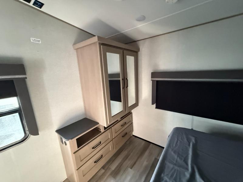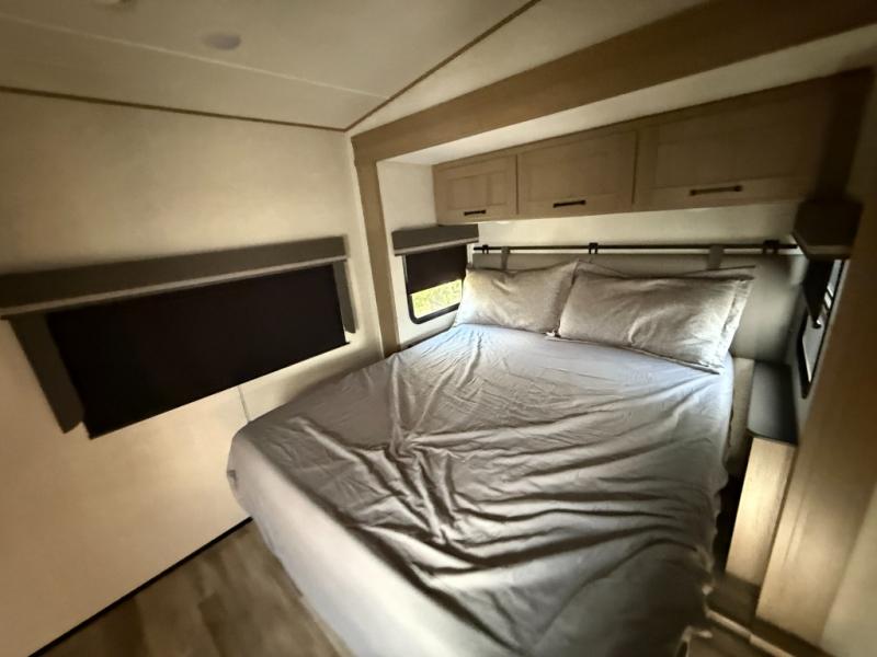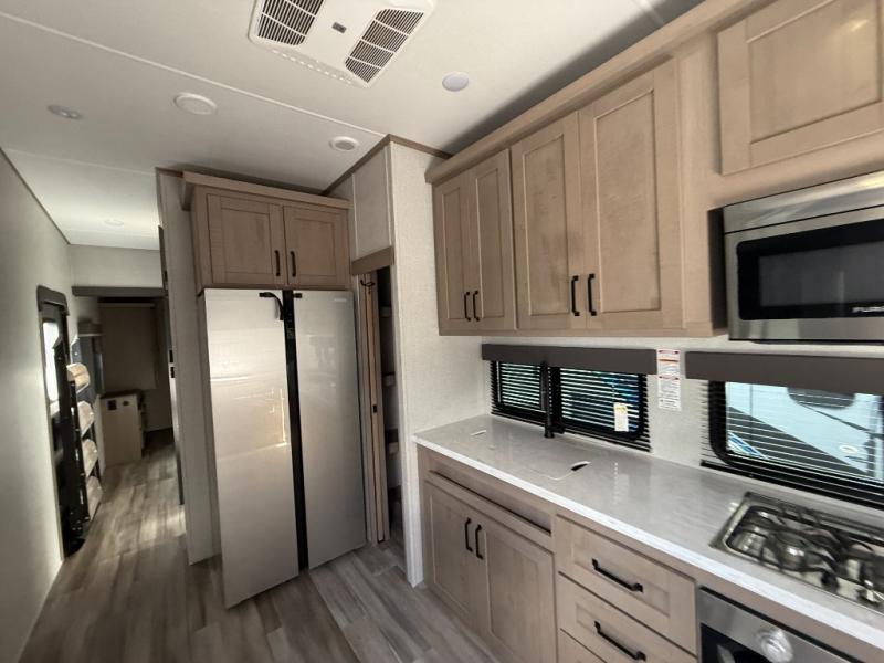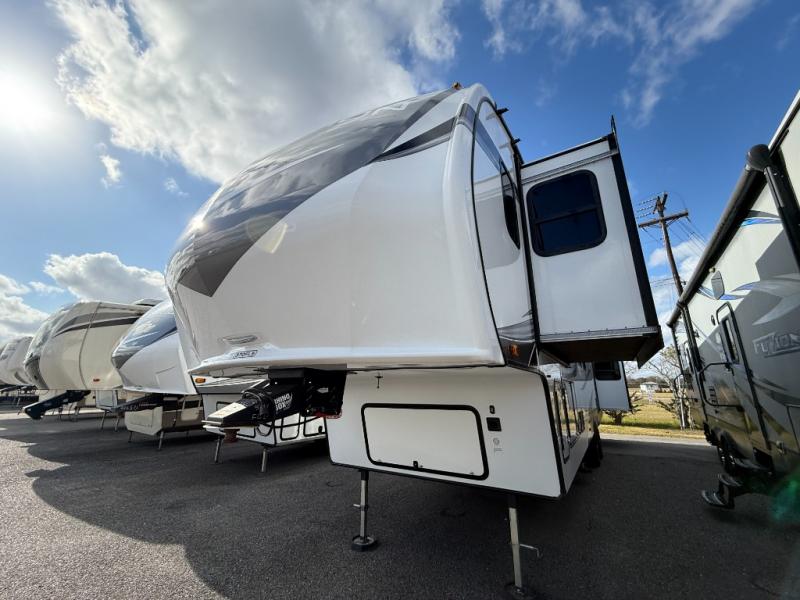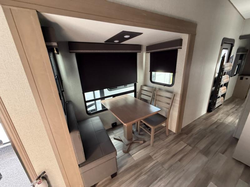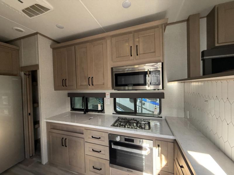 You and your spouse will love having this fifth wheel on your next camping adventure! Get a good night's rest each night on the queen bed slide in the rear private bedroom with TV prep across from the bed, and freshen up each morning in the full bathroom with the 30" x 48" fiberglass shower. You can enjoy home cooked meals made using the three burner cooktop and 16 cu. ft. refrigerator in the full kitchen, and eat them at the slide out free standing dinette table featuring two chairs and an ottoman with storage. You even have a hutch to store your dishes in, and a TV prep area so you can add a TV to watch a show while you cook. The front living area offers a comfortable place to wind down your nights by relaxing in front of the fireplace on either one of the opposing tri-fold sofa slides or the theater seating!