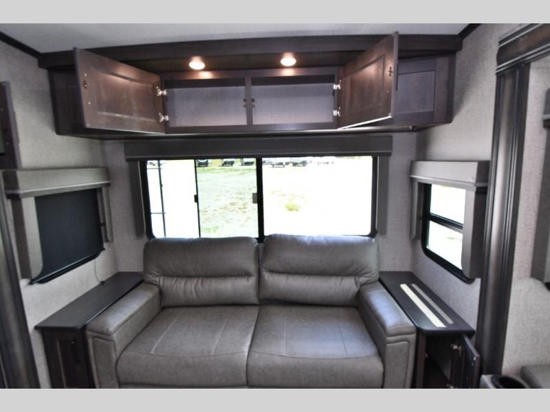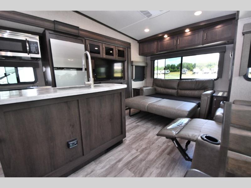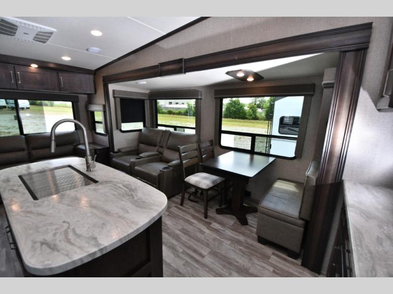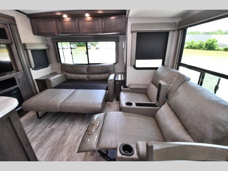 Step inside the pre-owned 2023 Grand Design Reflection M-280RS and discover a fifth wheel built for relaxation and fun. The main living area is enhanced by opposing slides, creating a spacious kitchen and lounge space. The kitchen features a large island, hutch with extra counter and storage space, and a 10 cu. ft. refrigerator to store meals and snacks. Guests can sleep comfortably on the tri-fold sofa, and the theatre seating provides prime viewing of the 40" LED HDTV and fireplace below. The full bathroom with walk-in shower makes mornings simple, and the front bedroom with a queen bed provides a restful retreat after a day of adventure.