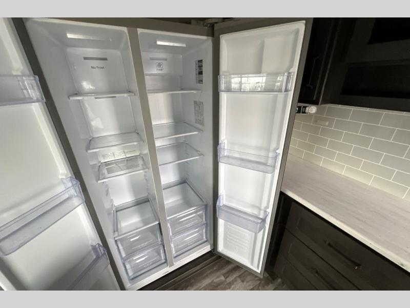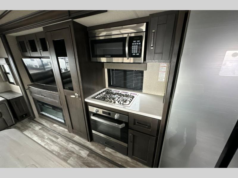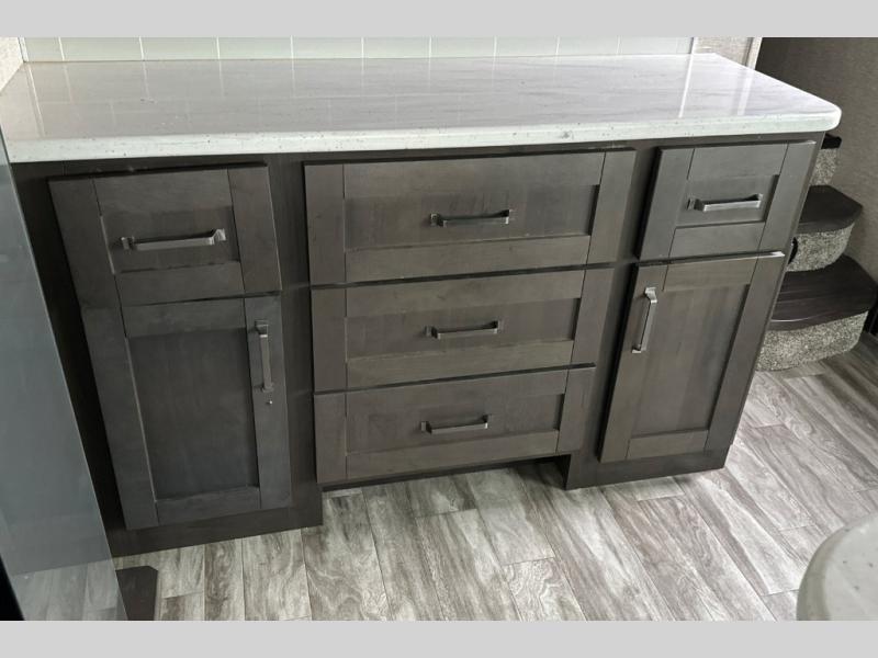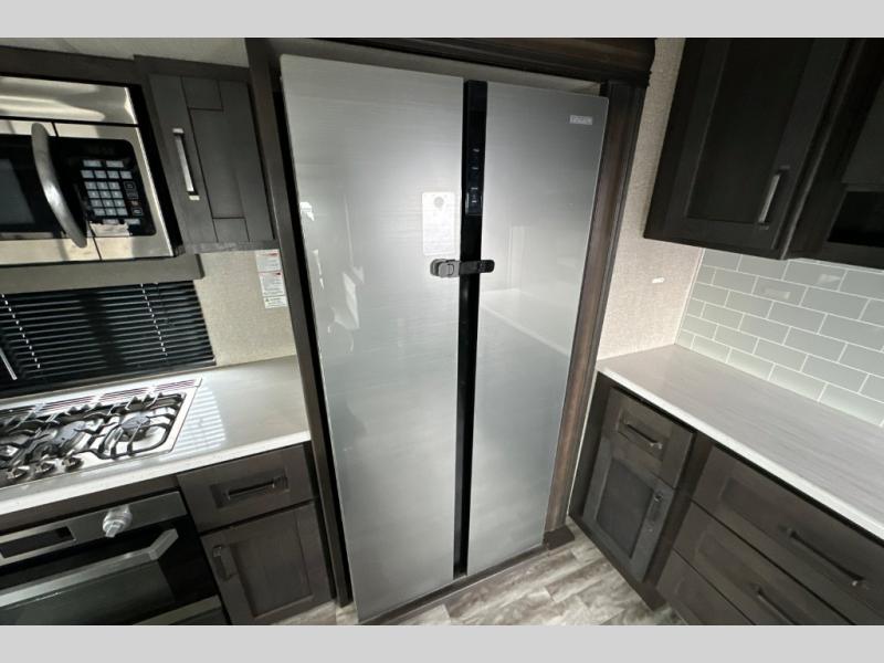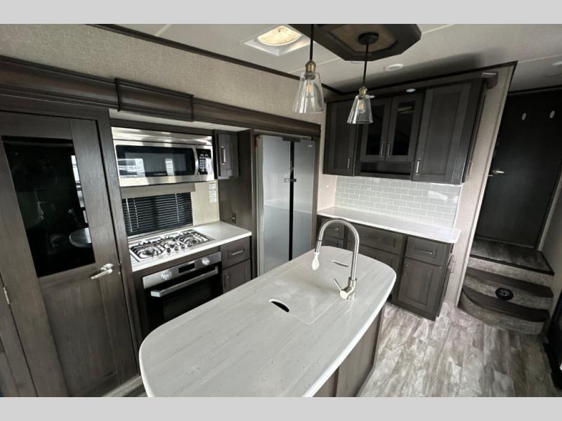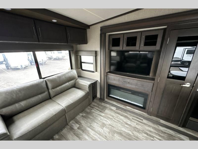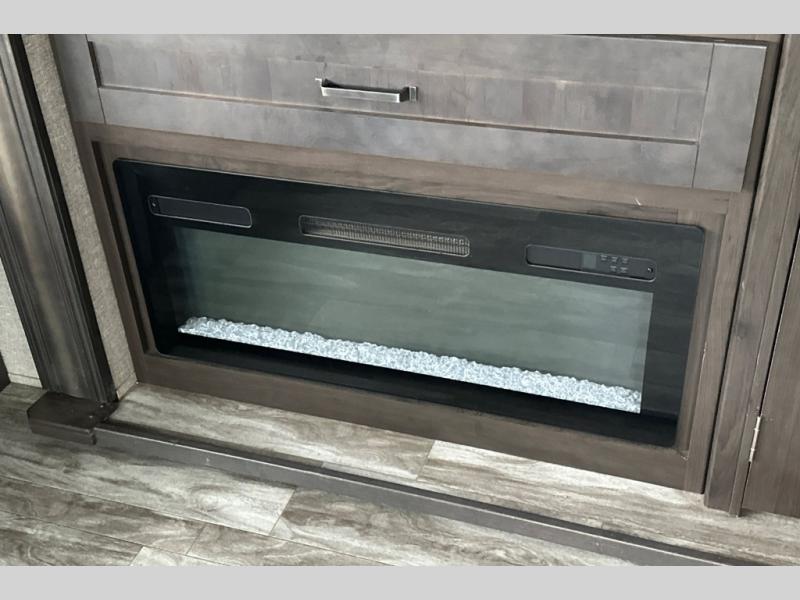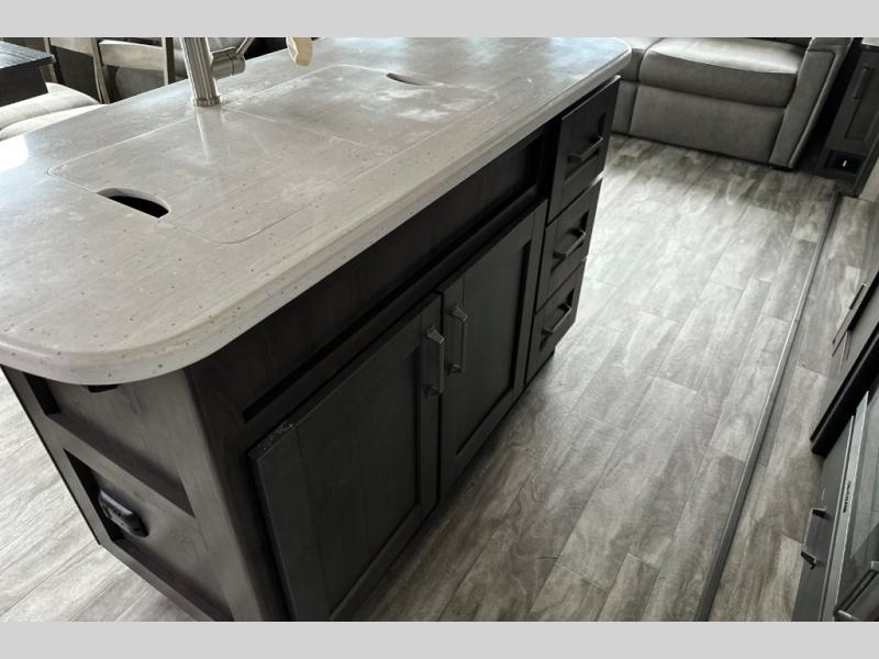 You can enjoy a spacious rear living area in this RV with dual opposing slides offering you entertainment, kitchen amenities, seating and windows for great views! The rear tri-fold sofa also converts into extra sleeping space for an extra guest or two, just like the booth dinette does. Yet you might like to add the free standing dinette option. There are theatre seats to enjoy while you place your drinks in the cupholders and watch the entertainment center with a 40" LED HDTV and fireplace. The pantry is big enough to store your favorite snacks, and the kitchen island will make meal prepping easier, plus there is a 16 cu. ft. refrigerator to store any leftovers. The full bathroom has a 30" x 48" fiberglass shower with a skylight above for natural lighting as you get ready and a linen closet to store your towels. The front private bedroom has a comfortable queen bed slide that can be switched out for the optional king bed, a dresser with overhead cabinets, and a full wall wardrobe that is prepped to add the optional washer and dryer so that you can extend your camping trip with clean clothes!