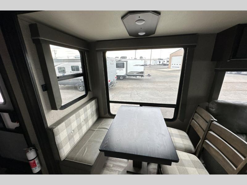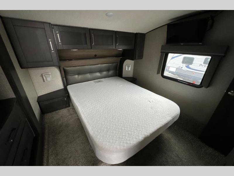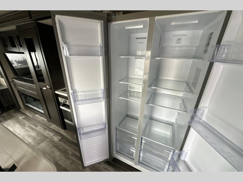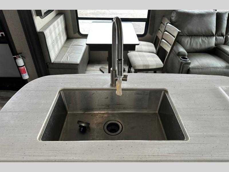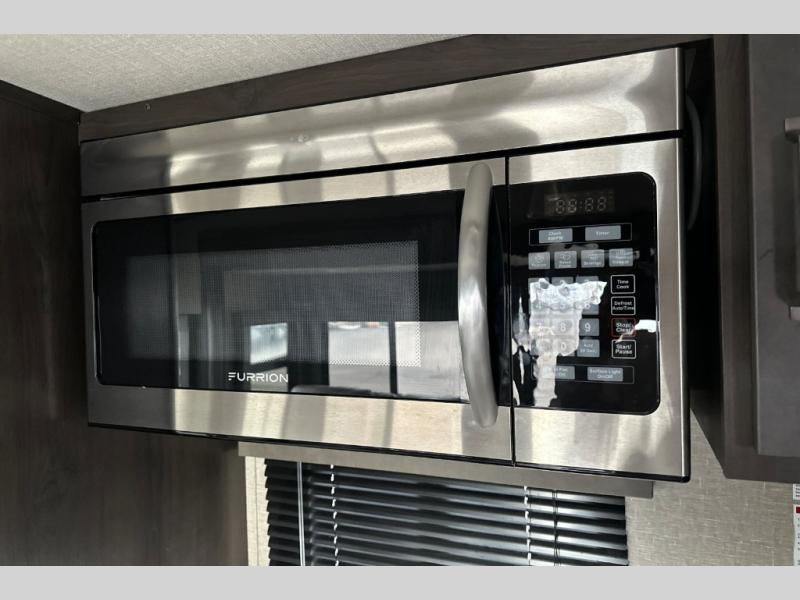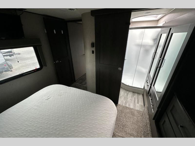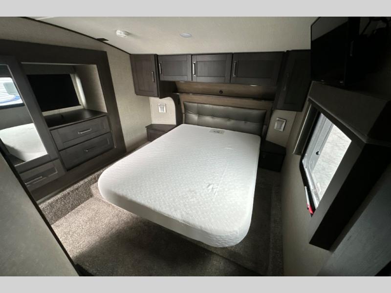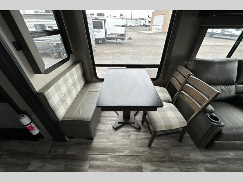 You can enjoy a spacious rear living area in this RV with dual opposing slides offering you entertainment, kitchen amenities, seating and windows for great views! The rear tri-fold sofa also converts into extra sleeping space for an extra guest or two, just like the booth dinette does. Yet you might like to add the free standing dinette option. There are theatre seats to enjoy while you place your drinks in the cupholders and watch the entertainment center with a 40" LED HDTV and fireplace. The pantry is big enough to store your favorite snacks, and the kitchen island will make meal prepping easier, plus there is a 16 cu. ft. refrigerator to store any leftovers. The full bathroom has a 30" x 48" fiberglass shower with a skylight above for natural lighting as you get ready and a linen closet to store your towels. The front private bedroom has a comfortable queen bed slide that can be switched out for the optional king bed, a dresser with overhead cabinets, and a full wall wardrobe that is prepped to add the optional washer and dryer so that you can extend your camping trip with clean clothes!