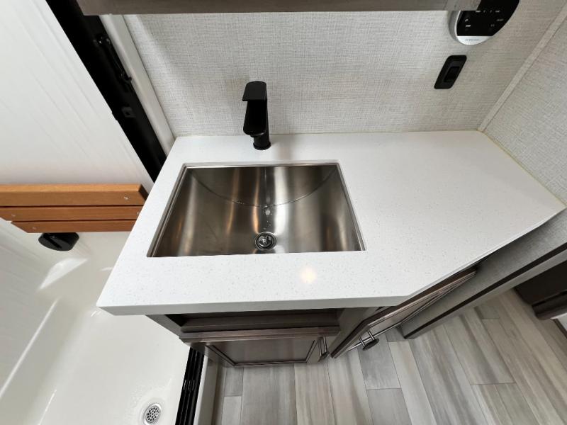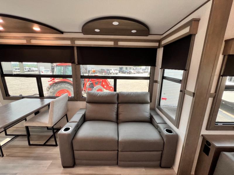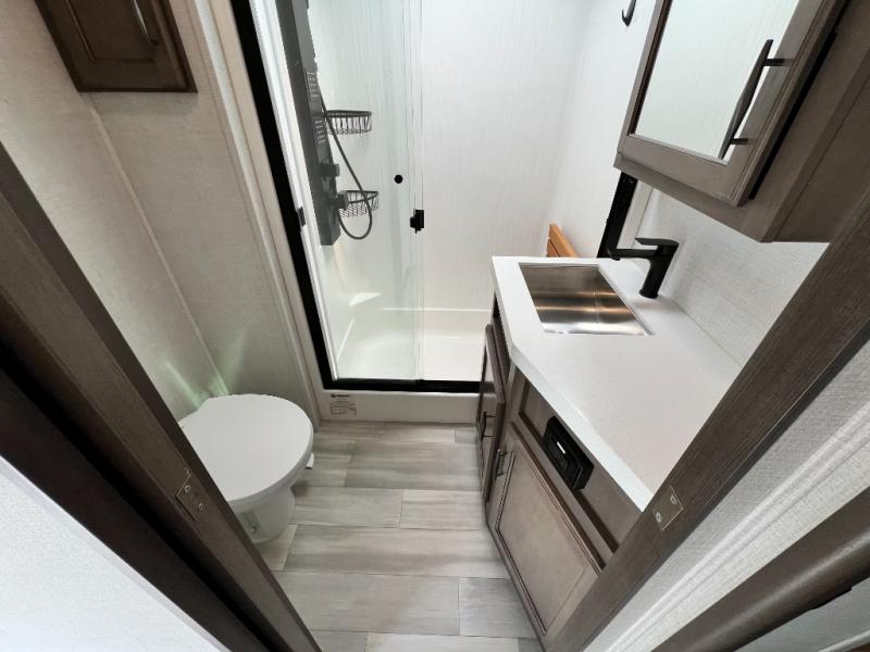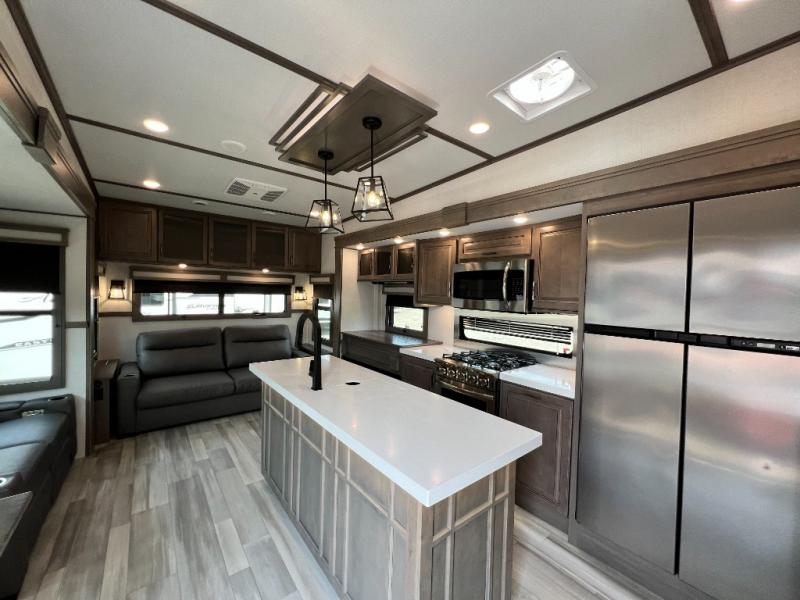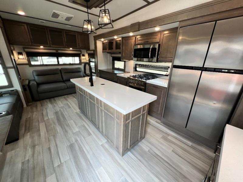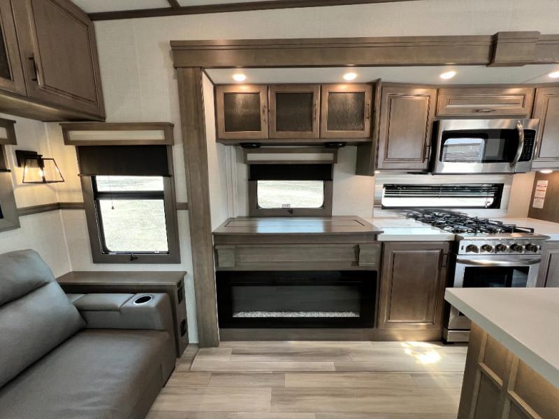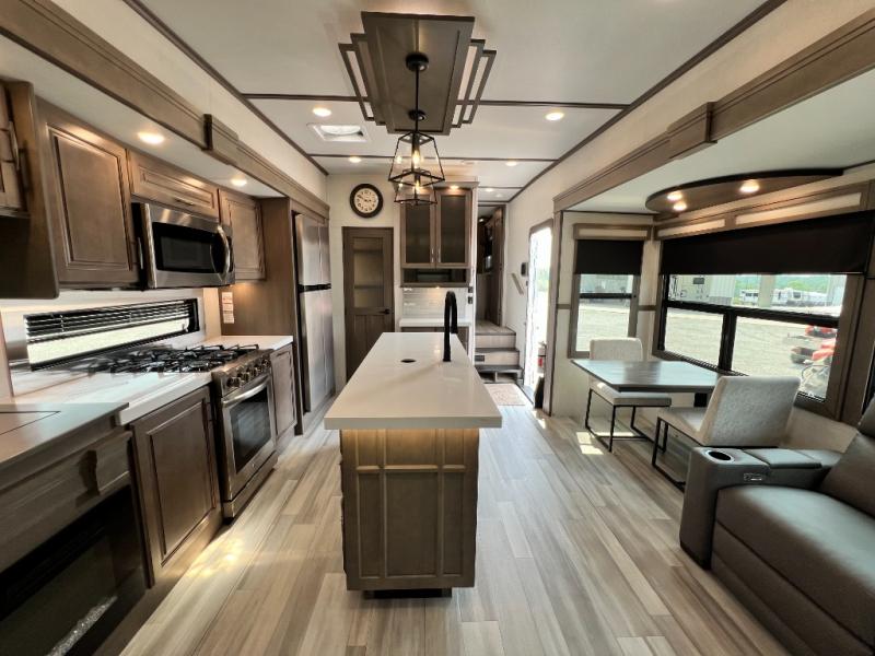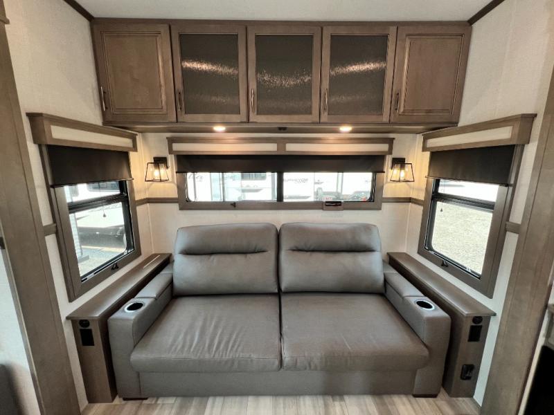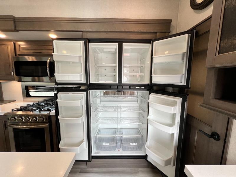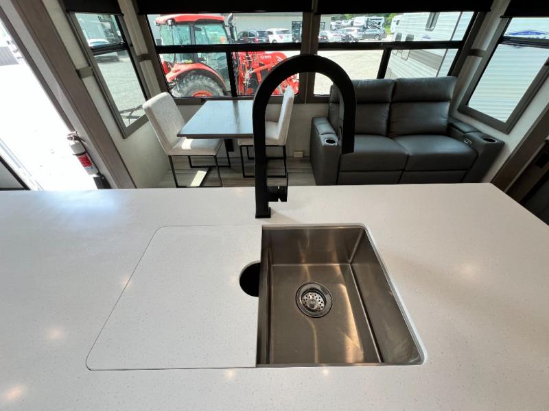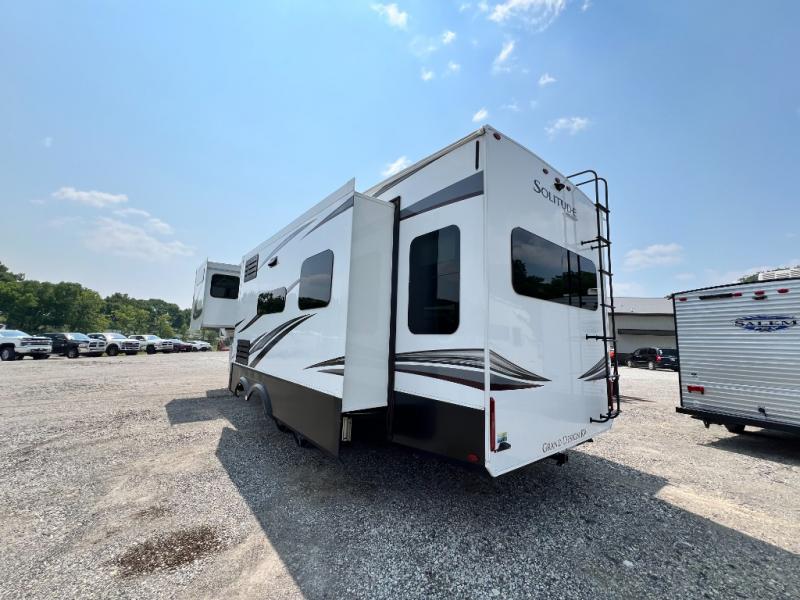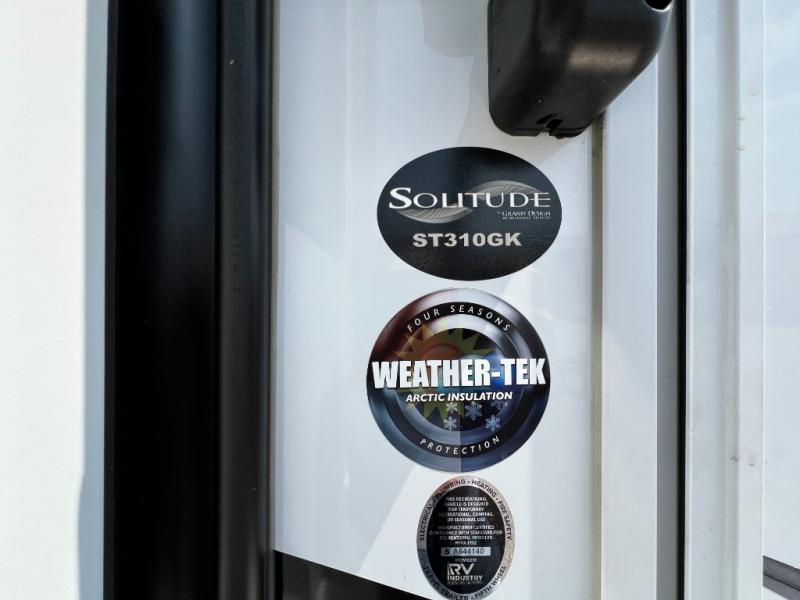 Each Solitude fifth wheel by Grand Design features a 101" wide-body construction, heavy duty 7,000 lb. axles, frameless tinted windows, and high-gloss gel coat sidewalls. You can camp year around thanks to the Weather-Tek Package that includes a 35K BTU high-capacity furnace, an all-in-one enclosed and heated utility center, and a fully enclosed underbelly with heated tanks and storage. Inside, you'll love the premium roller shades, hardwood cabinet doors, solid surface countertops and sinks, plus residential finishes throughout to make you truly feel at home. Each model also includes a MORryde CRE3000 suspension system, self adjusting brakes, and a MORryde pin box that will provide smooth towing from home to campground. Affordable luxury is possible with the Solitude fifth wheels; choose yours today!