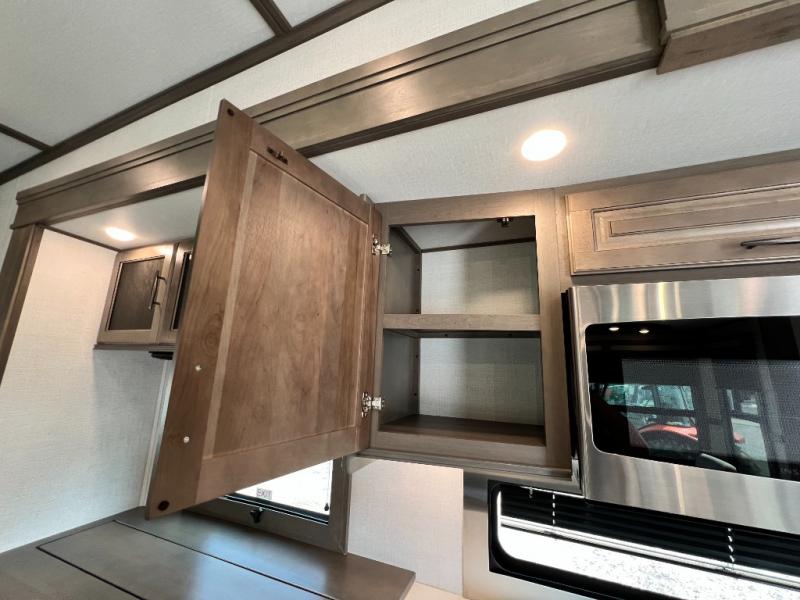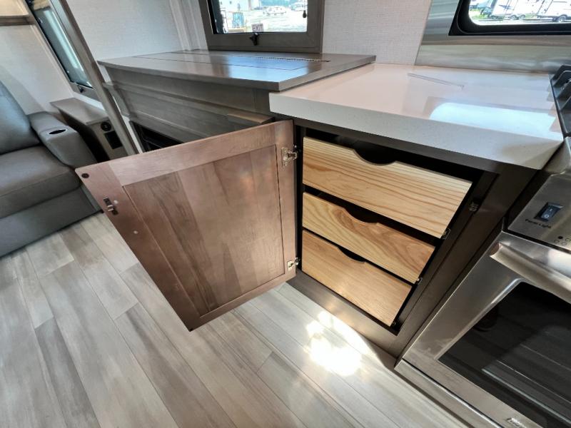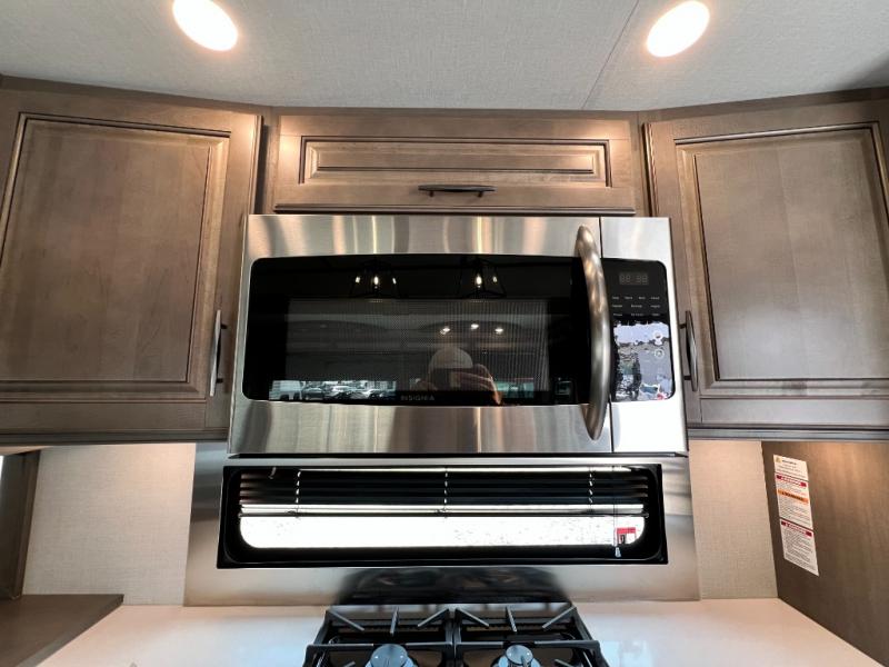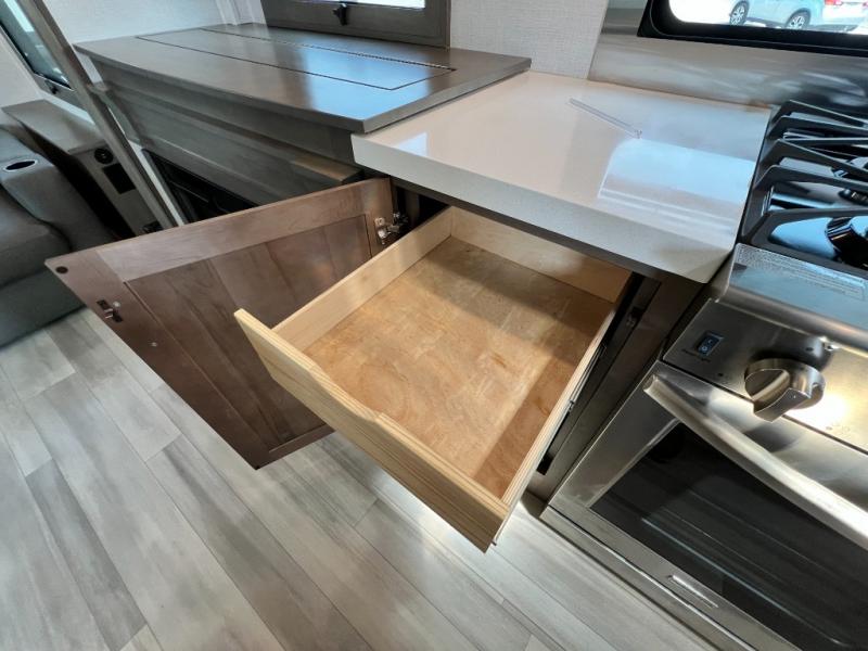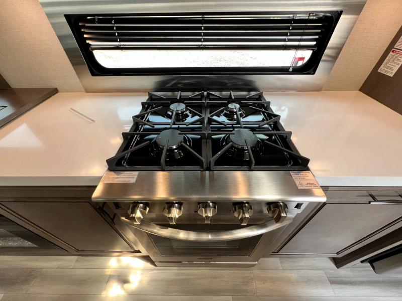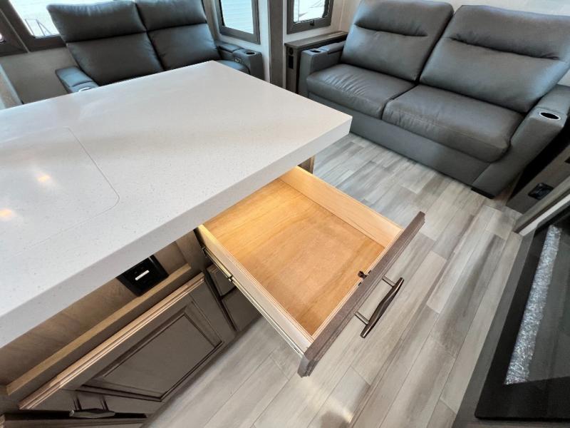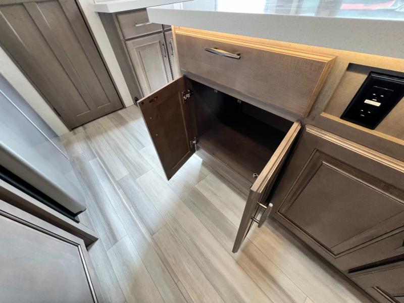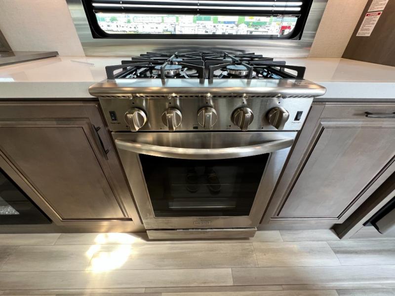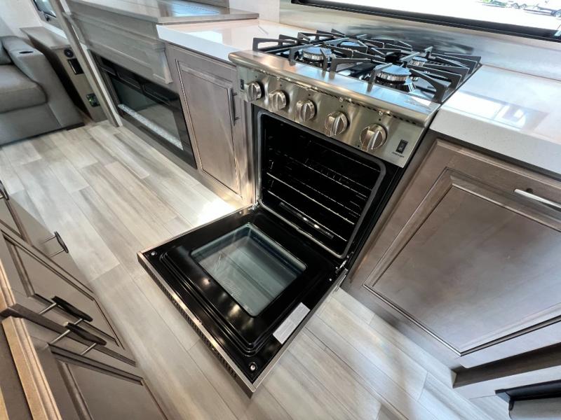 Traveling for long periods at a time is made easy with this gourmet kitchen that can feed your entire group a holiday meal! The professional-grade stainless steel cooktop with a built-in 24" residential oven, microwave, 12V 20 cu. ft. refrigerator, and a kitchen island offers everything you will need to enjoy cooking for your family and guests. There is abundant storage throughout multiple overhead cabinets, a kitchen pantry and hutch, show storage under the interior steps, a bath linen cabinet for your towels, and in the front master bedroom which features a large closet. In the bedroom there is also a queen bed on a slide for added space to sleep comfortable at night, or you may choose an optional king bed if you enjoy more space. You will also find a closet prepped for an optional washer/dryer, large wardrobe, plus a flip-top dresser with an LED TV above. In the bathroom, enjoy a hot shower with a flip-up teak seat and overhead skylight, plus a vanity with sink. Two nice awnings will provide outdoor living space keeping you protected from the sun and rain, and you can add an optional pull-out kitchen to enjoy convenient cooking outdoors as well.