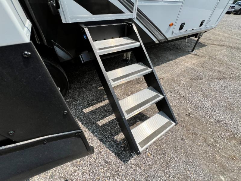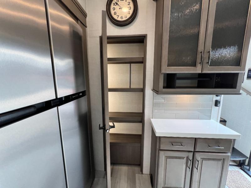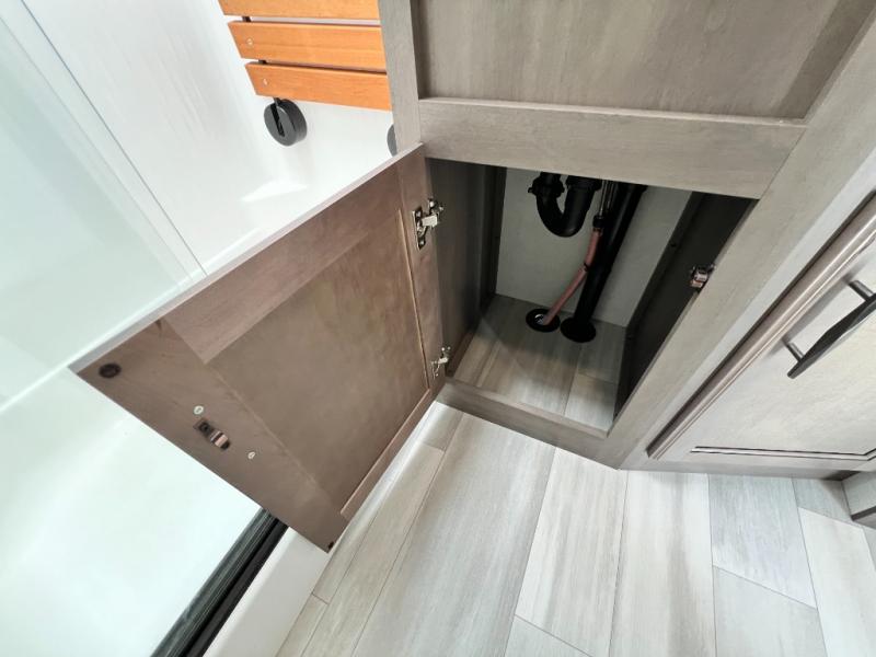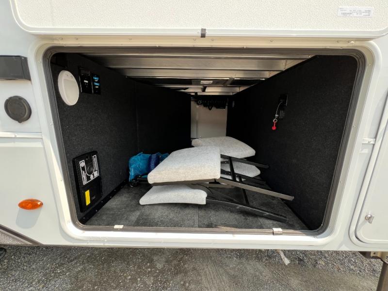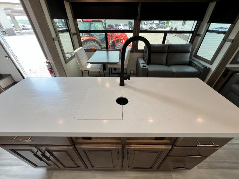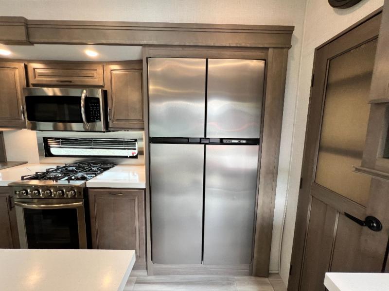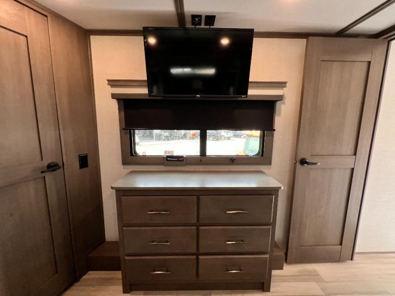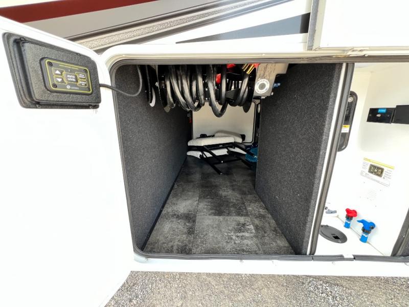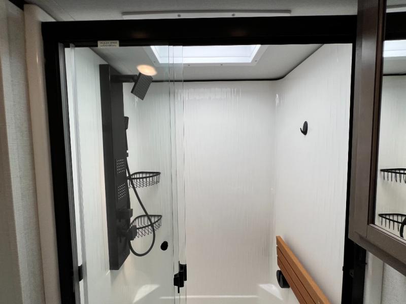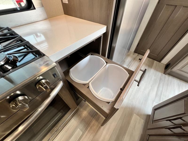 Traveling for long periods at a time is made easy with this gourmet kitchen that can feed your entire group a holiday meal! The professional-grade stainless steel cooktop with a built-in 24" residential oven, microwave, 12V 20 cu. ft. refrigerator, and a kitchen island offers everything you will need to enjoy cooking for your family and guests. There is abundant storage throughout multiple overhead cabinets, a kitchen pantry and hutch, show storage under the interior steps, a bath linen cabinet for your towels, and in the front master bedroom which features a large closet. In the bedroom there is also a queen bed on a slide for added space to sleep comfortable at night, or you may choose an optional king bed if you enjoy more space. You will also find a closet prepped for an optional washer/dryer, large wardrobe, plus a flip-top dresser with an LED TV above. In the bathroom, enjoy a hot shower with a flip-up teak seat and overhead skylight, plus a vanity with sink. Two nice awnings will provide outdoor living space keeping you protected from the sun and rain, and you can add an optional pull-out kitchen to enjoy convenient cooking outdoors as well.