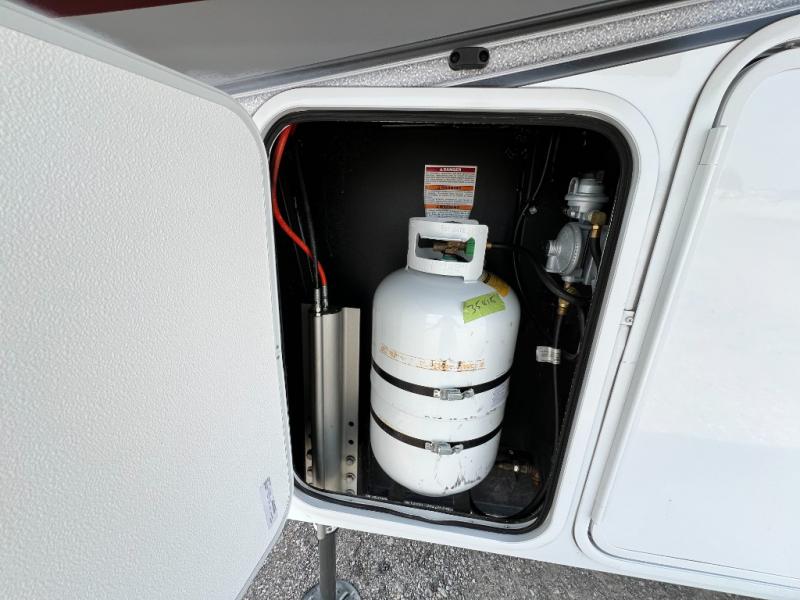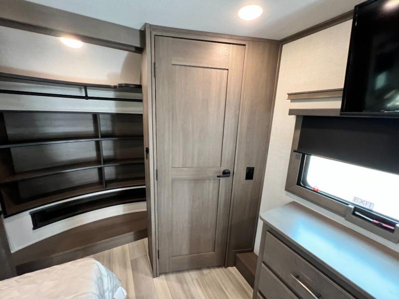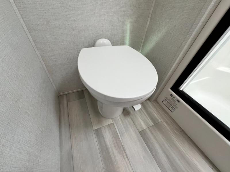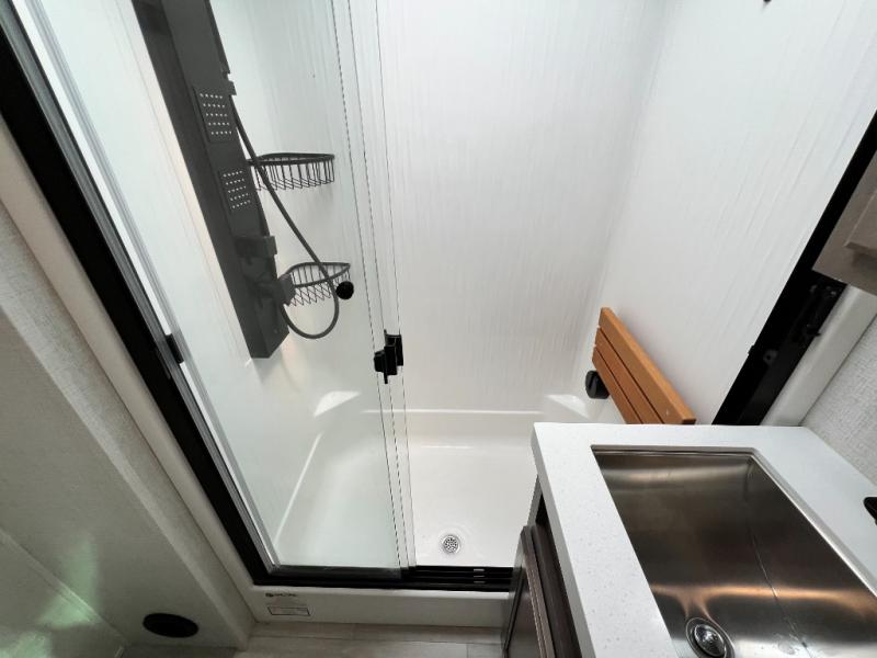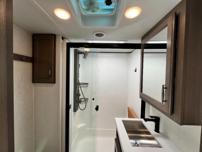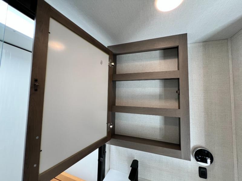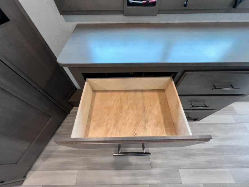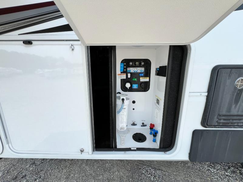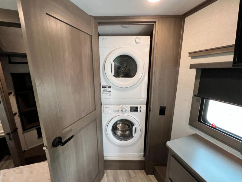 Traveling for long periods at a time is made easy with this gourmet kitchen that can feed your entire group a holiday meal! The professional-grade stainless steel cooktop with a built-in 24" residential oven, microwave, 12V 20 cu. ft. refrigerator, and a kitchen island offers everything you will need to enjoy cooking for your family and guests. There is abundant storage throughout multiple overhead cabinets, a kitchen pantry and hutch, show storage under the interior steps, a bath linen cabinet for your towels, and in the front master bedroom which features a large closet. In the bedroom there is also a queen bed on a slide for added space to sleep comfortable at night, or you may choose an optional king bed if you enjoy more space. You will also find a closet prepped for an optional washer/dryer, large wardrobe, plus a flip-top dresser with an LED TV above. In the bathroom, enjoy a hot shower with a flip-up teak seat and overhead skylight, plus a vanity with sink. Two nice awnings will provide outdoor living space keeping you protected from the sun and rain, and you can add an optional pull-out kitchen to enjoy convenient cooking outdoors as well.
