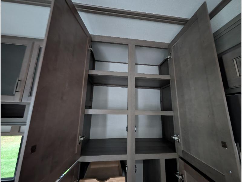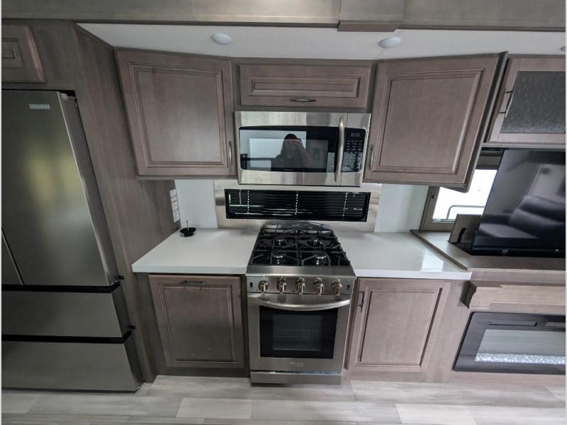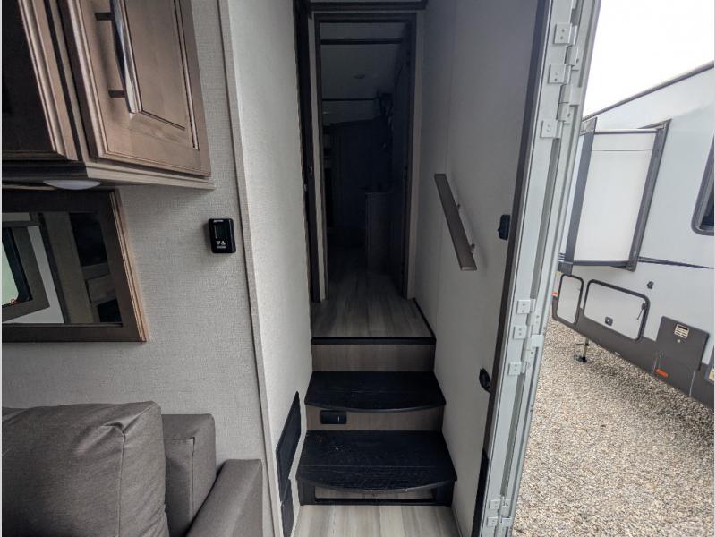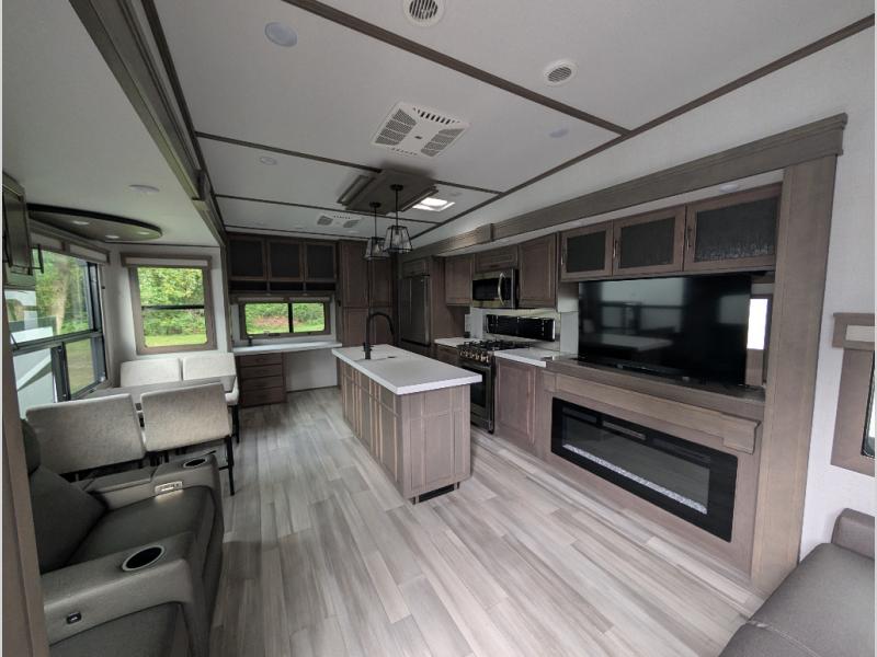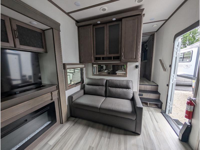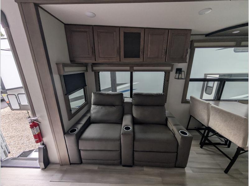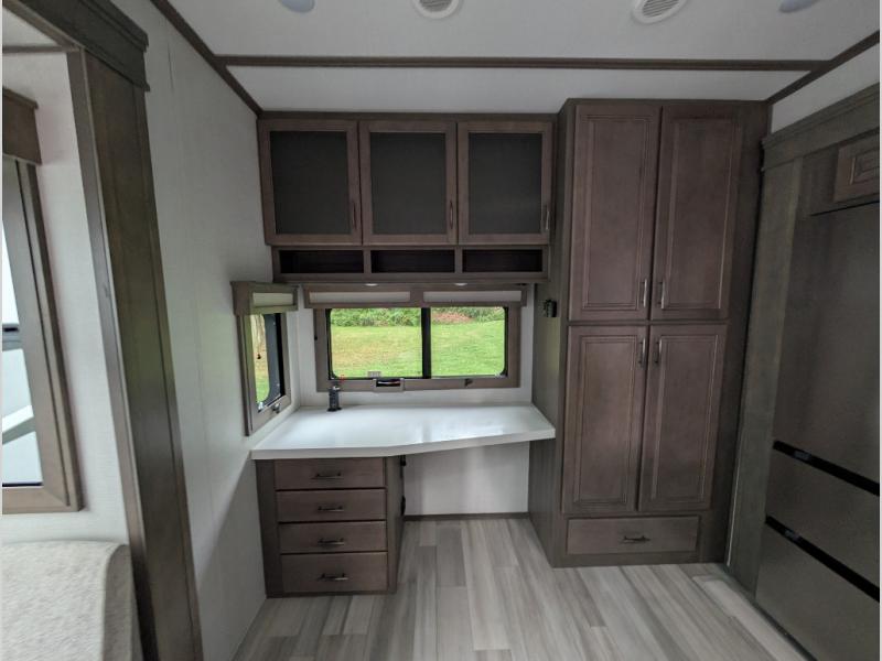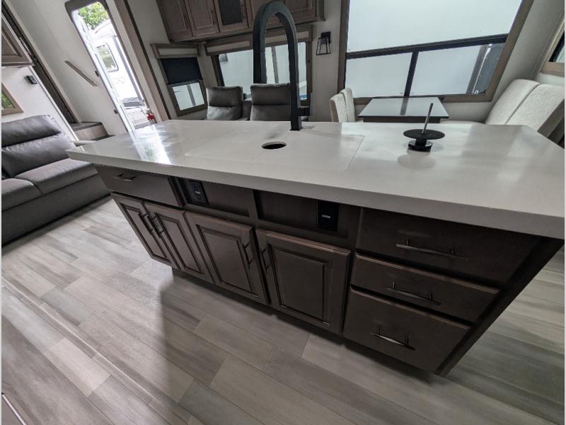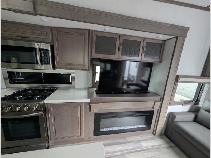 Love for traveling is enhanced when you are towing this fifth wheel. From the smooth tow to the comfortable and functional interior, you will feel right at home. You can even work at the rear desk with USB charging outlet and overhead cabinets or at the free-standing dinette with chairs while away, and relax on the theatre seats or the tri-fold sofa. The TV and fireplace add conveniences and comfort, and the kitchen is impressive with a 24" residential oven, island with a space for a dishwasher option, and oversized pantry. And you might like to add the exterior pull-out kitchen option for more choices when making meals. Be sure to place your shoes under the interior steps before heading to the full bathroom to get cleaned up or the front bedroom. The bedroom features a queen bed slide, or optional king, more USB charging outlets for your electronics, and a walk-in closet with mirrors plus a space prepped for an optional washer/dryer. You will also find a flip-top dresser with an LED TV.