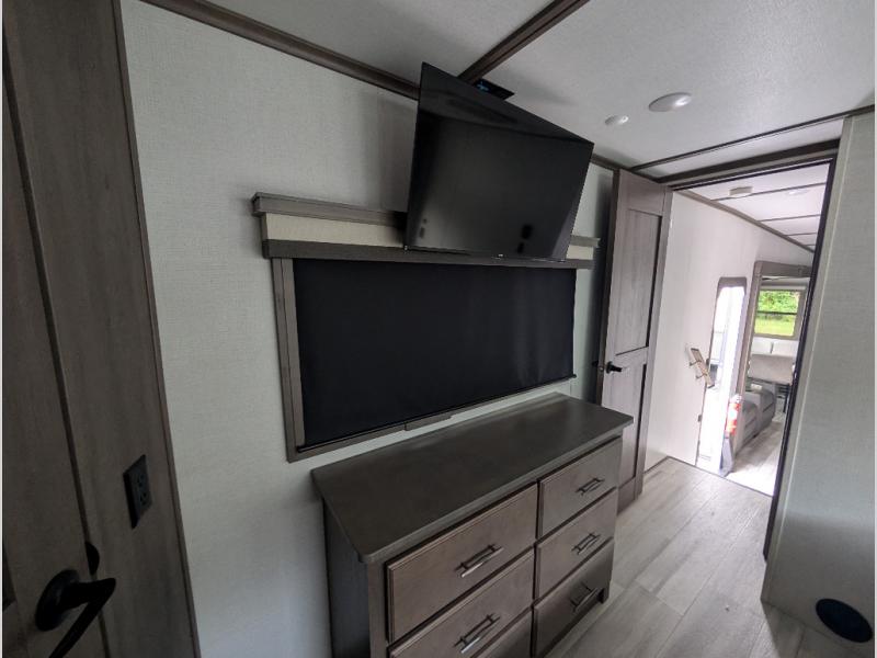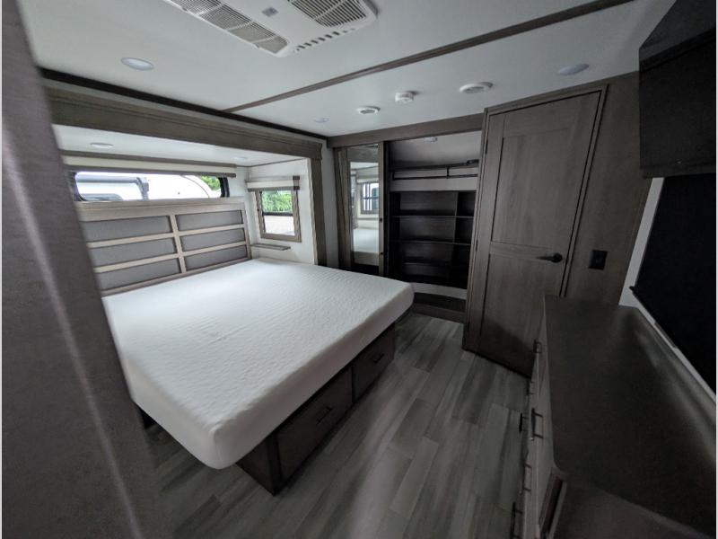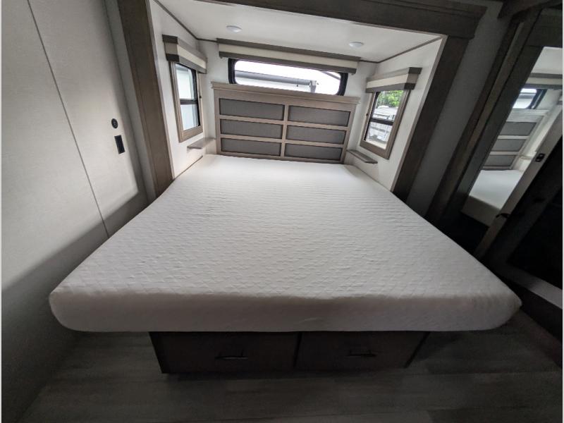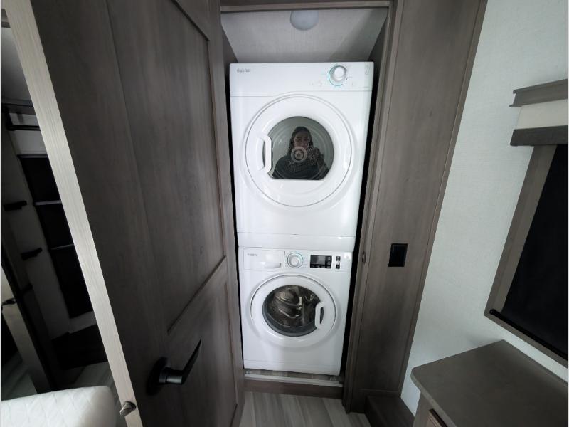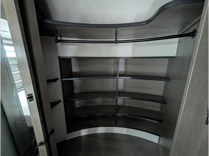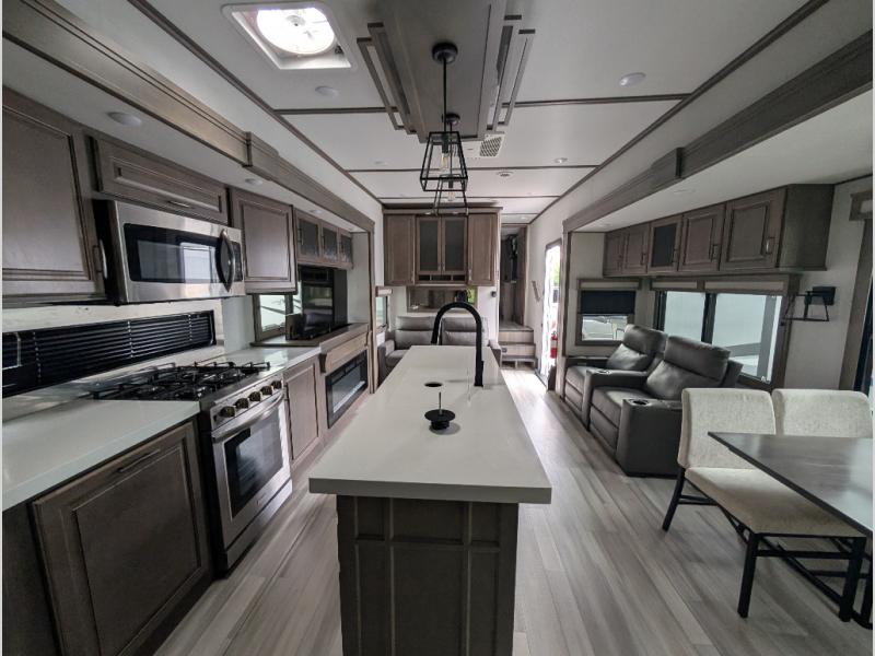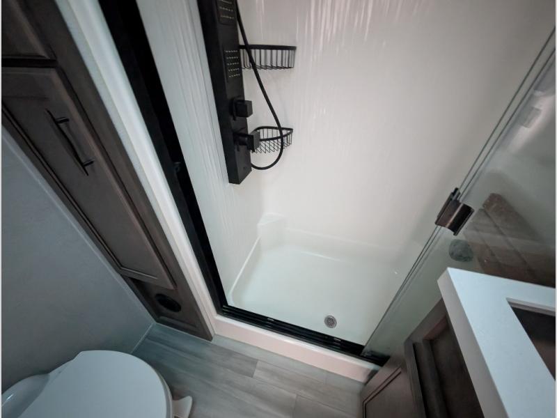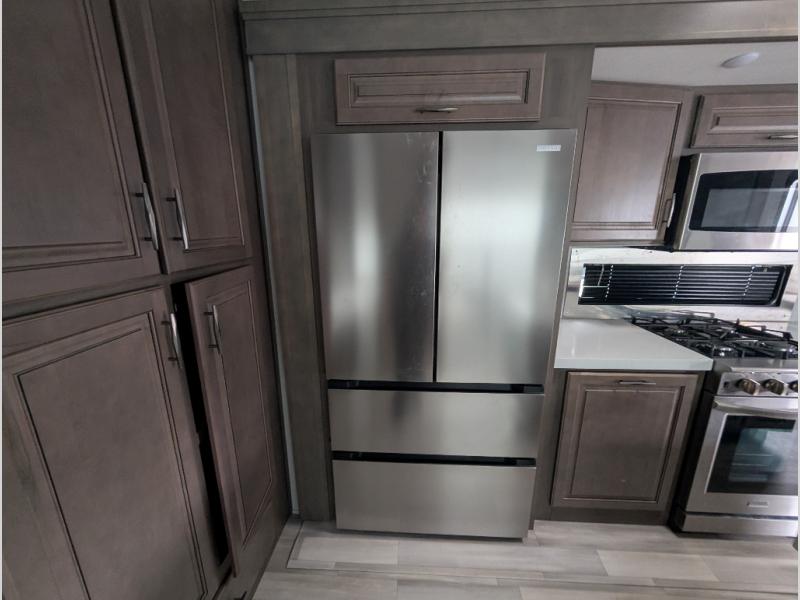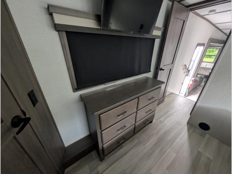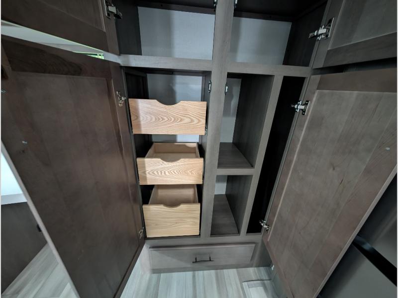 Love for traveling is enhanced when you are towing this fifth wheel. From the smooth tow to the comfortable and functional interior, you will feel right at home. You can even work at the rear desk with USB charging outlet and overhead cabinets or at the free-standing dinette with chairs while away, and relax on the theatre seats or the tri-fold sofa. The TV and fireplace add conveniences and comfort, and the kitchen is impressive with a 24" residential oven, island with a space for a dishwasher option, and oversized pantry. And you might like to add the exterior pull-out kitchen option for more choices when making meals. Be sure to place your shoes under the interior steps before heading to the full bathroom to get cleaned up or the front bedroom. The bedroom features a queen bed slide, or optional king, more USB charging outlets for your electronics, and a walk-in closet with mirrors plus a space prepped for an optional washer/dryer. You will also find a flip-top dresser with an LED TV.