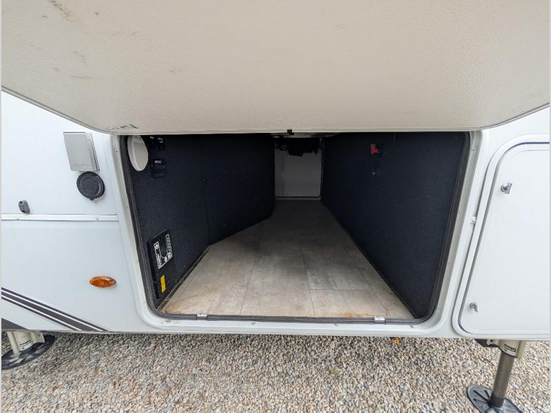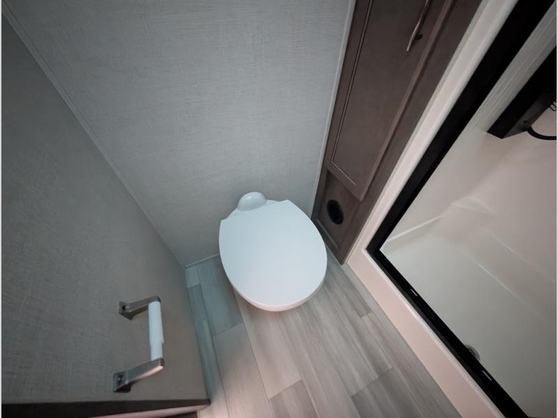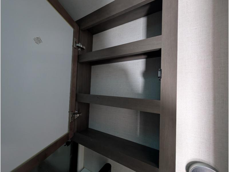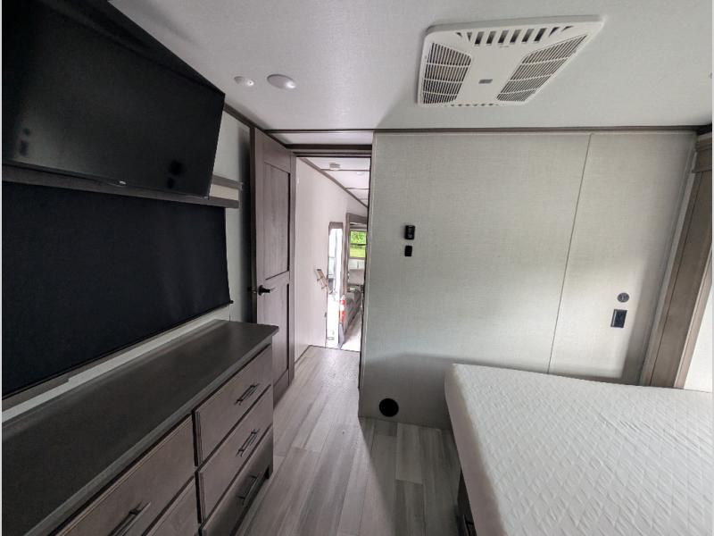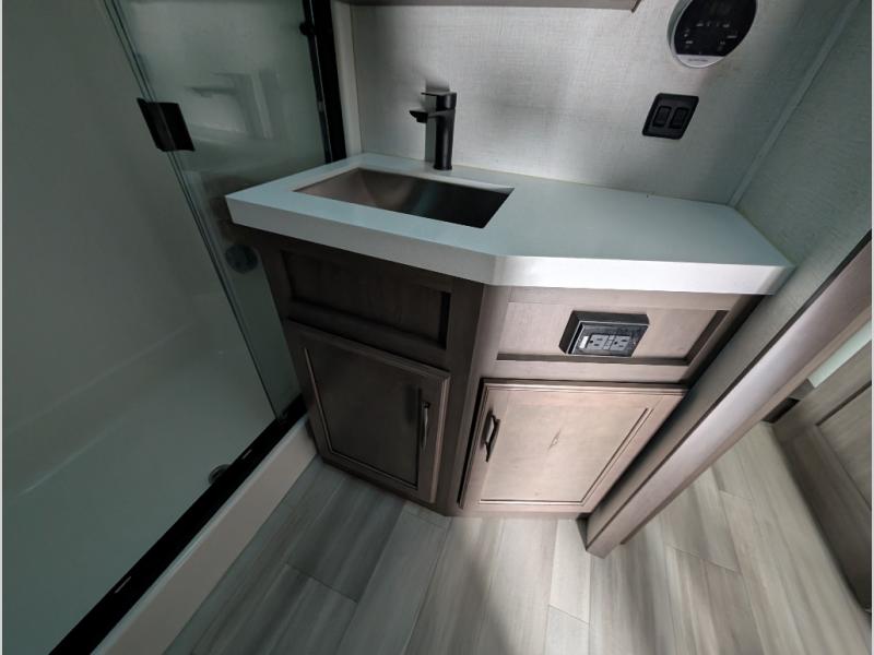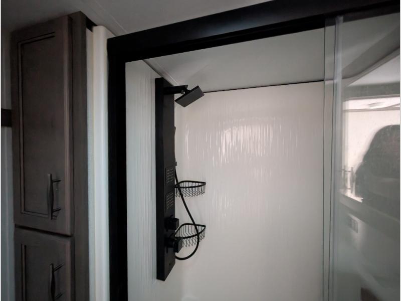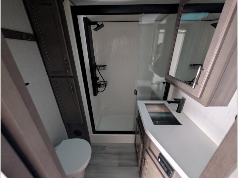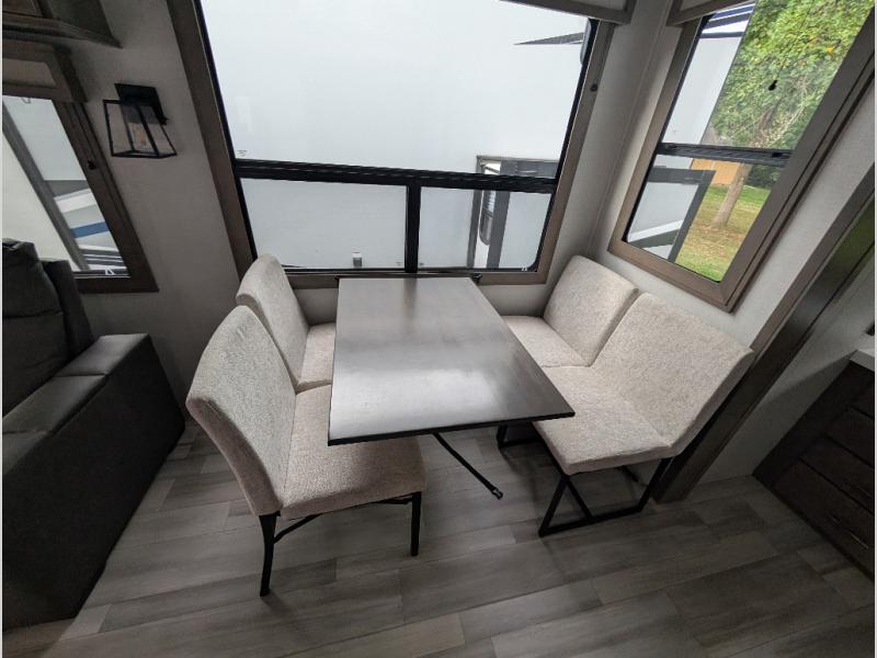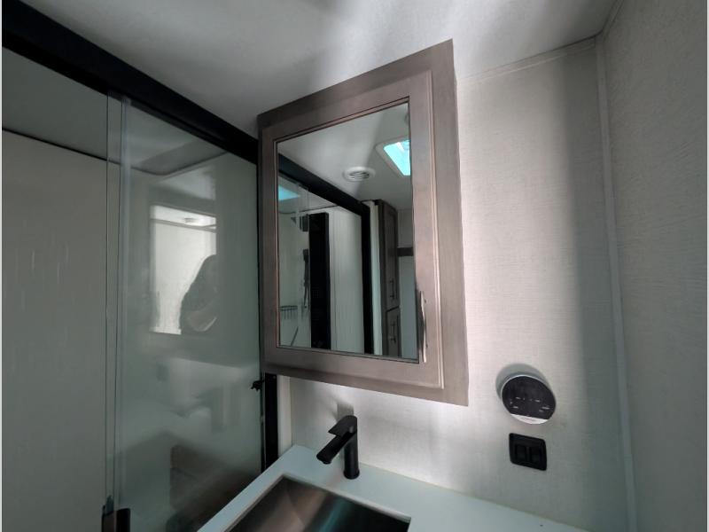 Love for traveling is enhanced when you are towing this fifth wheel. From the smooth tow to the comfortable and functional interior, you will feel right at home. You can even work at the rear desk with USB charging outlet and overhead cabinets or at the free-standing dinette with chairs while away, and relax on the theatre seats or the tri-fold sofa. The TV and fireplace add conveniences and comfort, and the kitchen is impressive with a 24" residential oven, island with a space for a dishwasher option, and oversized pantry. And you might like to add the exterior pull-out kitchen option for more choices when making meals. Be sure to place your shoes under the interior steps before heading to the full bathroom to get cleaned up or the front bedroom. The bedroom features a queen bed slide, or optional king, more USB charging outlets for your electronics, and a walk-in closet with mirrors plus a space prepped for an optional washer/dryer. You will also find a flip-top dresser with an LED TV.