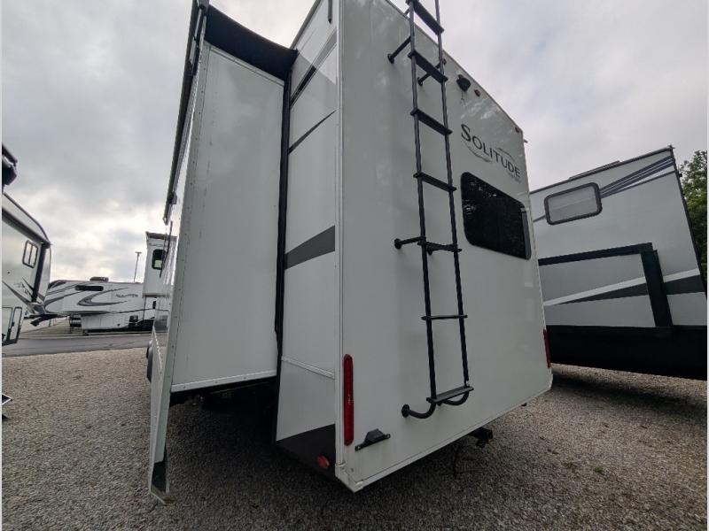 Each Solitude fifth wheel by Grand Design features a 101" wide-body construction, heavy duty 7,000 lb. axles, frameless tinted windows, and high-gloss gel coat sidewalls. You can camp year around thanks to the Weather-Tek Package that includes a 35K BTU high-capacity furnace, an all-in-one enclosed and heated utility center, and a fully enclosed underbelly with heated tanks and storage. Inside, you'll love the premium roller shades, hardwood cabinet doors, solid surface countertops and sinks, plus residential finishes throughout to make you truly feel at home. Each model also includes a MORryde CRE3000 suspension system, self adjusting brakes, and a MORryde pin box that will provide smooth towing from home to campground. Affordable luxury is possible with the Solitude fifth wheels; choose yours today!