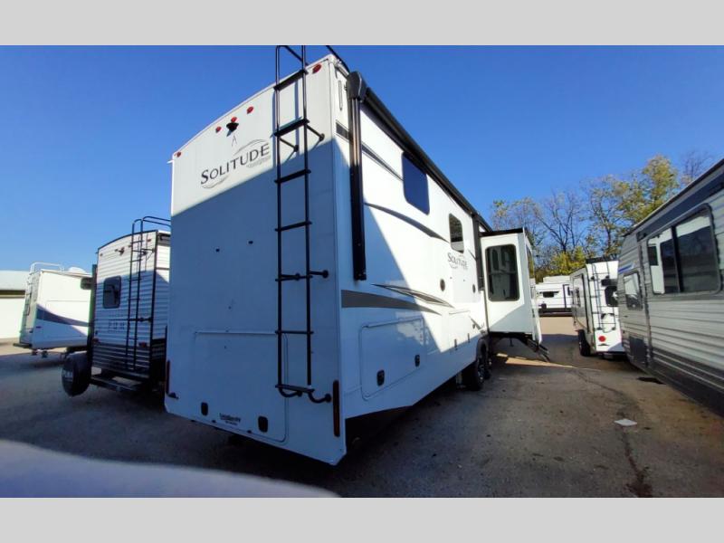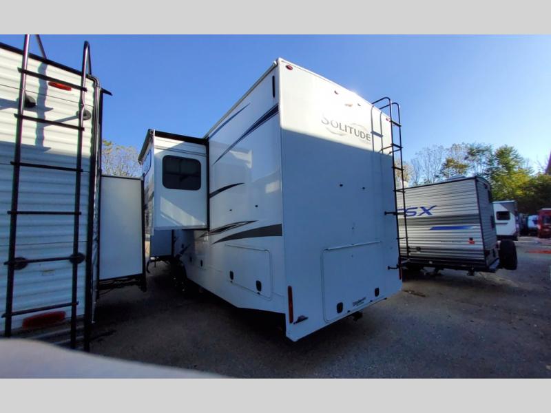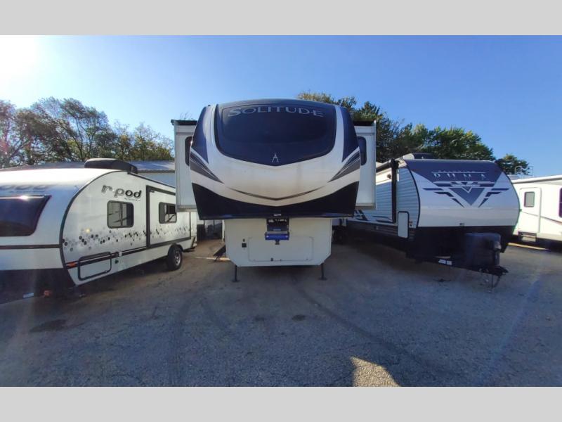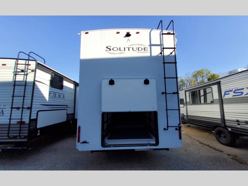 Each Solitude fifth wheel by Grand Design features a 101" wide-body construction, heavy duty 7,000 lb. axles, frameless tinted windows, and high-gloss gel coat sidewalls. You can camp year around thanks to the Weather-Tek Package that includes a 35K BTU high-capacity furnace, an all-in-one enclosed and heated utility center, and a fully enclosed underbelly with heated tanks and storage. Inside, you'll love the premium roller shades, hardwood cabinet doors, solid surface countertops and sinks, plus residential finishes throughout to make you truly feel at home. Each model also includes a MORryde CRE3000 suspension system, self adjusting brakes, and a MORryde pin box that will provide smooth towing from home to campground. Affordable luxury is possible with the Solitude fifth wheels; choose yours today!