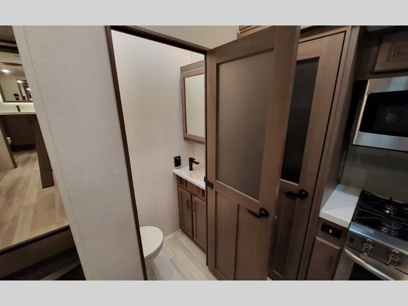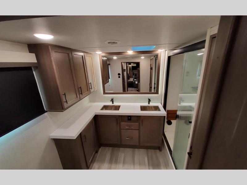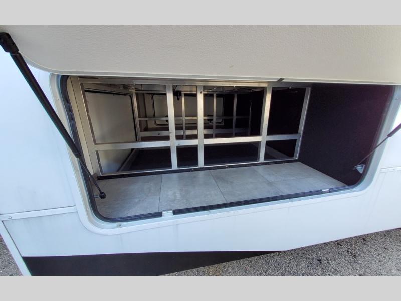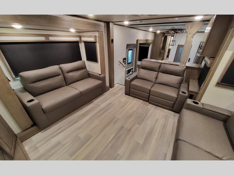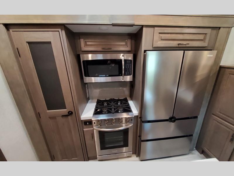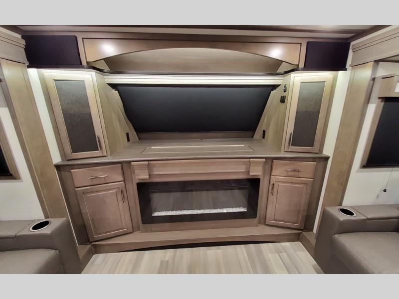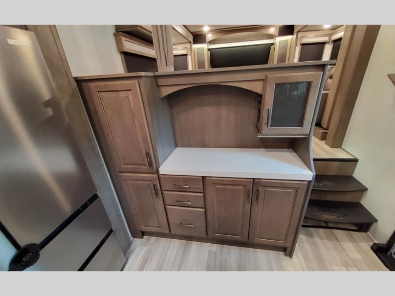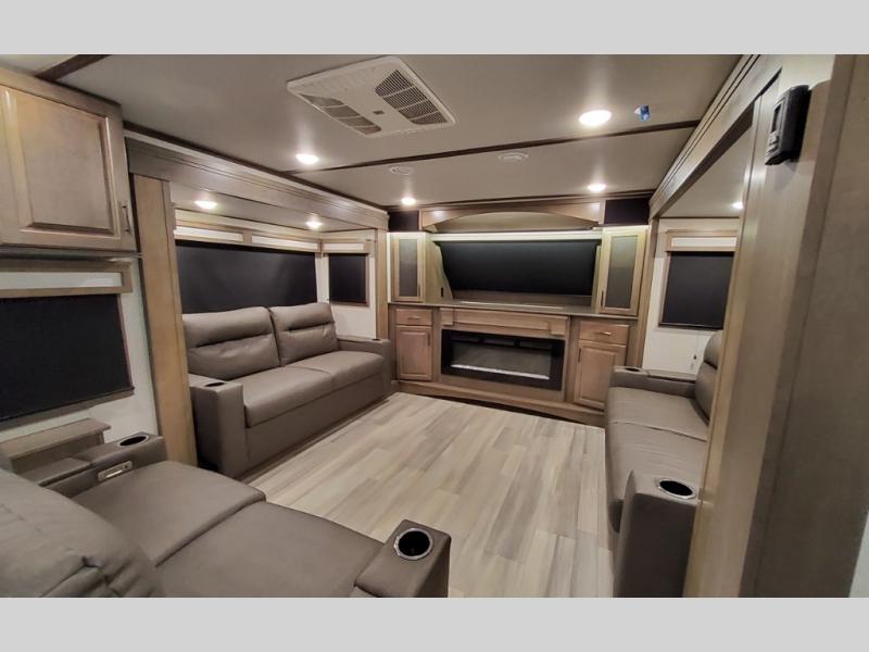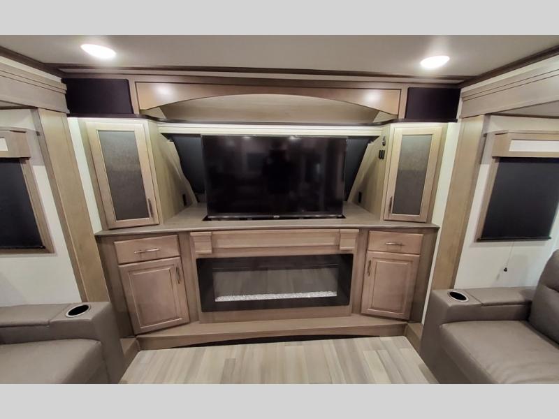Five slide outs, a full bathroom with dual sinks, a half bath off of the kitchen, and a separate front living room and entertainment area are a few reasons you will enjoy your time spent in this fifth wheel! The separate kitchen is a dream with stainless steel appliances including a 24" residential oven, a pantry and hutch with counter space, a kitchen island plus a free-standing dinette slide with windows for great views. The entertainment center offers an LED Smart TV with a fireplace below and storage, and the dual opposing tri-fold sofas provide added sleeping space at night. The master bedroom includes a queen bed, LED TV and storage, plus space savings sliding doors that lead you to the rear full bathroom with dual sinks, linen storage, and space prepped for a washer/dryer option. You will find more storage throughout the fifth wheel in the overhead cabinets, the entry closet, and even your shoes have a spot under the interior steps leading to the front living/entertainment room. The exterior has several storage choices as well including a pass-through compartment for fishing poles and such, plus the unique sliding tray in the rear allows you to bring along larger items such as camping tables, portable grills, golf clubs, totes and more.