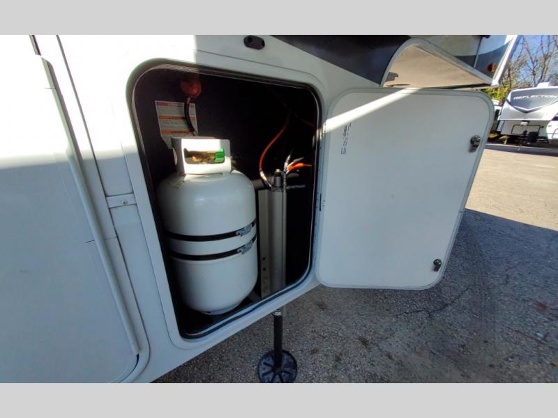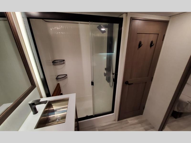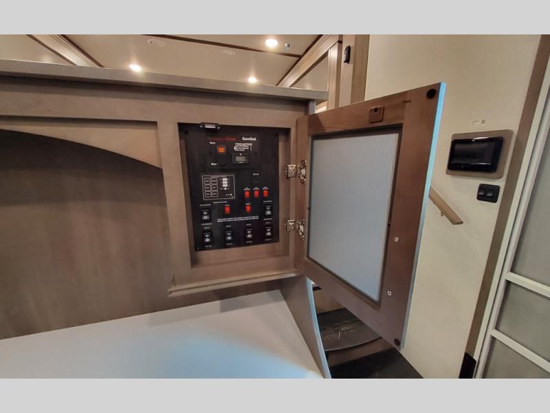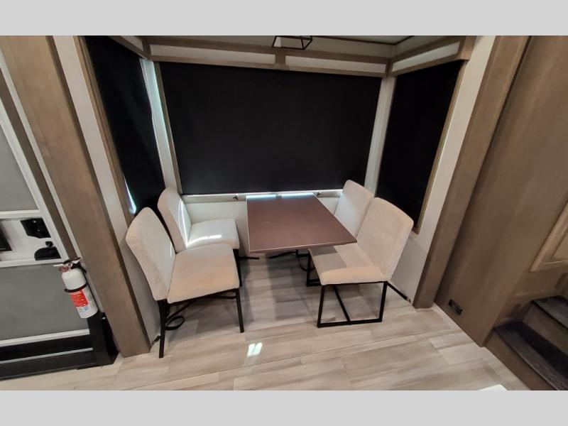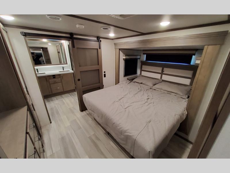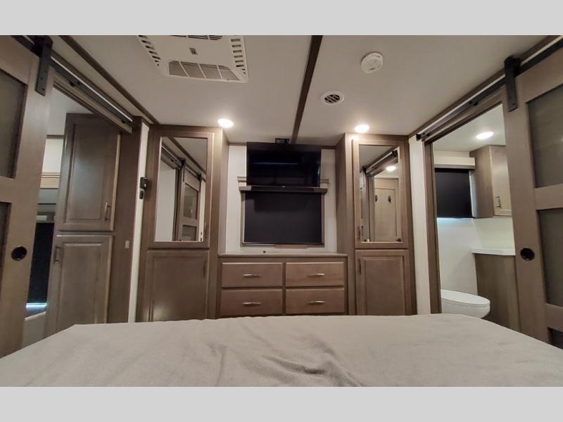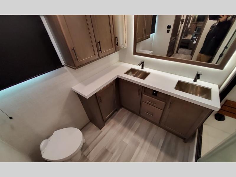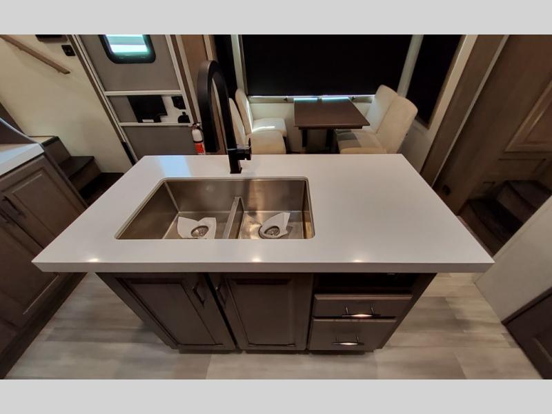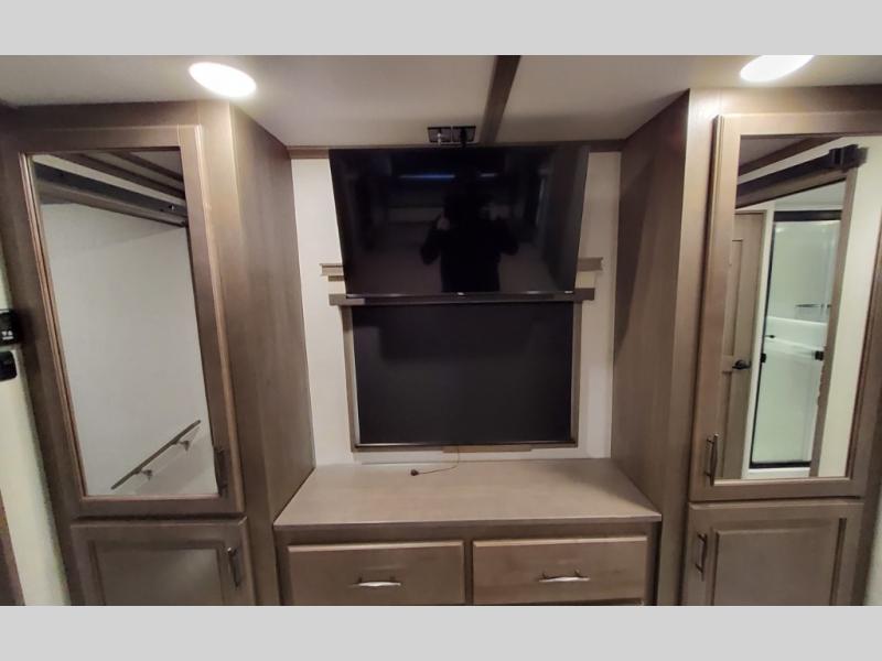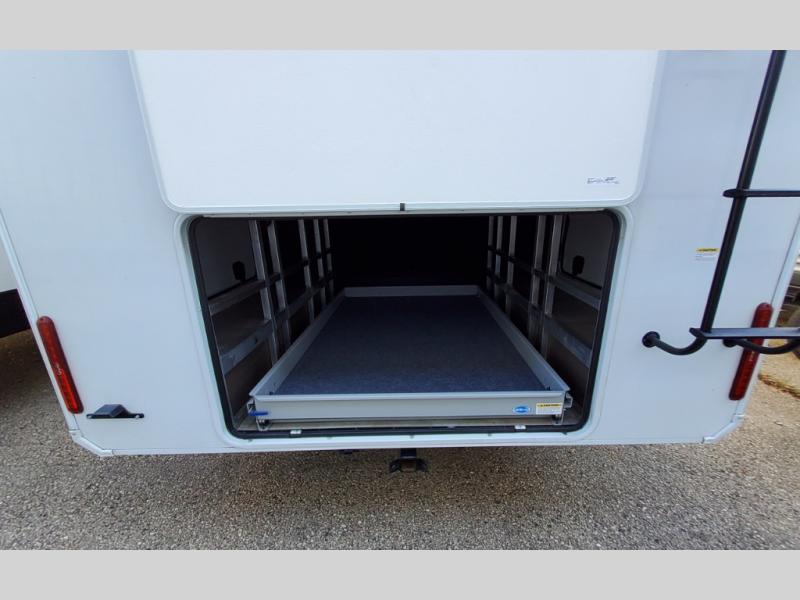 Five slide outs, a full bathroom with dual sinks, a half bath off of the kitchen, and a separate front living room and entertainment area are a few reasons you will enjoy your time spent in this fifth wheel! The separate kitchen is a dream with stainless steel appliances including a 24" residential oven, a pantry and hutch with counter space, a kitchen island plus a free-standing dinette slide with windows for great views. The entertainment center offers an LED Smart TV with a fireplace below and storage, and the dual opposing tri-fold sofas provide added sleeping space at night. The master bedroom includes a queen bed, LED TV and storage, plus space savings sliding doors that lead you to the rear full bathroom with dual sinks, linen storage, and space prepped for a washer/dryer option. You will find more storage throughout the fifth wheel in the overhead cabinets, the entry closet, and even your shoes have a spot under the interior steps leading to the front living/entertainment room. The exterior has several storage choices as well including a pass-through compartment for fishing poles and such, plus the unique sliding tray in the rear allows you to bring along larger items such as camping tables, portable grills, golf clubs, totes and more.