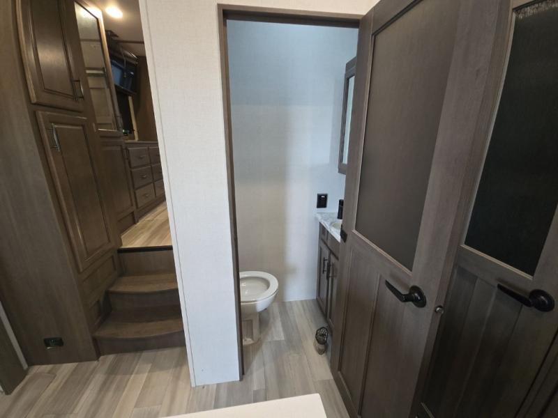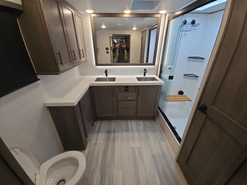 Five slide outs, a full bathroom with dual sinks, a half bath off of the kitchen and a separate front living and entertainment area are a few reasons you will enjoy your time spent in this fifth wheel! And the separate kitchen is a dream with the stainless steel appliances including a 24" residential oven, an oversized pantry, a hutch with counter space, a kitchen island plus a free-standing dinette slide with windows for great views. The entertainment center offers an LED Smart TV with fireplace below and storage, and the dual opposing tri-fold sofas provide sleeping space and you will love the theatre seats in this separate area. The walk-through bedroom includes a queen bed, LED TV and storage, plus space savings sliding doors that lead you to the rear full bathroom with dual sinks, linen storage and space prepped for a washer/dryer option, plus a shower with a seat. You will find more storage throughout the fifth wheel in the overhead cabinets, the entry closet, and under the interior steps for shoes. And the exterior has several storage choices including the pass-through compartment for fishing poles and such, plus the unique sliding tray in the rear allows you to bring along the larger items such as camping tables, portable grills, golf clubs, totes and such.