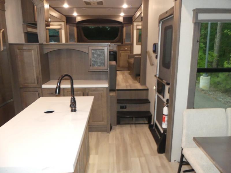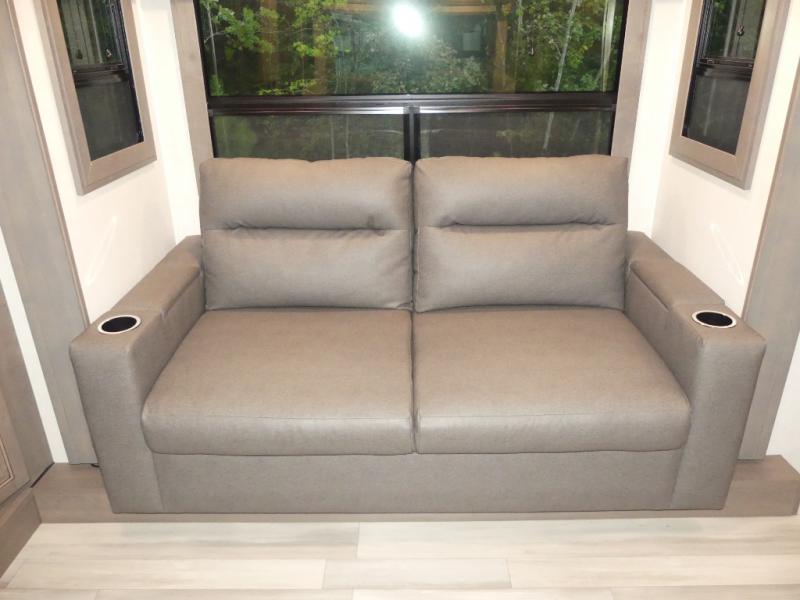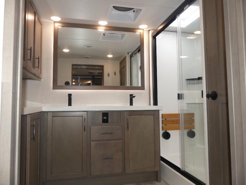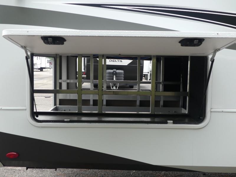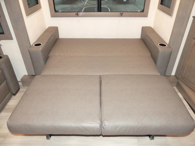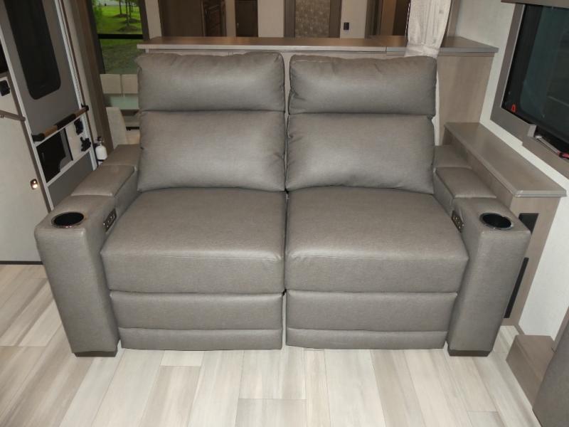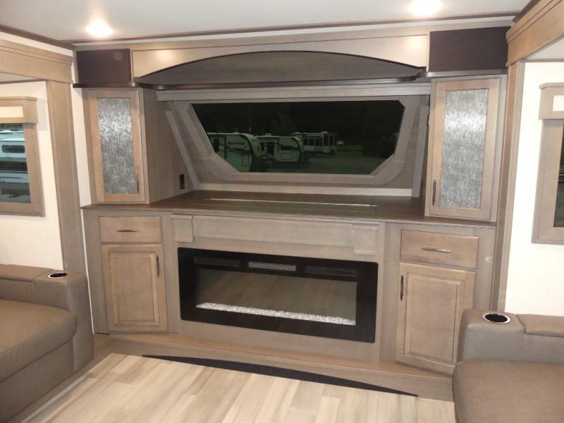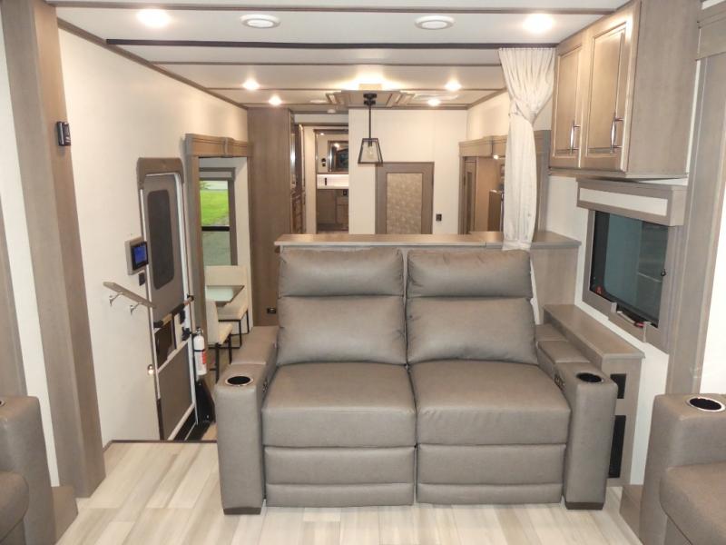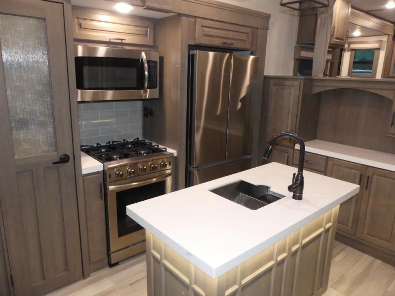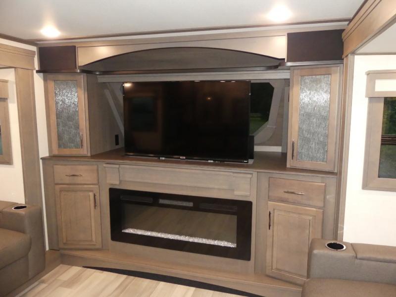 Five slide outs, a full bathroom with dual sinks, a half bath off of the kitchen and a separate front living and entertainment area are a few reasons you will enjoy your time spent in this fifth wheel! And the separate kitchen is a dream with the stainless steel appliances including a 24" residential oven, an oversized pantry, a hutch with counter space, a kitchen island plus a free-standing dinette slide with windows for great views. The entertainment center offers an LED Smart TV with fireplace below and storage, and the dual opposing tri-fold sofas provide sleeping space and you will love the theatre seats in this separate area. The walk-through bedroom includes a king bed, LED TV and storage, plus space savings sliding doors that lead you to the rear full bathroom with dual sinks, linen storage and space prepped for a washer/dryer, plus a shower with a seat. You will find more storage throughout the fifth wheel in the overhead cabinets, the entry closet, and under the interior steps for shoes. And the exterior has several storage choices including the pass-through compartment for fishing poles and such, plus the unique sliding tray in the rear allows you to bring along the larger items such as camping tables, portable grills, golf clubs, totes and such.