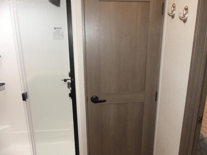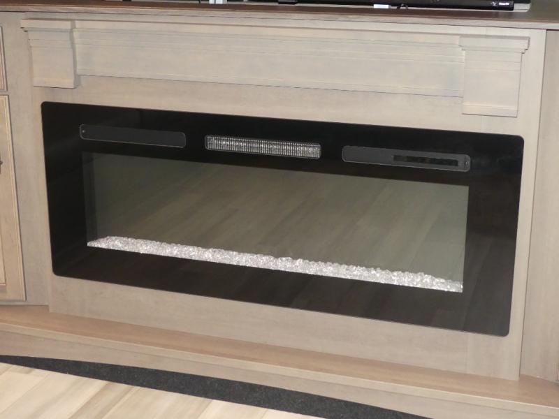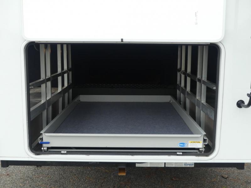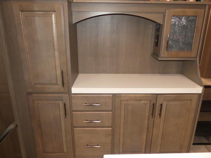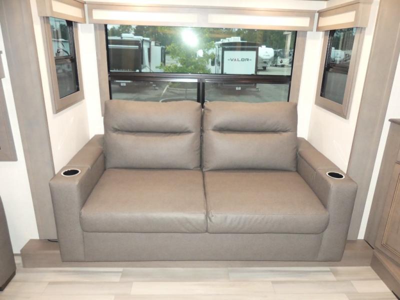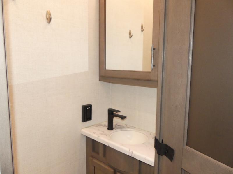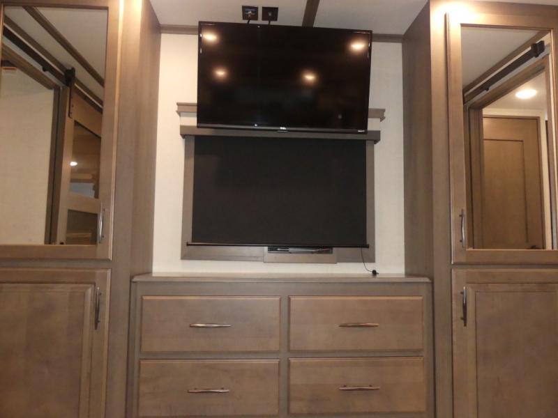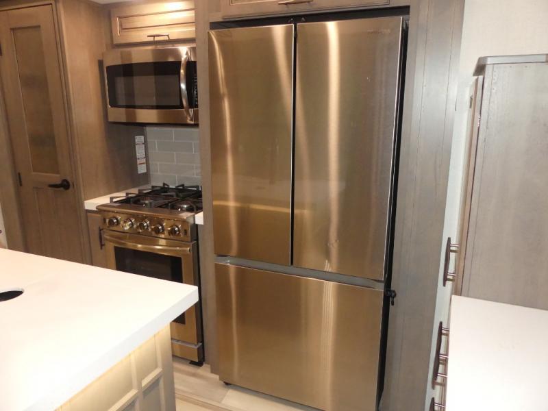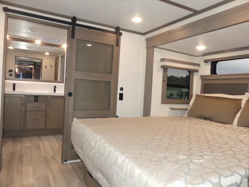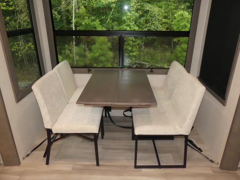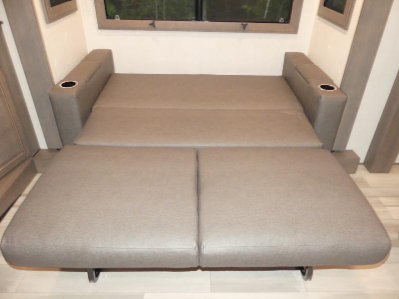 Five slide outs, a full bathroom with dual sinks, a half bath off of the kitchen and a separate front living and entertainment area are a few reasons you will enjoy your time spent in this fifth wheel! And the separate kitchen is a dream with the stainless steel appliances including a 24" residential oven, an oversized pantry, a hutch with counter space, a kitchen island plus a free-standing dinette slide with windows for great views. The entertainment center offers an LED Smart TV with fireplace below and storage, and the dual opposing tri-fold sofas provide sleeping space and you will love the theatre seats in this separate area. The walk-through bedroom includes a king bed, LED TV and storage, plus space savings sliding doors that lead you to the rear full bathroom with dual sinks, linen storage and space prepped for a washer/dryer, plus a shower with a seat. You will find more storage throughout the fifth wheel in the overhead cabinets, the entry closet, and under the interior steps for shoes. And the exterior has several storage choices including the pass-through compartment for fishing poles and such, plus the unique sliding tray in the rear allows you to bring along the larger items such as camping tables, portable grills, golf clubs, totes and such.
