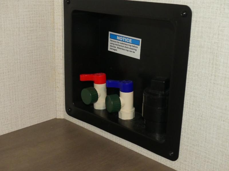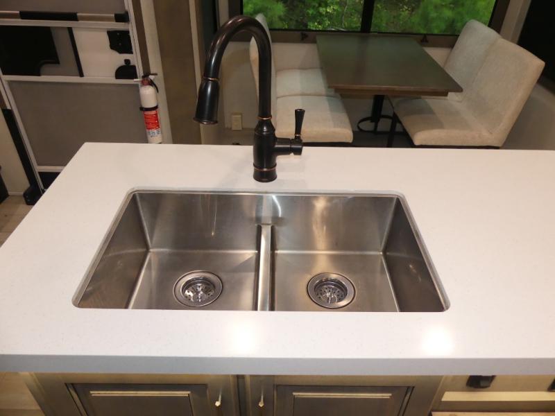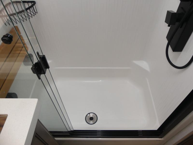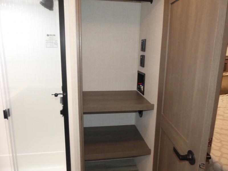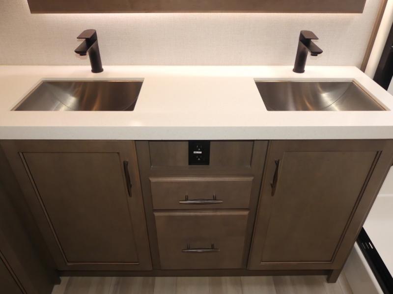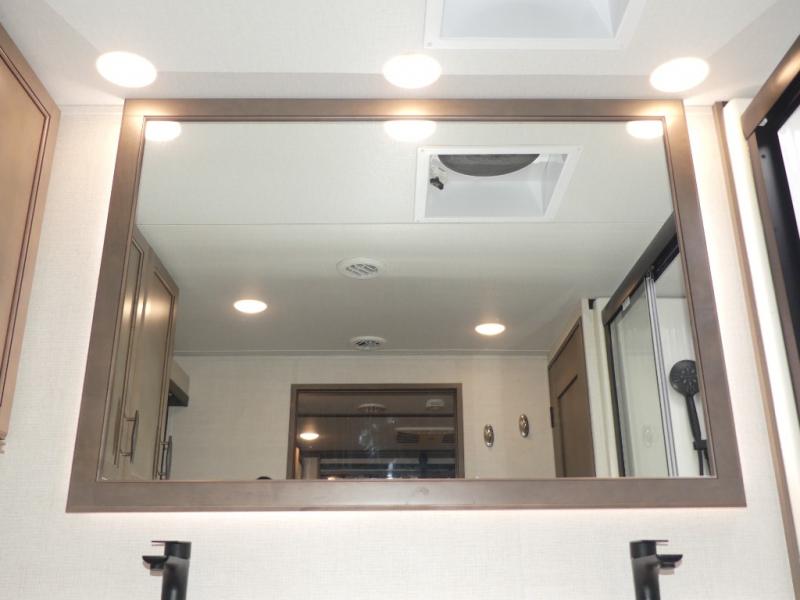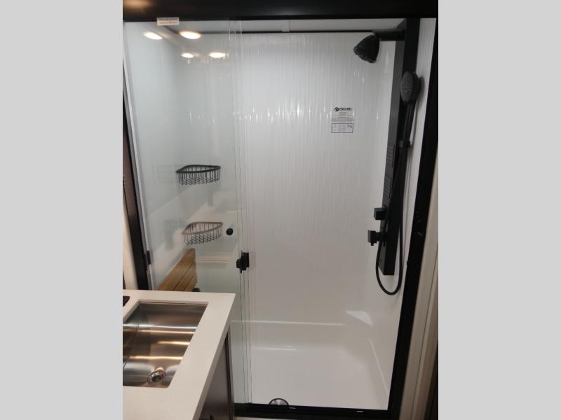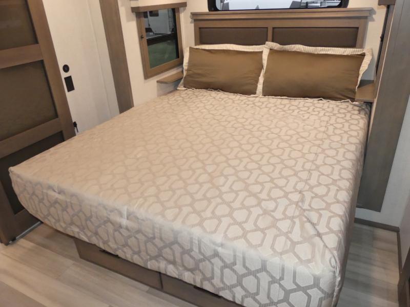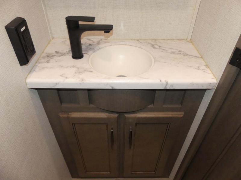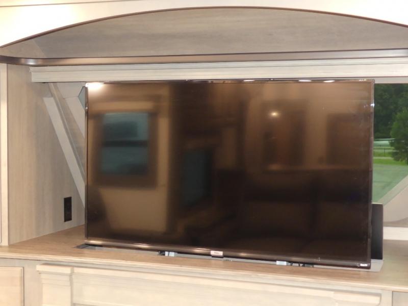 Five slide outs, a full bathroom with dual sinks, a half bath off of the kitchen and a separate front living and entertainment area are a few reasons you will enjoy your time spent in this fifth wheel! And the separate kitchen is a dream with the stainless steel appliances including a 24" residential oven, an oversized pantry, a hutch with counter space, a kitchen island plus a free-standing dinette slide with windows for great views. The entertainment center offers an LED Smart TV with fireplace below and storage, and the dual opposing tri-fold sofas provide sleeping space and you will love the theatre seats in this separate area. The walk-through bedroom includes a king bed, LED TV and storage, plus space savings sliding doors that lead you to the rear full bathroom with dual sinks, linen storage and space prepped for a washer/dryer, plus a shower with a seat. You will find more storage throughout the fifth wheel in the overhead cabinets, the entry closet, and under the interior steps for shoes. And the exterior has several storage choices including the pass-through compartment for fishing poles and such, plus the unique sliding tray in the rear allows you to bring along the larger items such as camping tables, portable grills, golf clubs, totes and such.