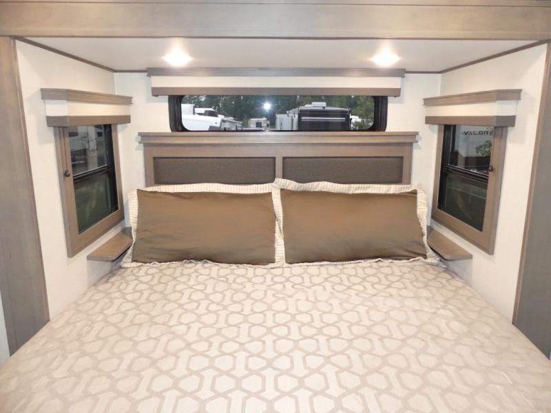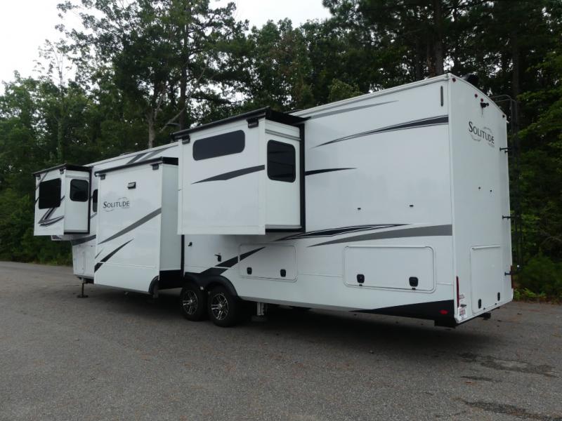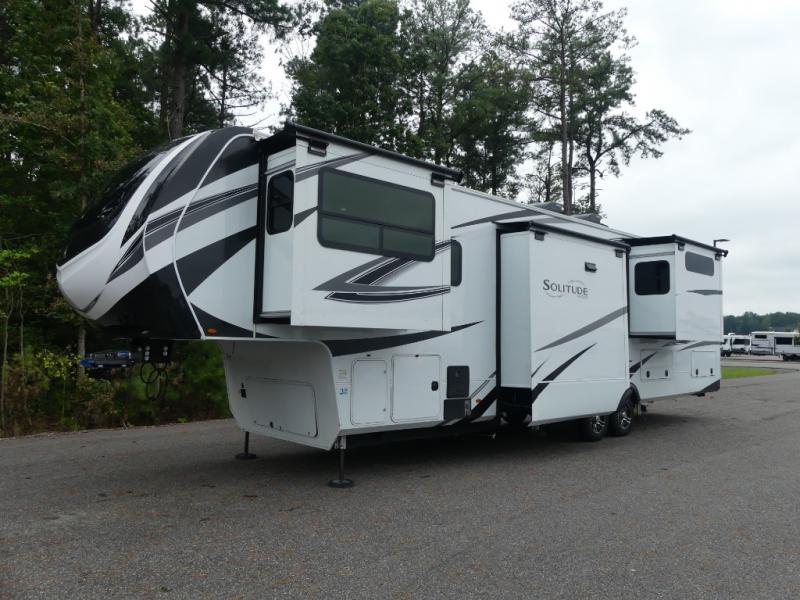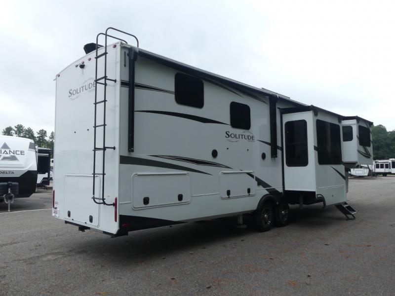Each Solitude fifth wheel by Grand Design features a 101" wide-body construction, heavy duty 7,000 lb. axles, frameless tinted windows, and high-gloss gel coat sidewalls. You can camp year around thanks to the Weather-Tek Package that includes a 35K BTU high-capacity furnace, an all-in-one enclosed and heated utility center, and a fully enclosed underbelly with heated tanks and storage. Inside, you'll love the premium roller shades, hardwood cabinet doors, solid surface countertops and sinks, plus residential finishes throughout to make you truly feel at home. Each model also includes a MORryde CRE3000 suspension system, self adjusting brakes, and a MORryde pin box that will provide smooth towing from home to campground. Affordable luxury is possible with the Solitude fifth wheels; choose yours today!