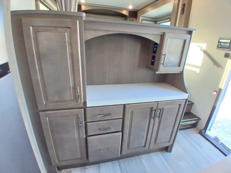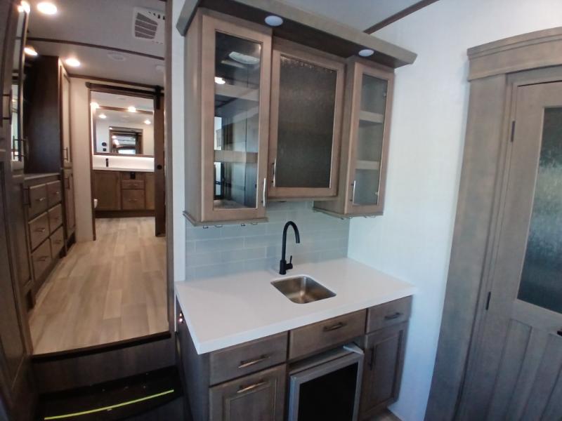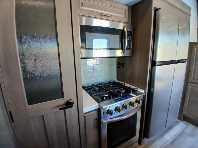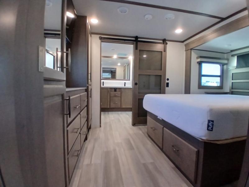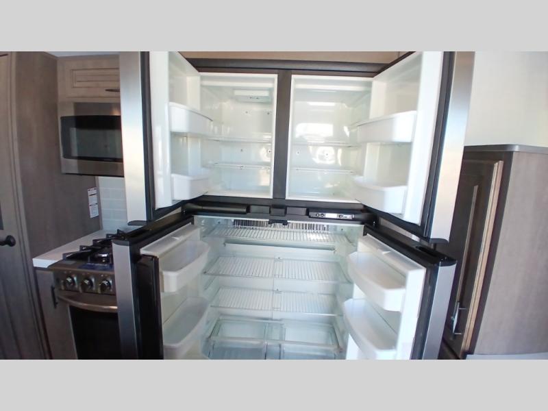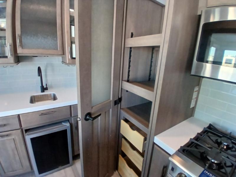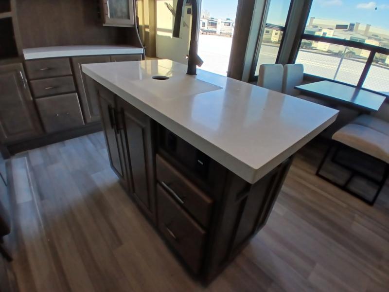 If you enjoy entertaining while camping, you will love this setup with a wet bar including a beverage cooler, a kitchen island to set snacks on, and a hutch for storing dishes plus it also provides more counter space. And, the gourmet kitchen appliances with a 24" residential oven and four-burner range along with a 20 cu. ft. refrigerator allow you to cook any meal for your family and friends. The separate front living room is spacious with dual opposing tri-fold sofa slides and theater seating, and a front wall with an LED telescoping TV and fireplace below plus storage for entertaining. There is also a curtain to close at the pony wall for privacy when friends are sleeping on the sofas. You will have your own master bedroom with a queen bed slide (or optional king), wardrobes, an LED TV, plus sliding doors that lead into the private master bath. Here you will find dual sinks, a shower with flip-down teak seat and skylight, plus a space prepped to add an optional washer/dryer which is great for when you plan to stay awhile.
